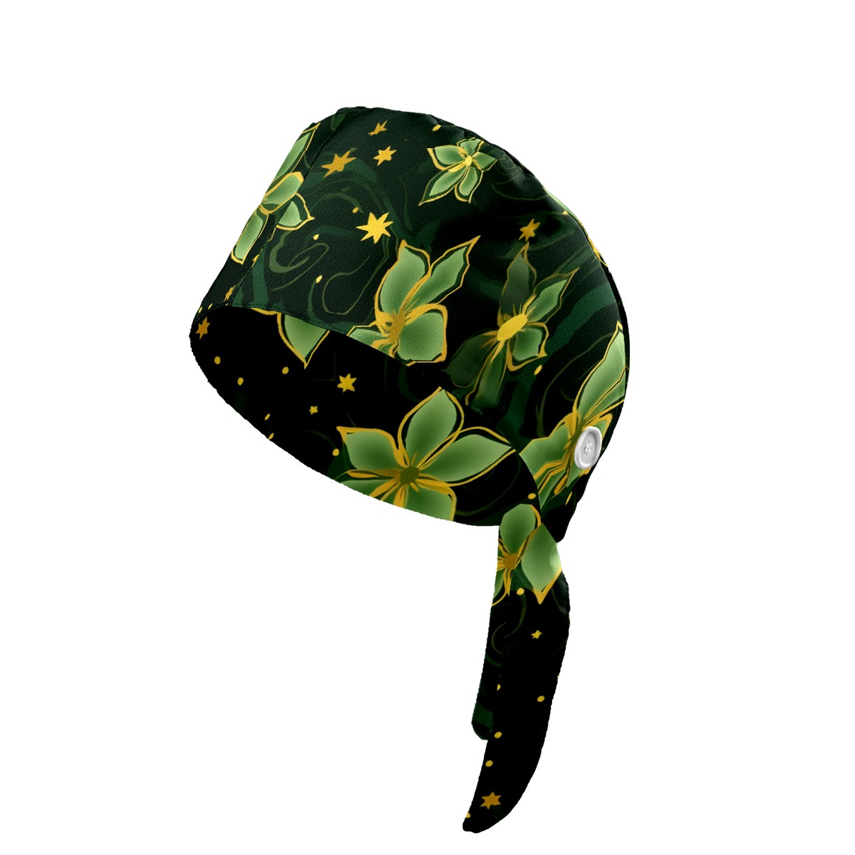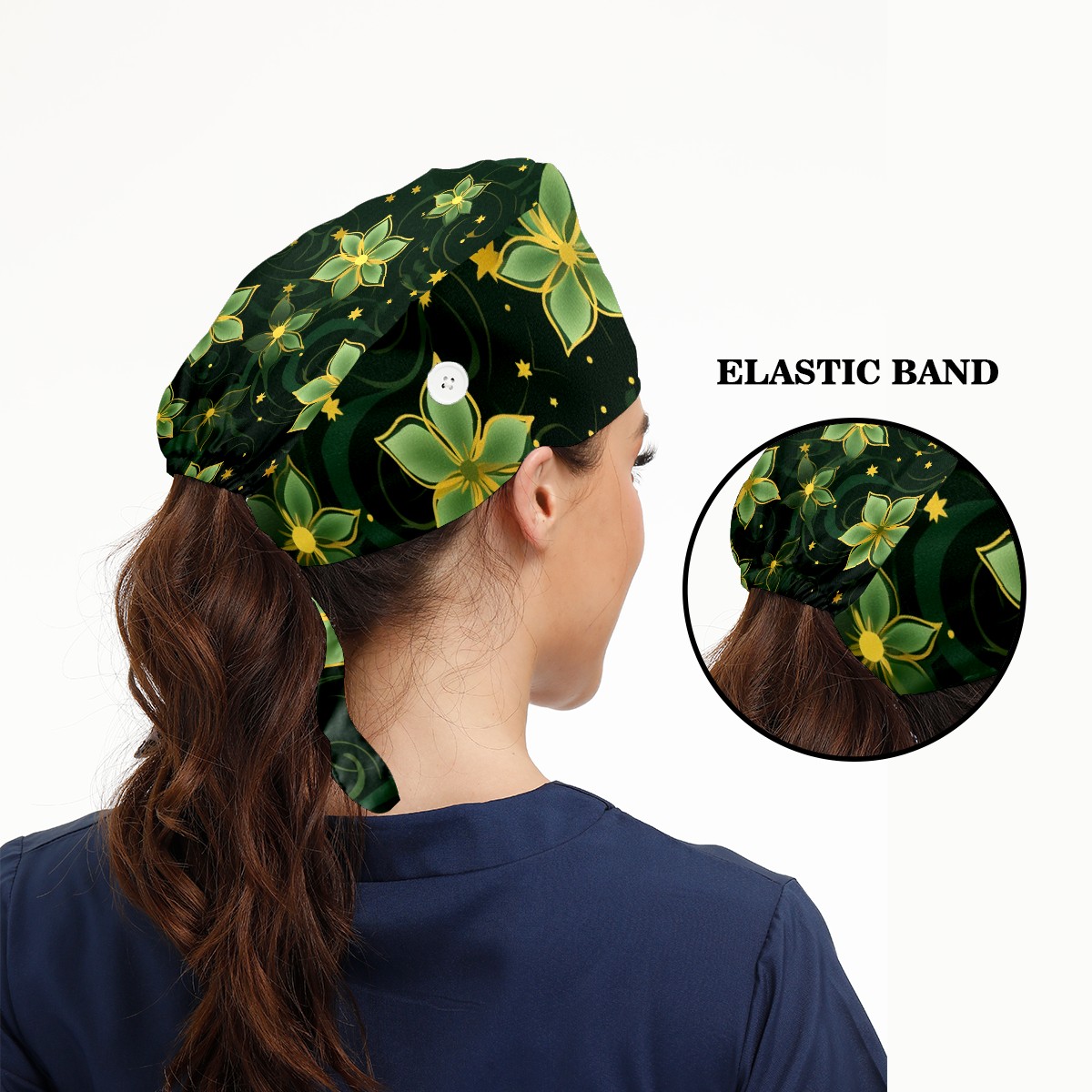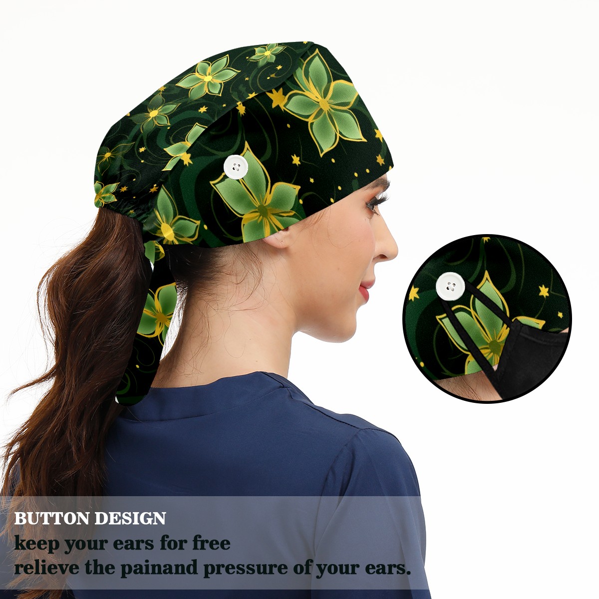 Working Caps with Button&Sweatband Satin Lined Cotton Adjustable Nurse Hats Elastic Band Scrub Cap Surgeon Hat Gold Flowers (4)