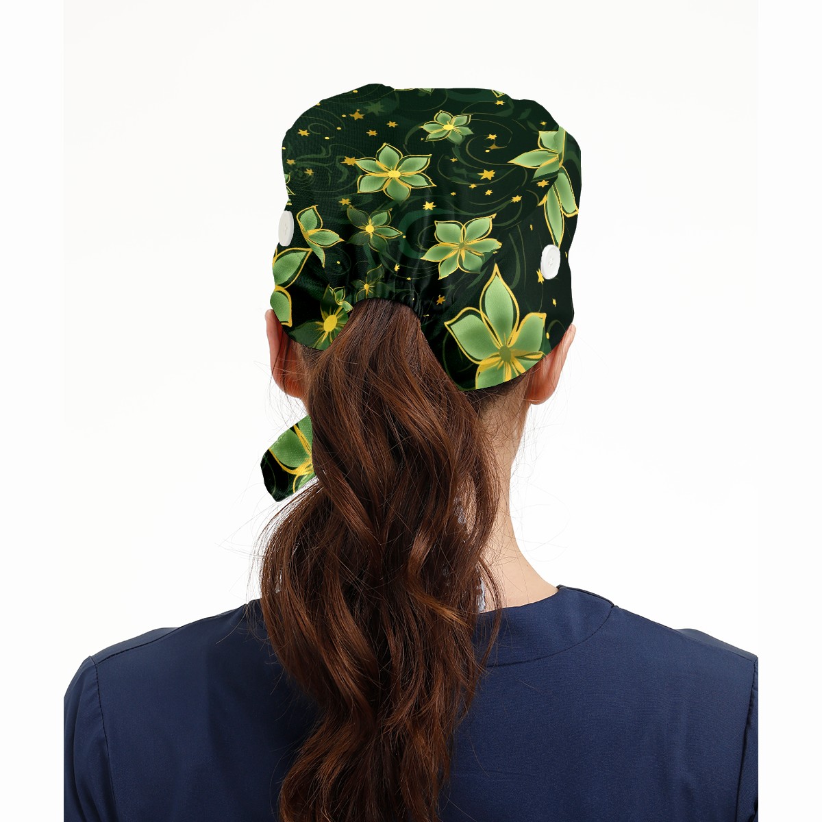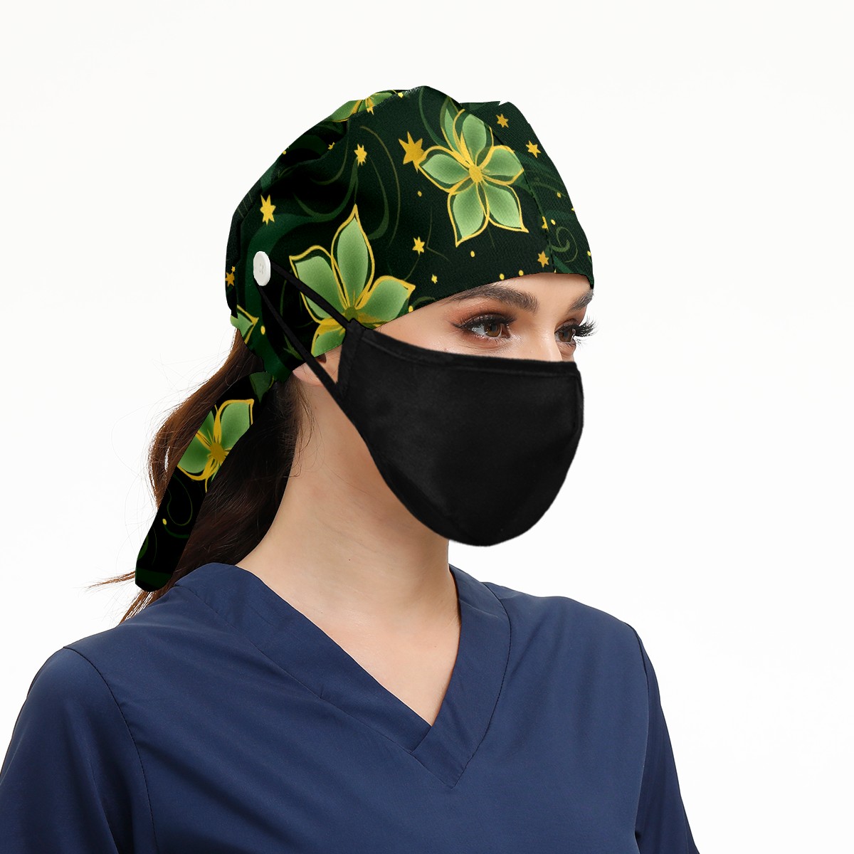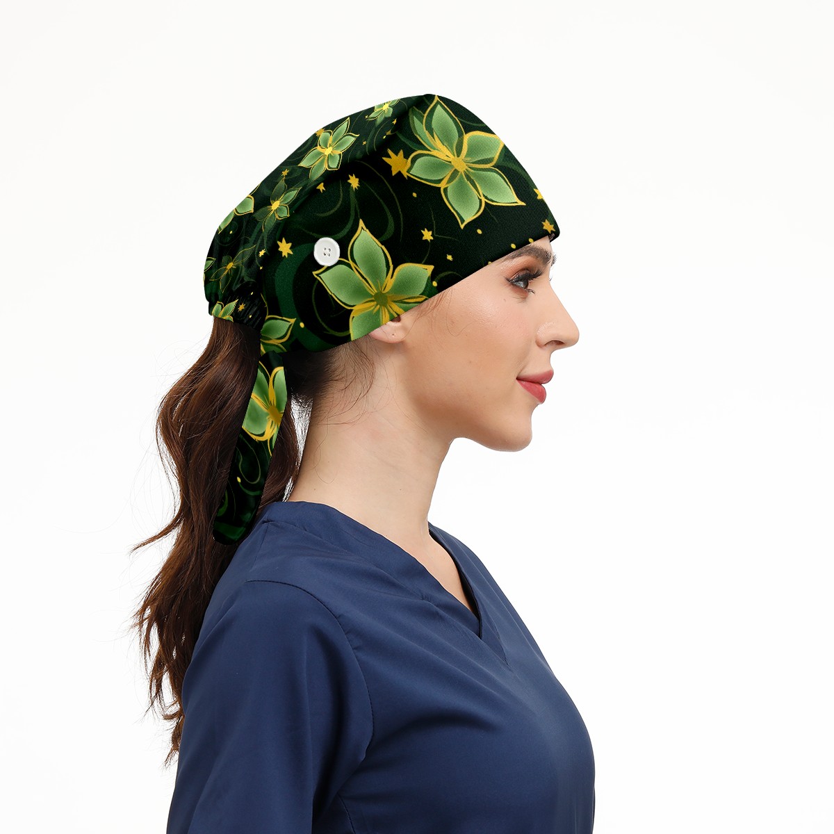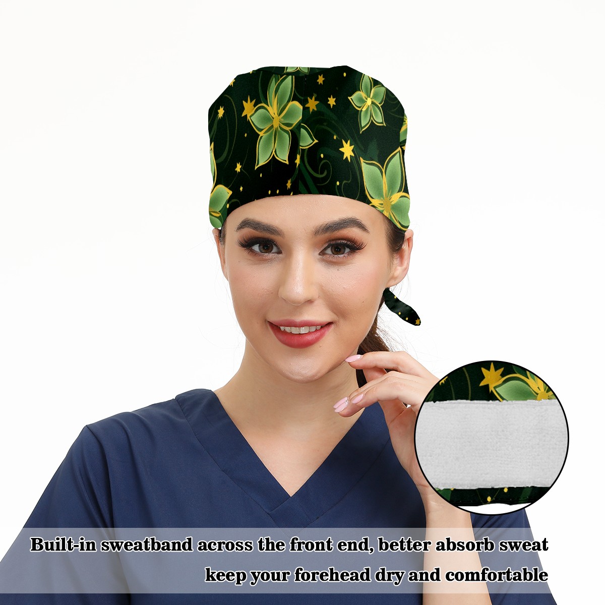 Working Caps with Button&Sweatband Satin Lined Cotton Adjustable Nurse Hats Elastic Band Scrub Cap Surgeon Hat Gold Flowers (4)