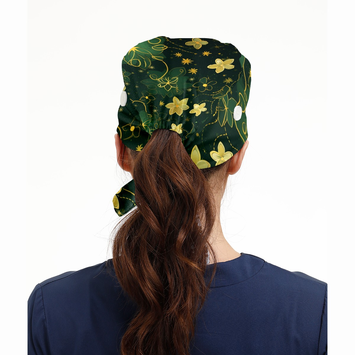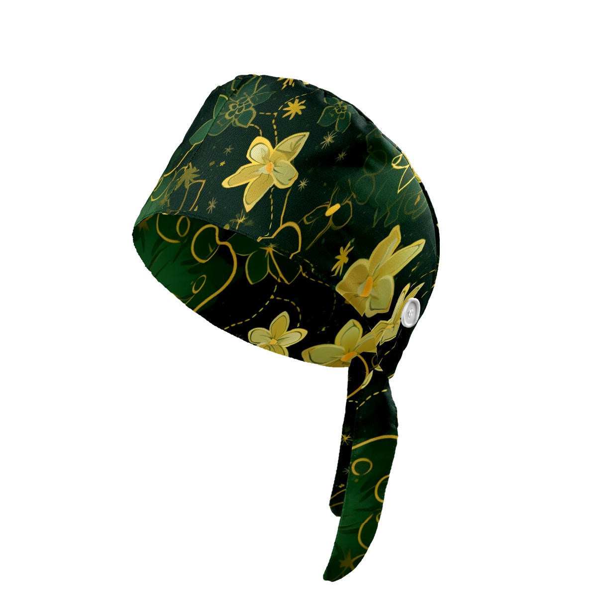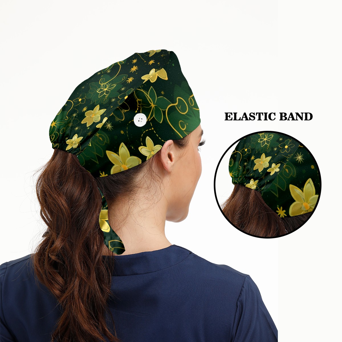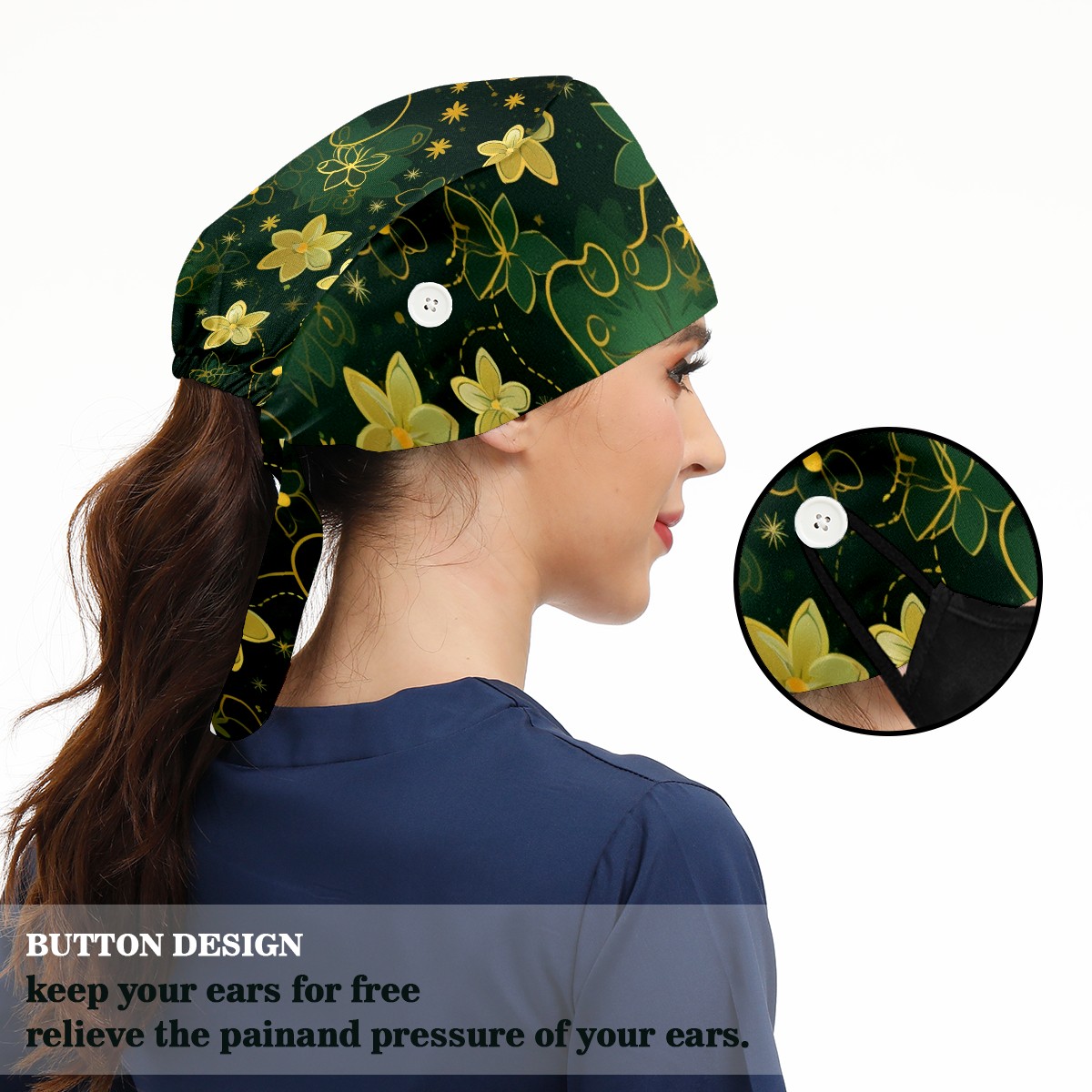 Working Caps with Button&Sweatband Satin Lined Cotton Adjustable Nurse Hats Elastic Band Scrub Cap Surgeon Hat Gold Flowers (2)