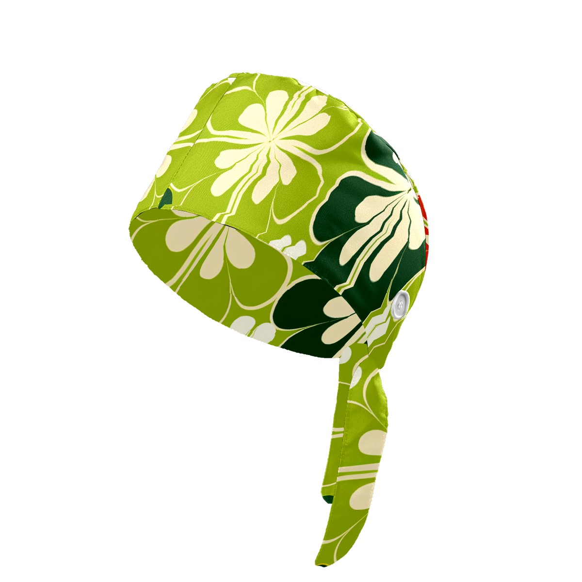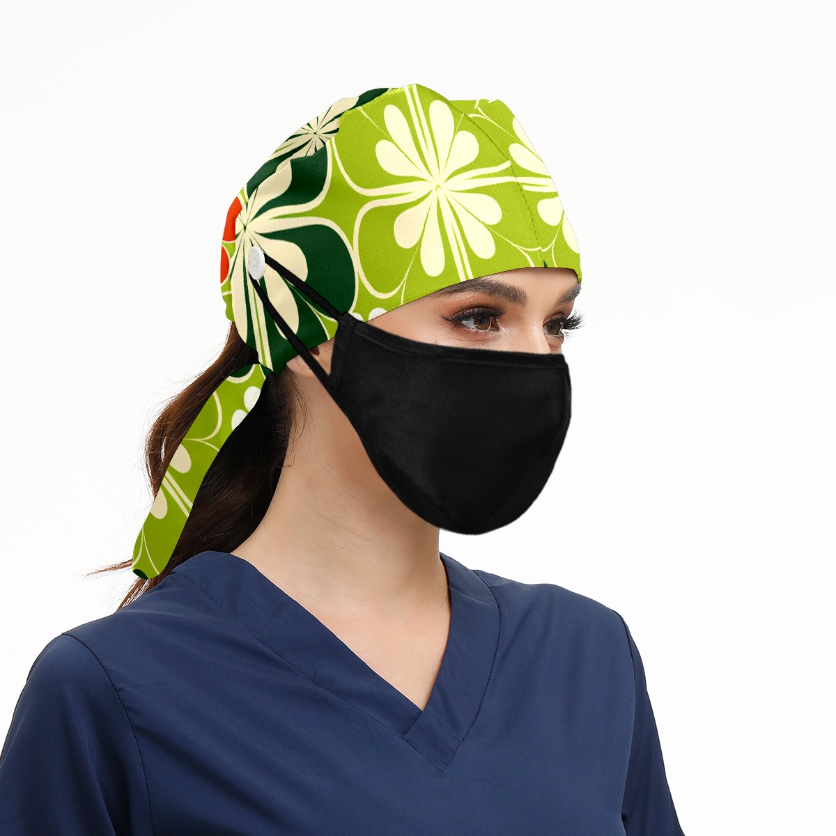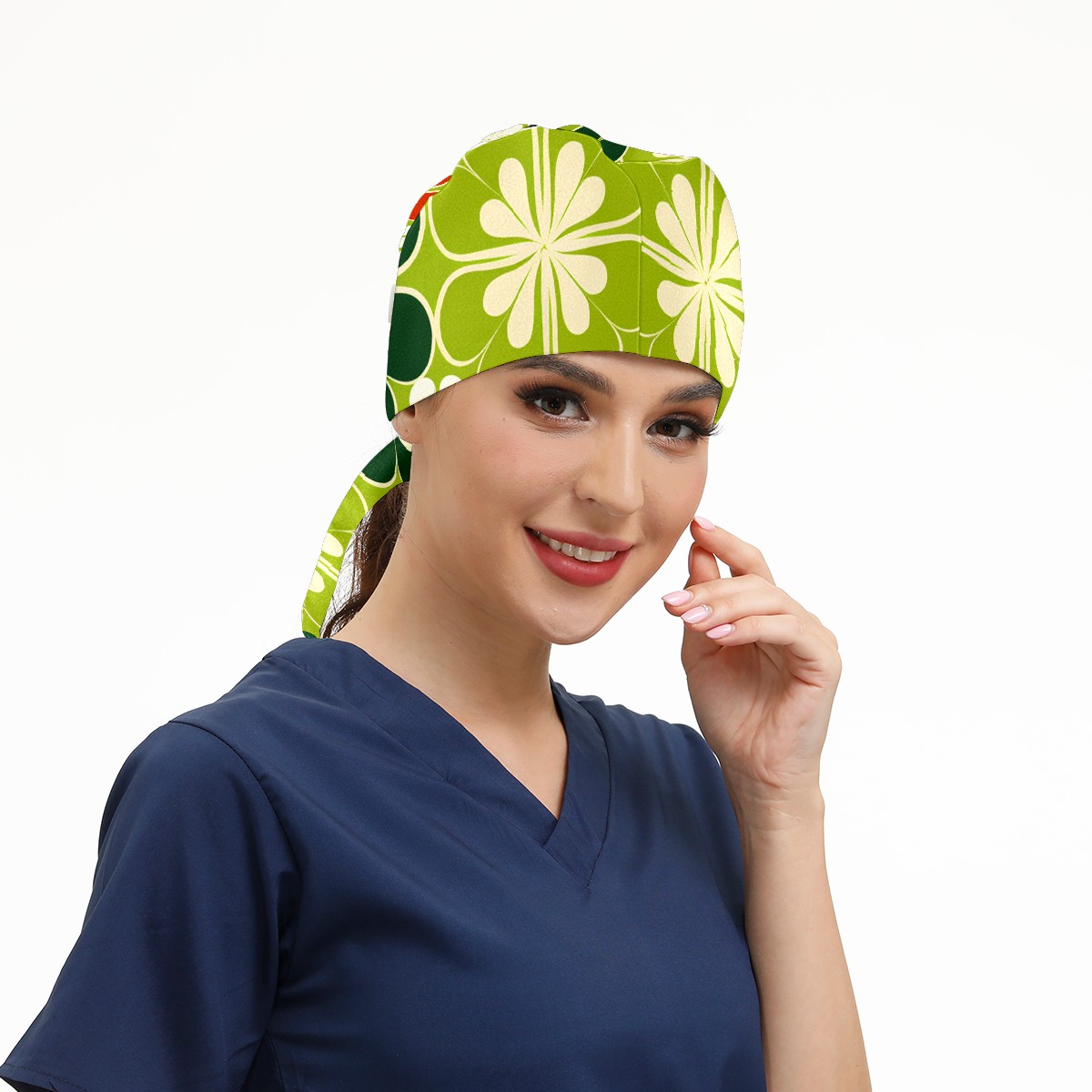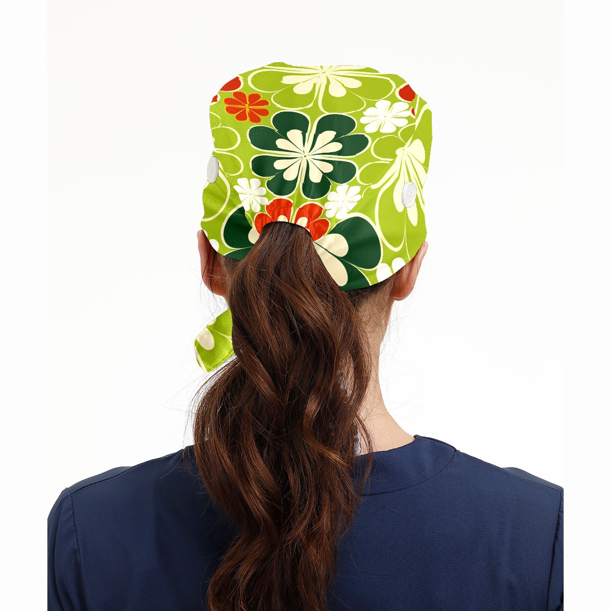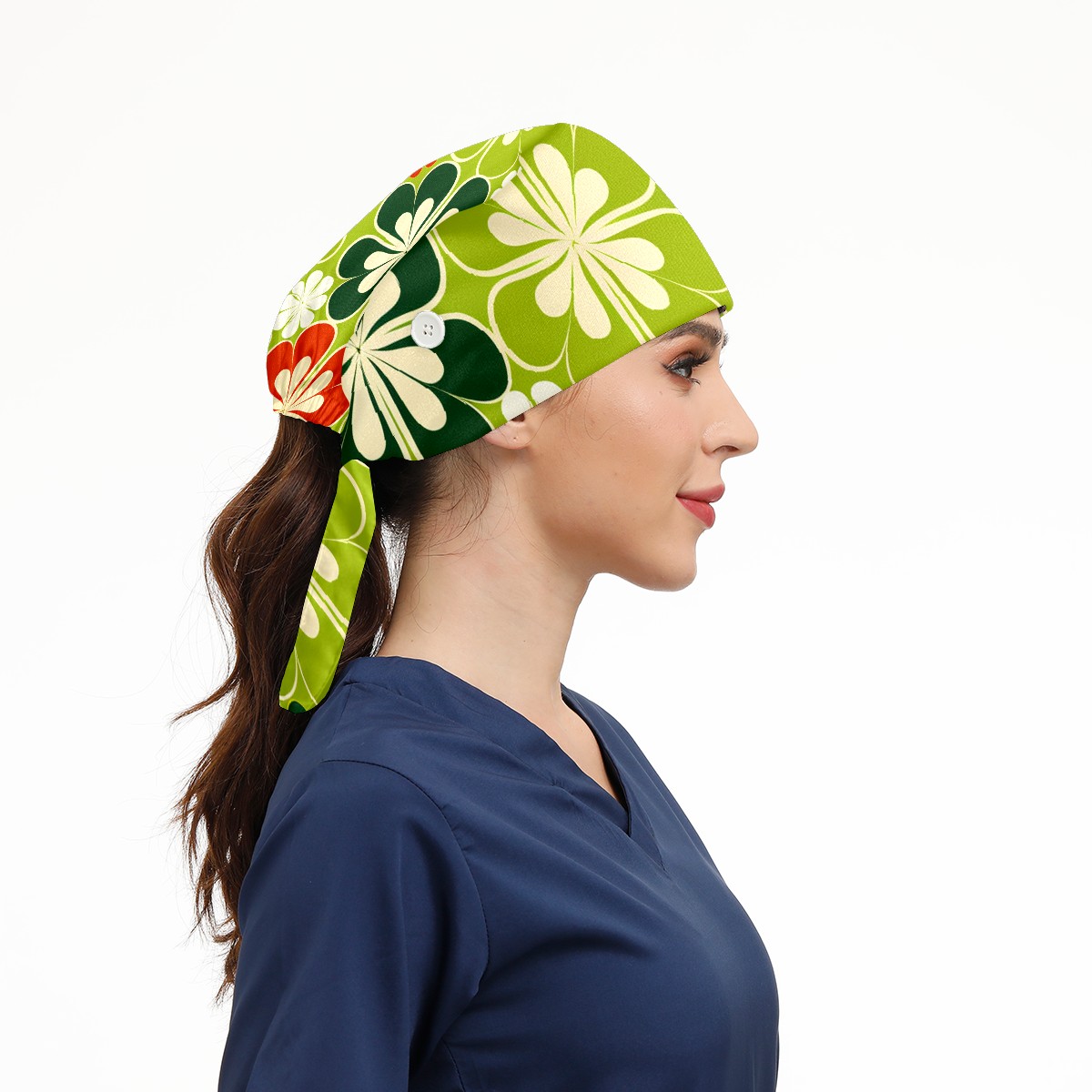 Working Caps with Button&Sweatband Satin Lined Cotton Adjustable Nurse Hats Elastic Band Scrub Cap Surgeon Hat Four Leaf Clover (59)