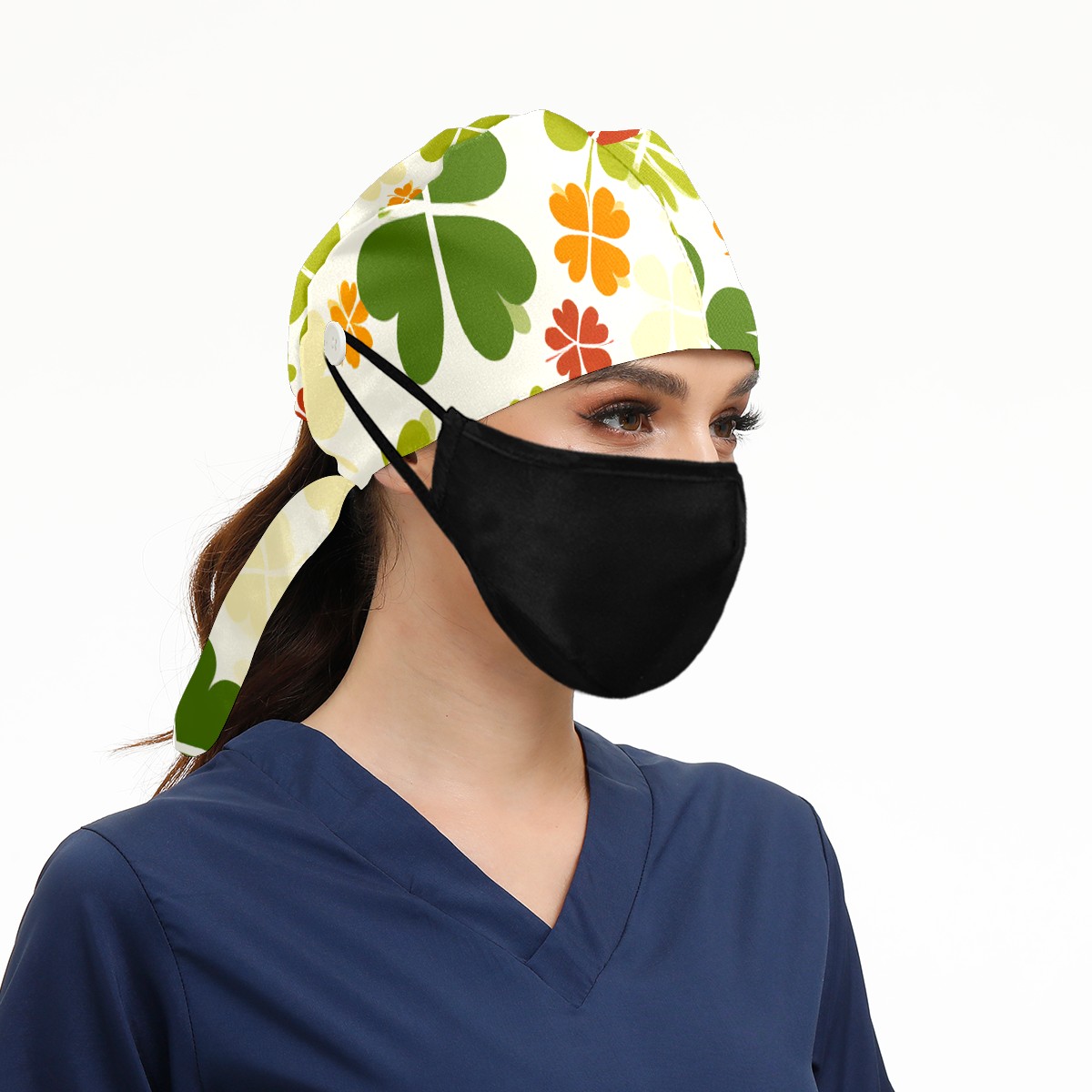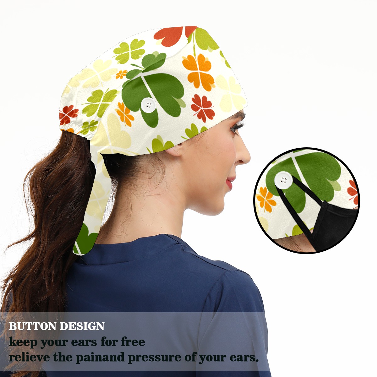 Working Caps with Button&Sweatband Satin Lined Cotton Adjustable Nurse Hats Elastic Band Scrub Cap Surgeon Hat Four Leaf Clover (5)