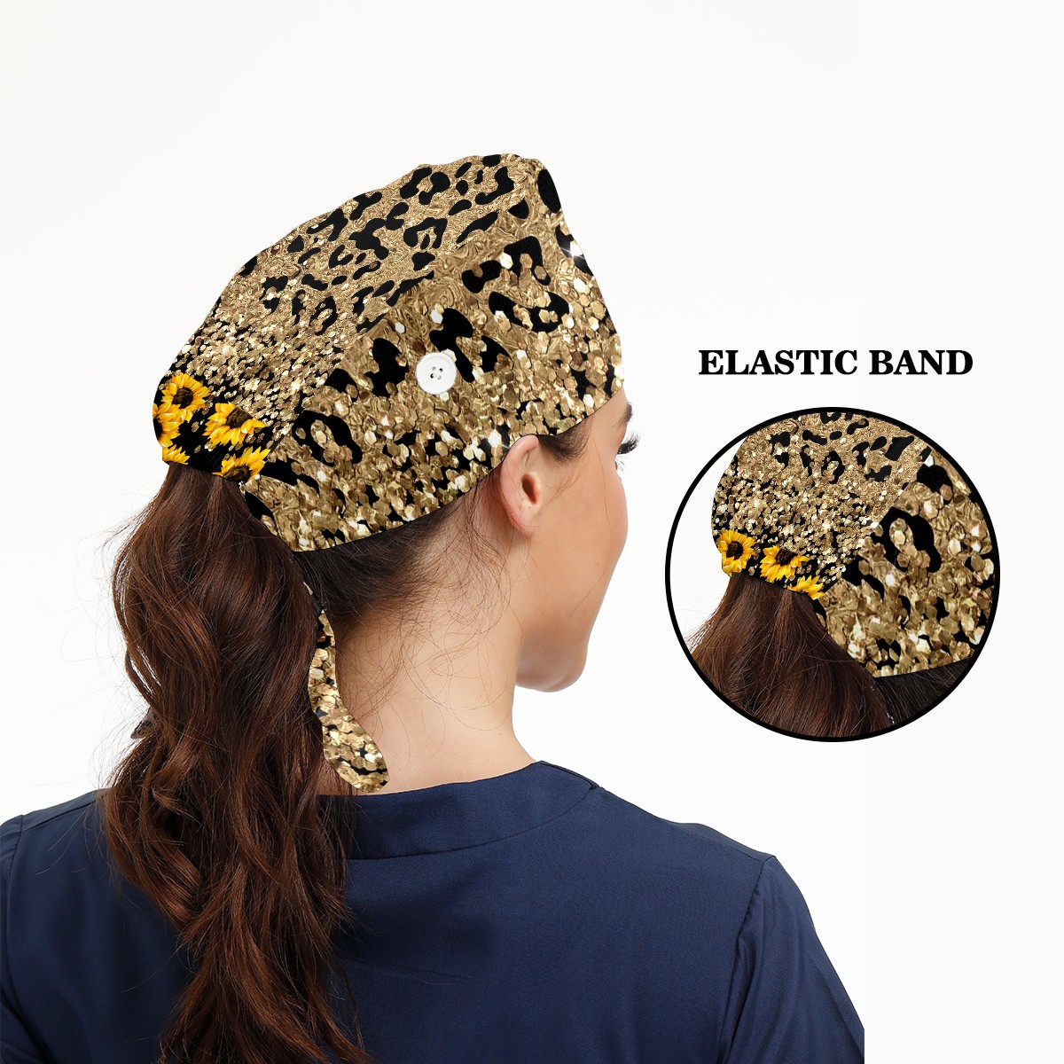 Working Caps with Button&Sweatband Satin Lined Cotton Adjustable Nurse Hats Elastic Band Scrub Cap Surgeon Hat Leopard Sunflower