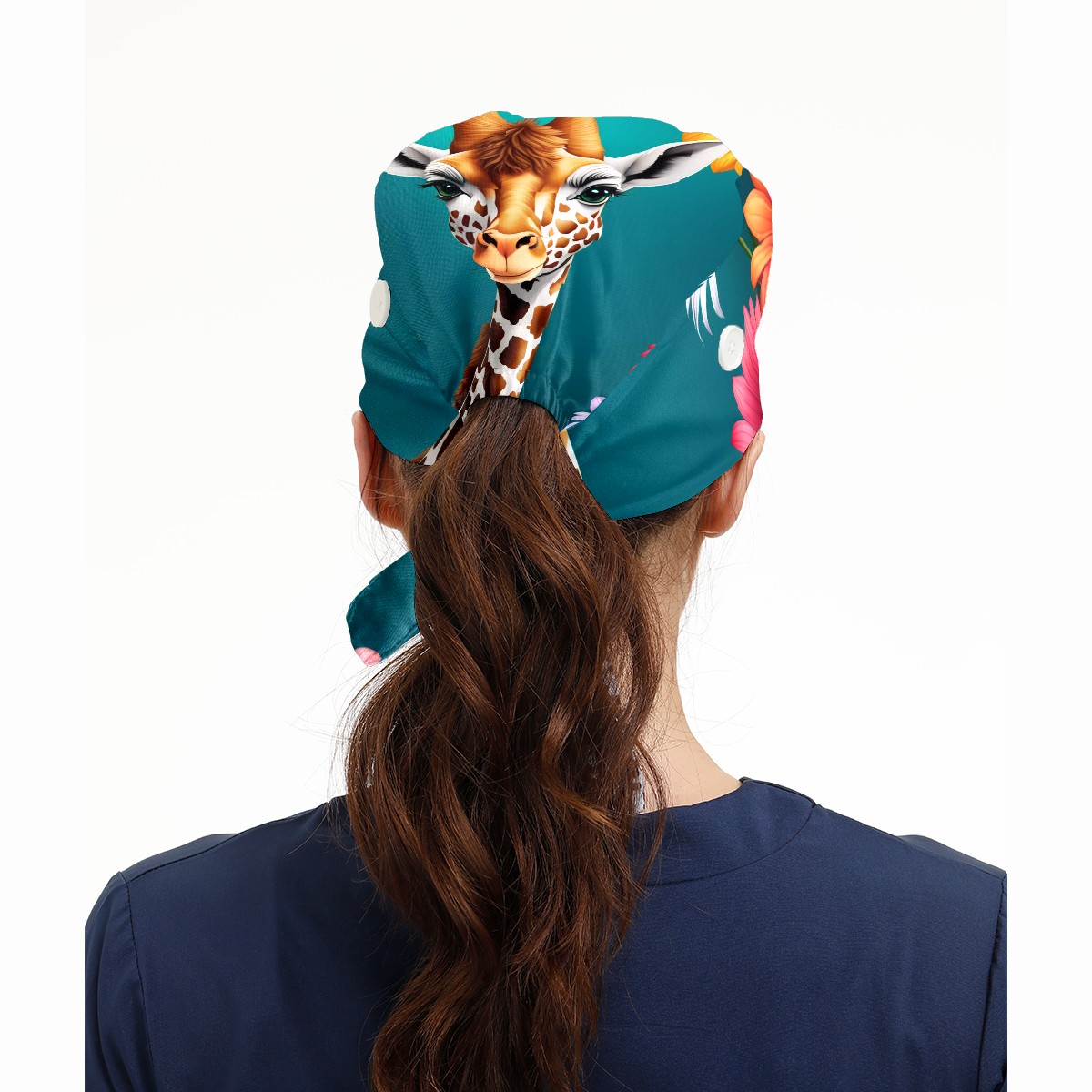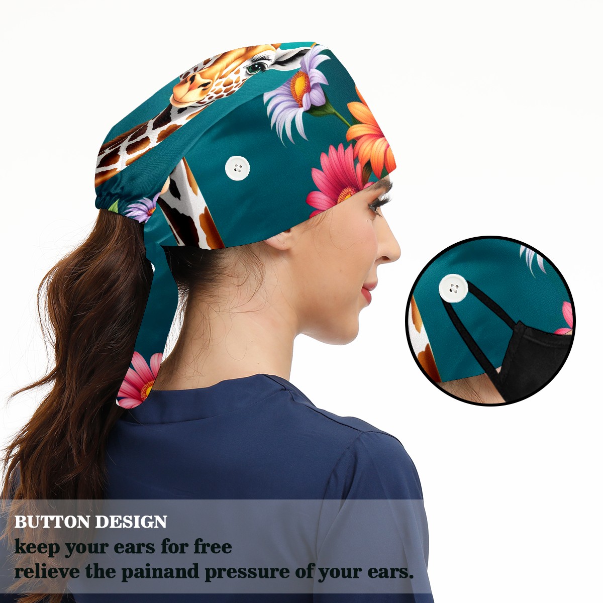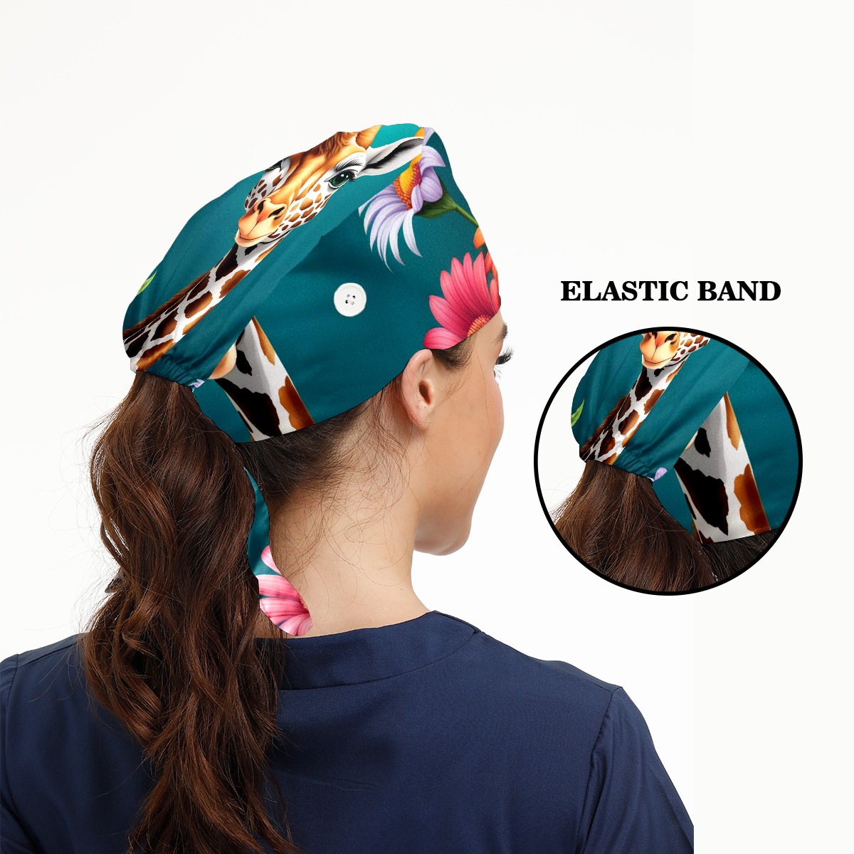 Working Caps with Button&Sweatband Satin Lined Cotton Adjustable Nurse Hats Elastic Band Scrub Cap Surgeon Hat Cute Giraffe