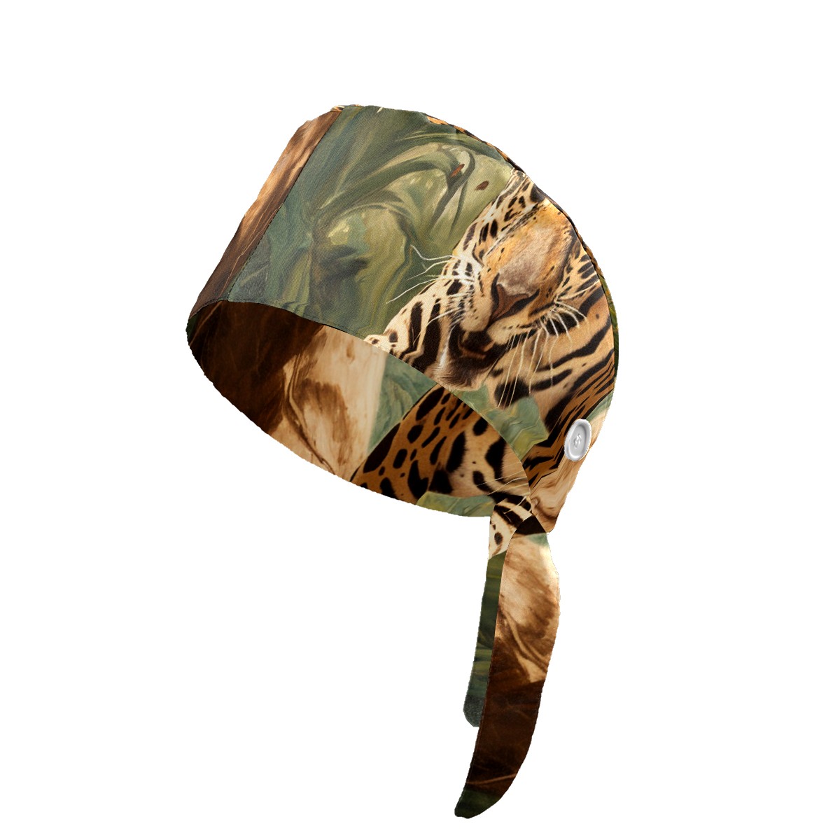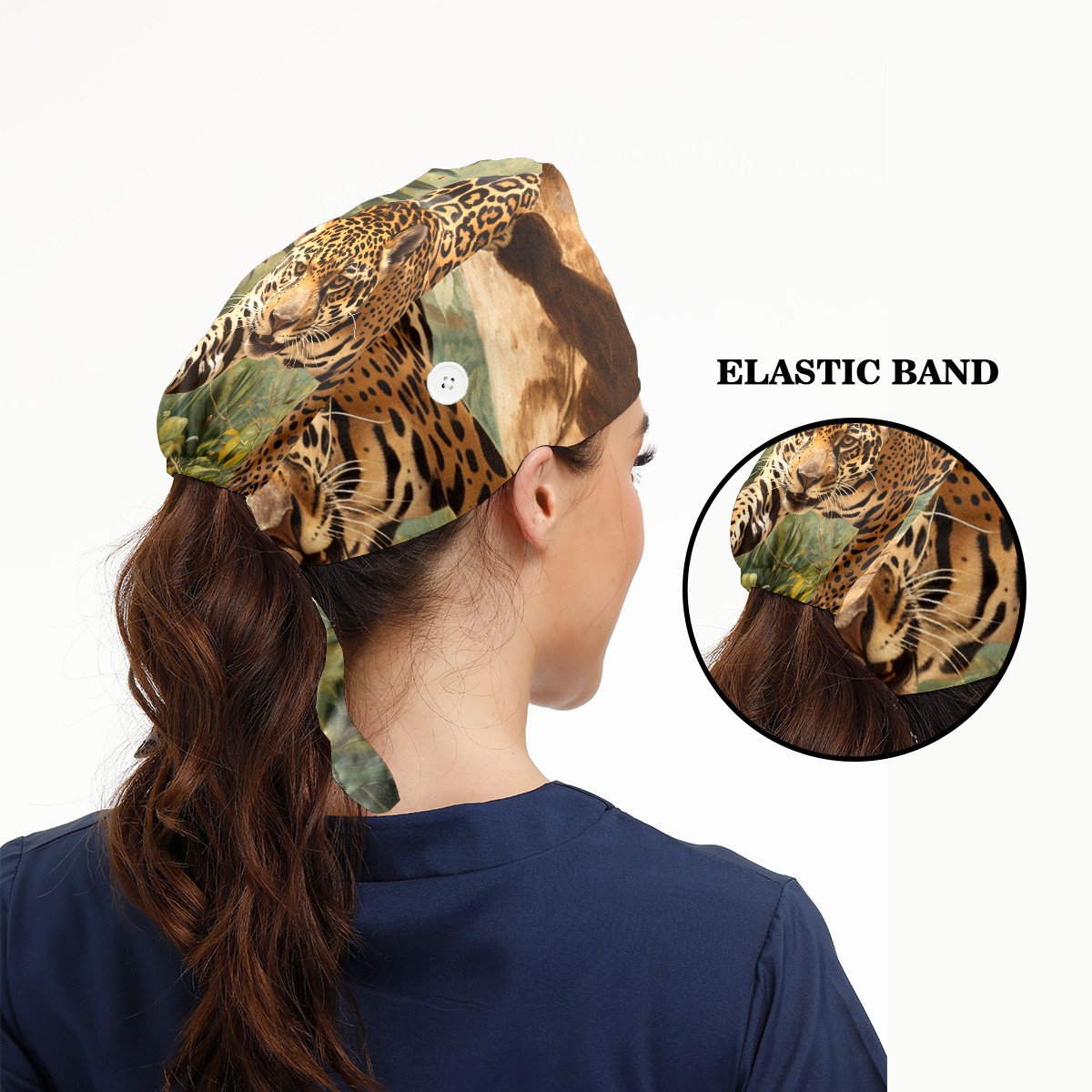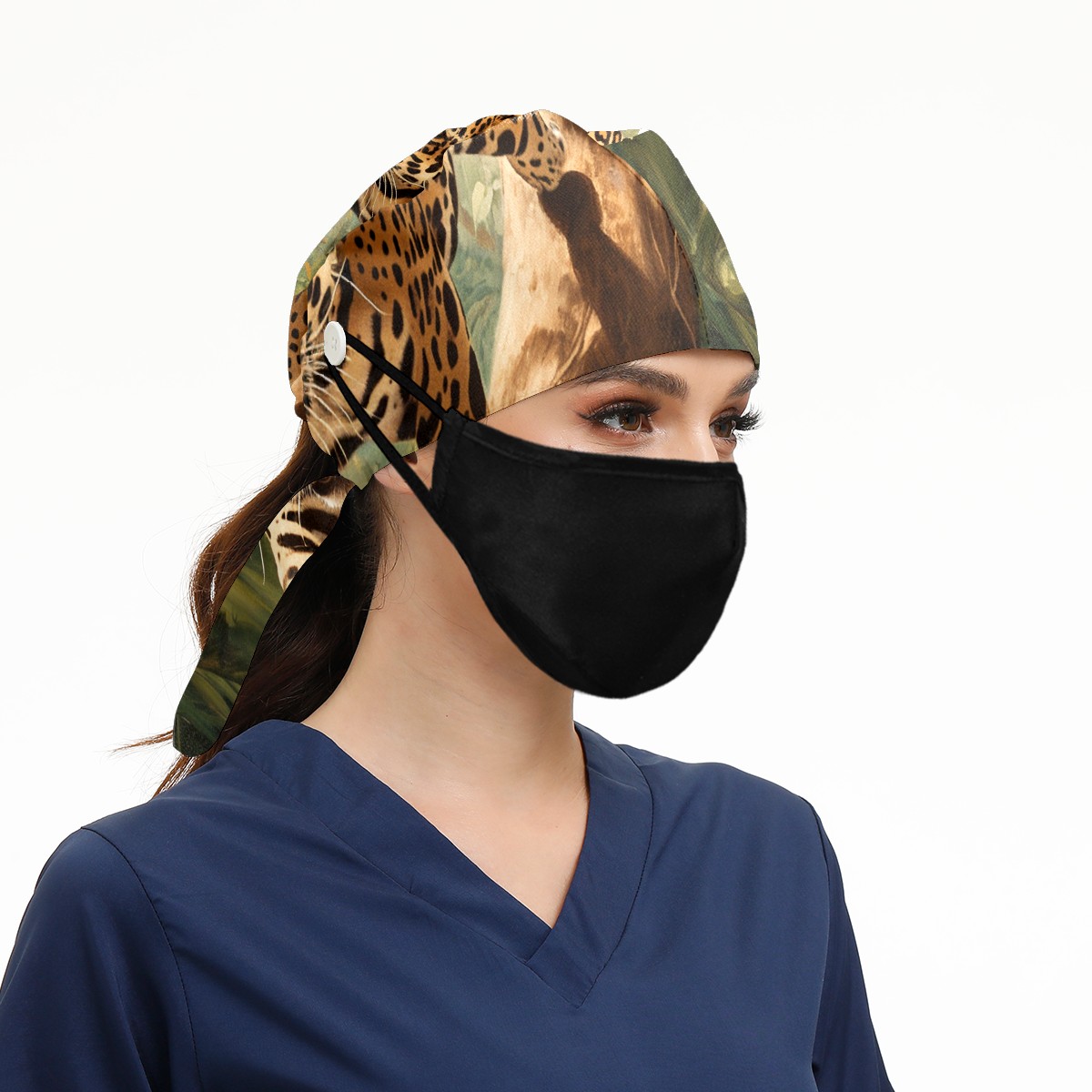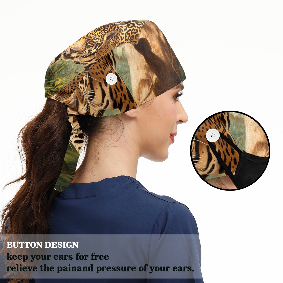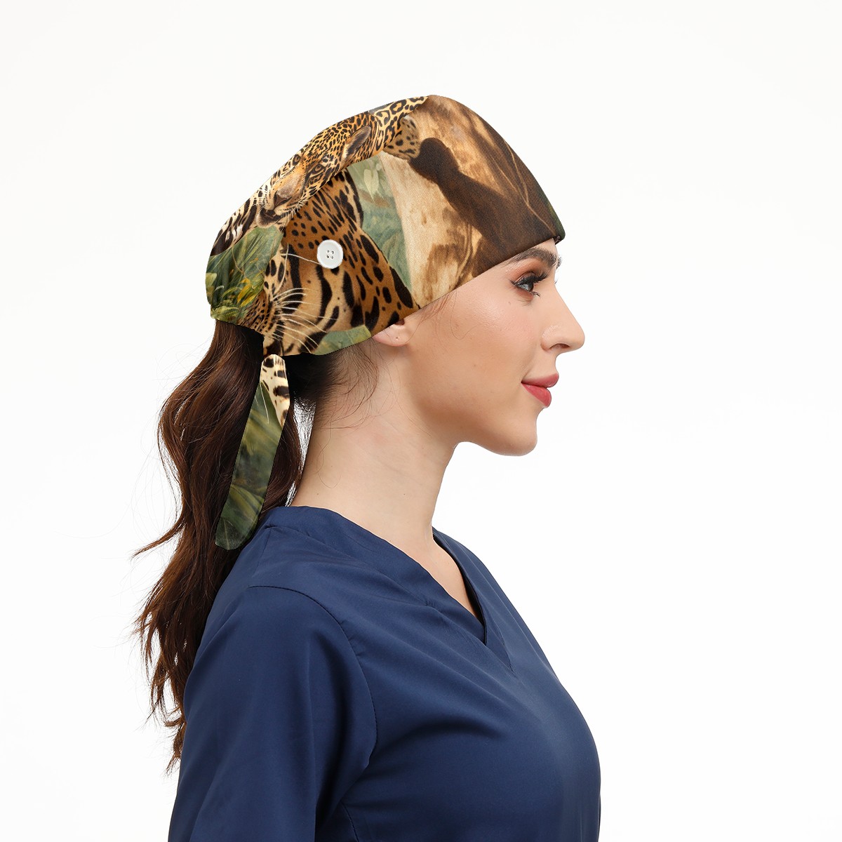 Working Caps with Button&Sweatband Satin Lined Cotton Adjustable Nurse Hats Elastic Band Scrub Cap Surgeon Hat Leopard