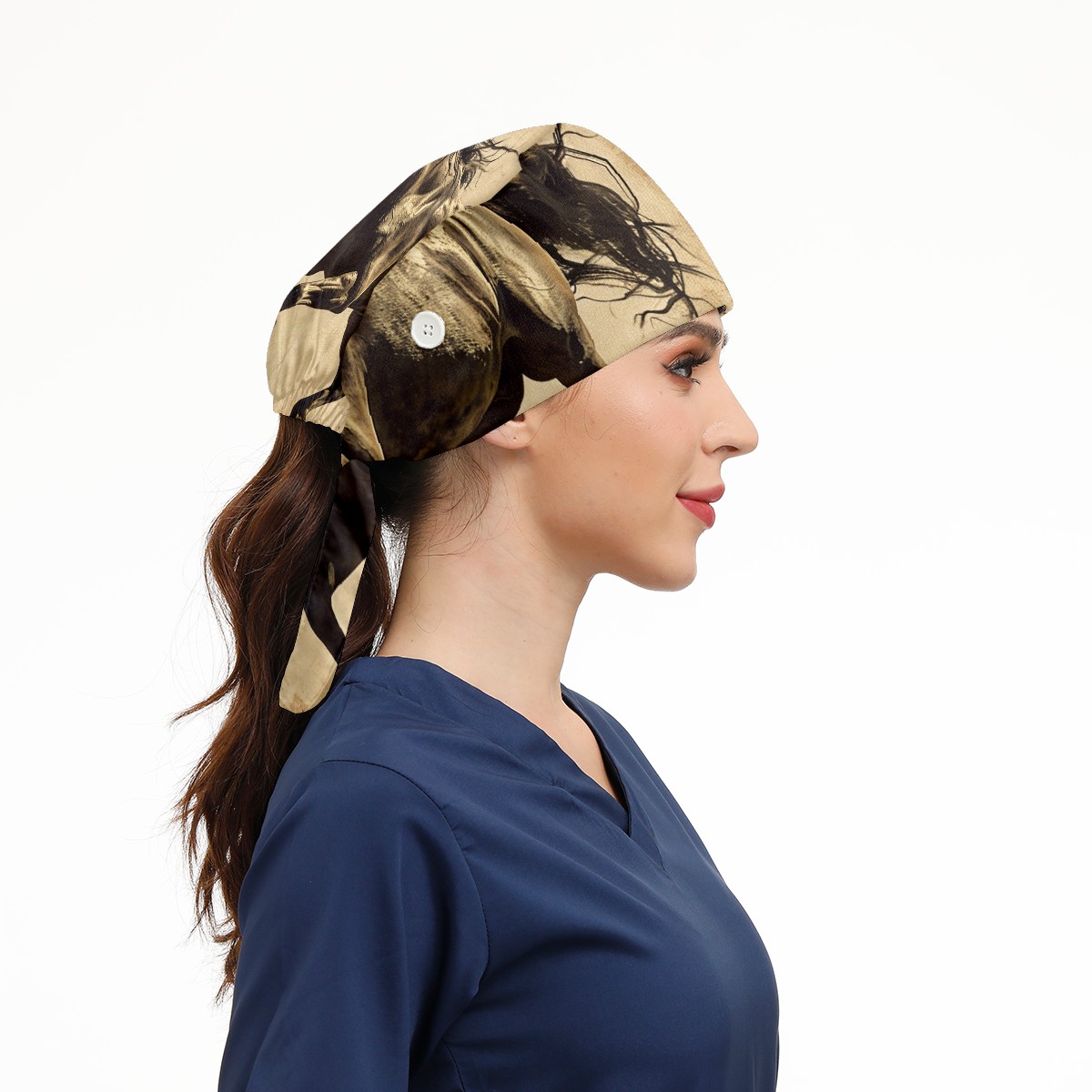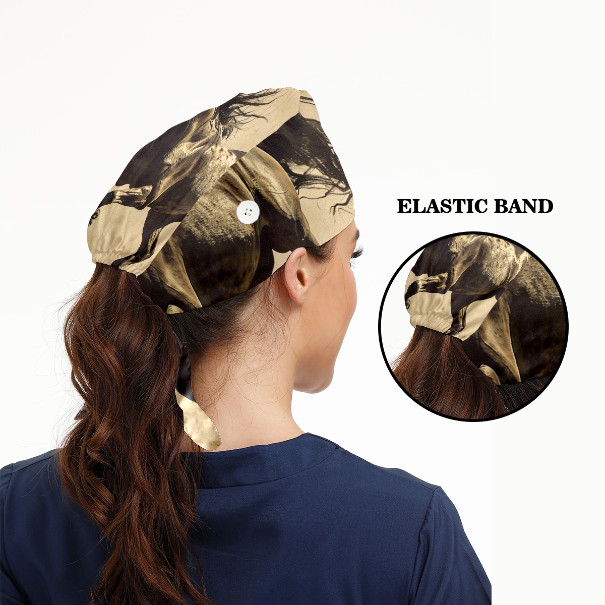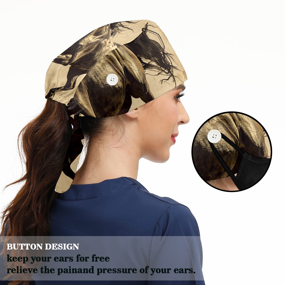 Working Caps with Button&Sweatband Satin Lined Cotton Adjustable Nurse Hats Elastic Band Scrub Cap Surgeon Hat Horse