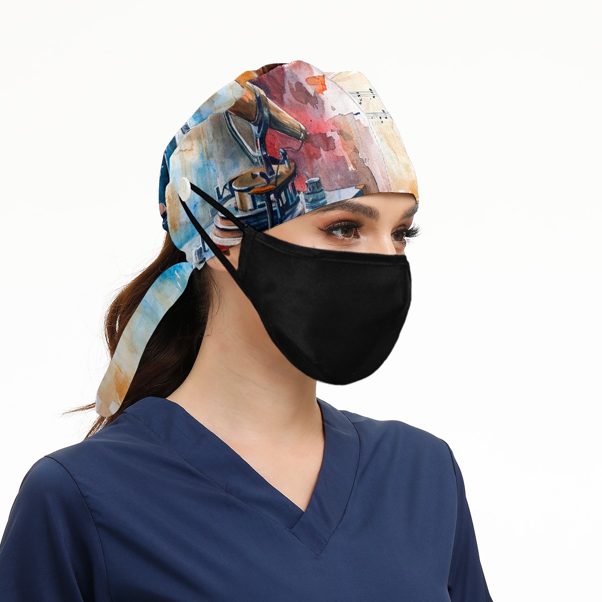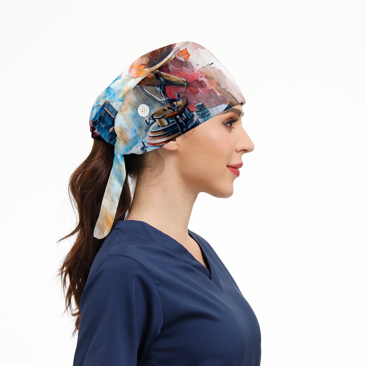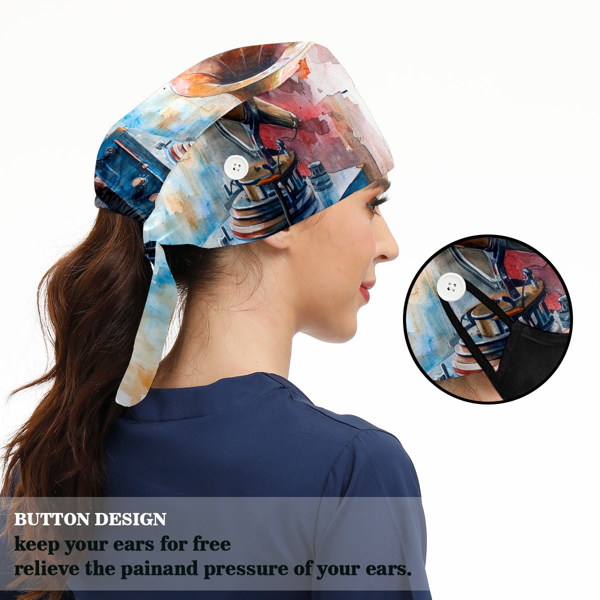 Working Caps with Button&Sweatband Satin Lined Cotton Adjustable Nurse Hats Elastic Band Scrub Cap Surgeon Hat Horn