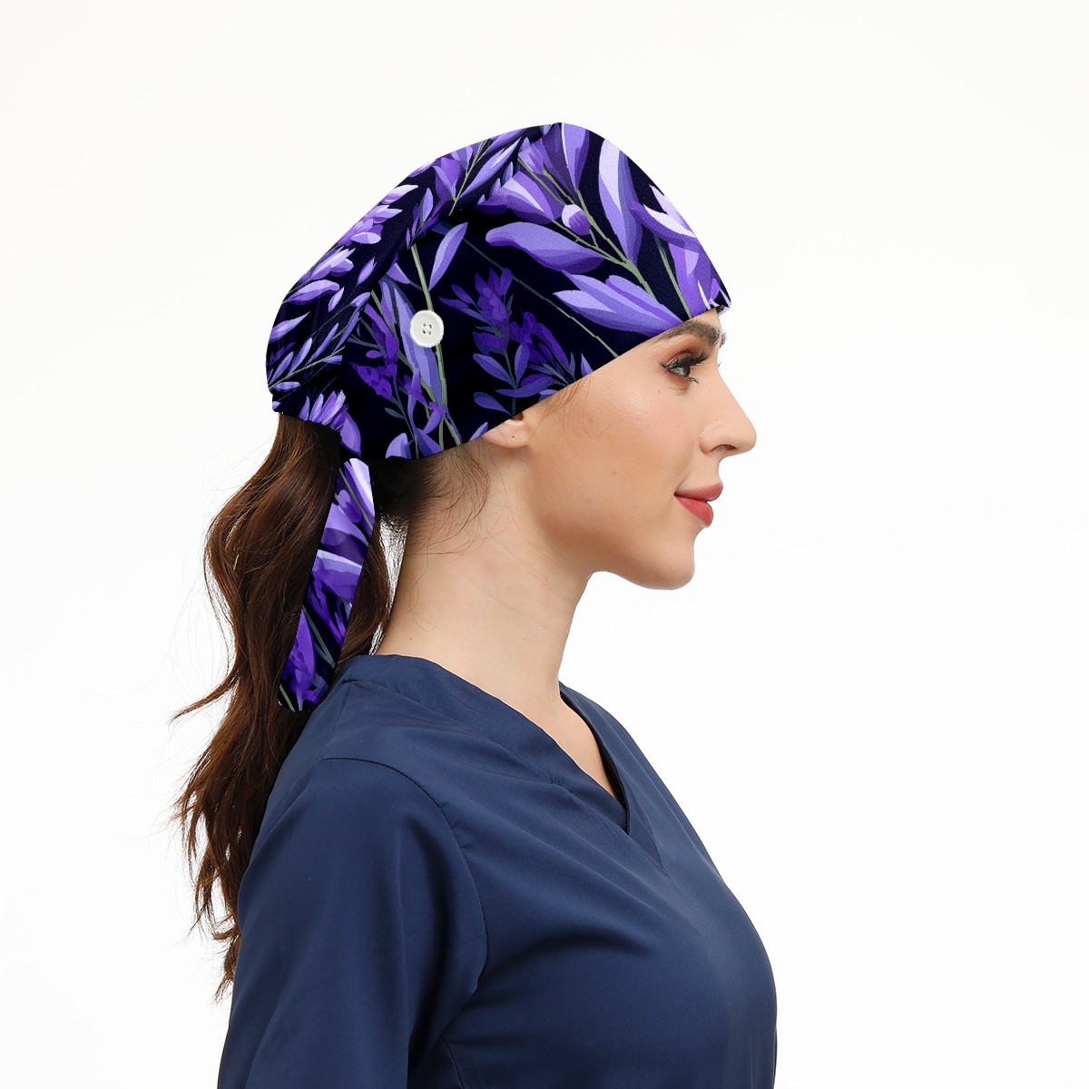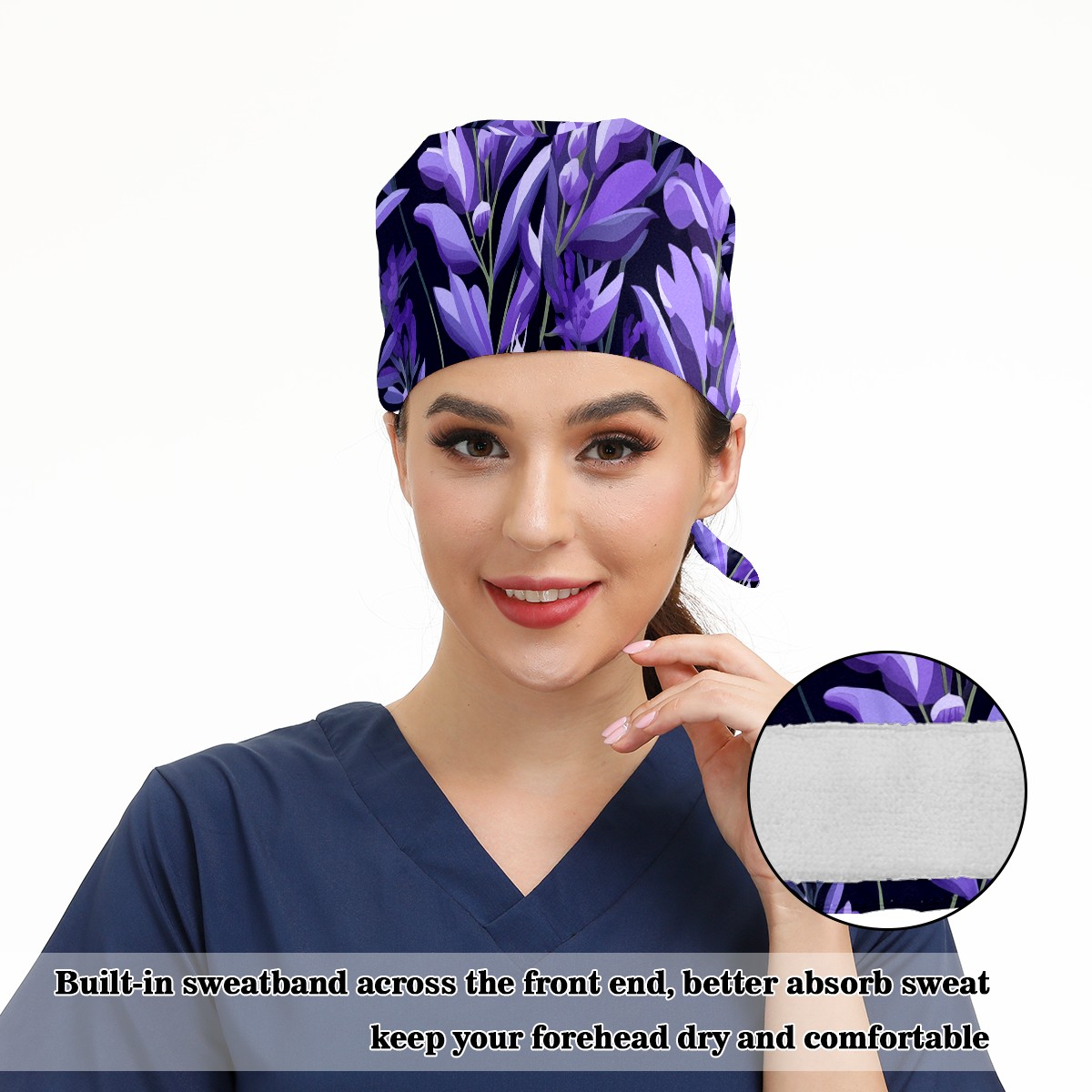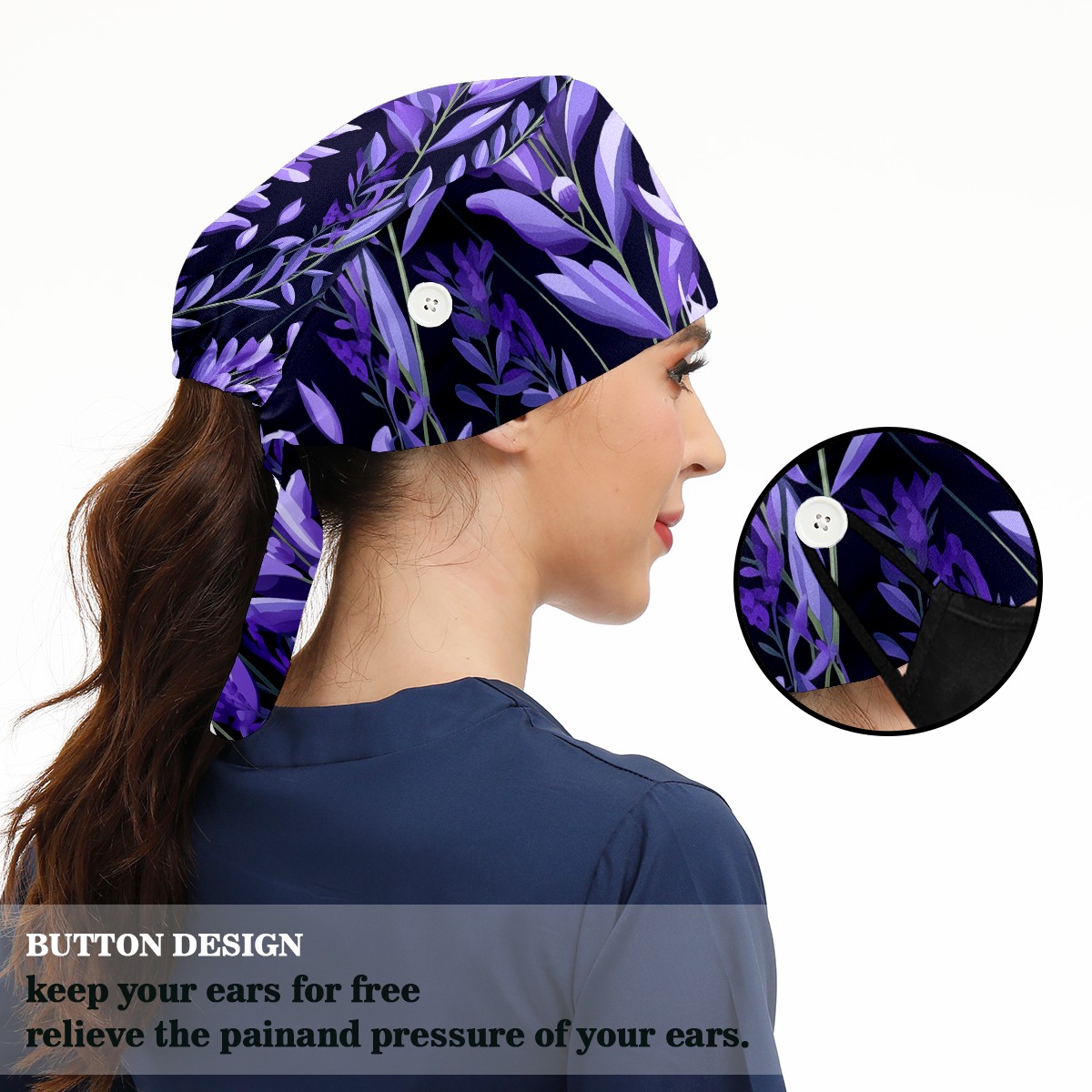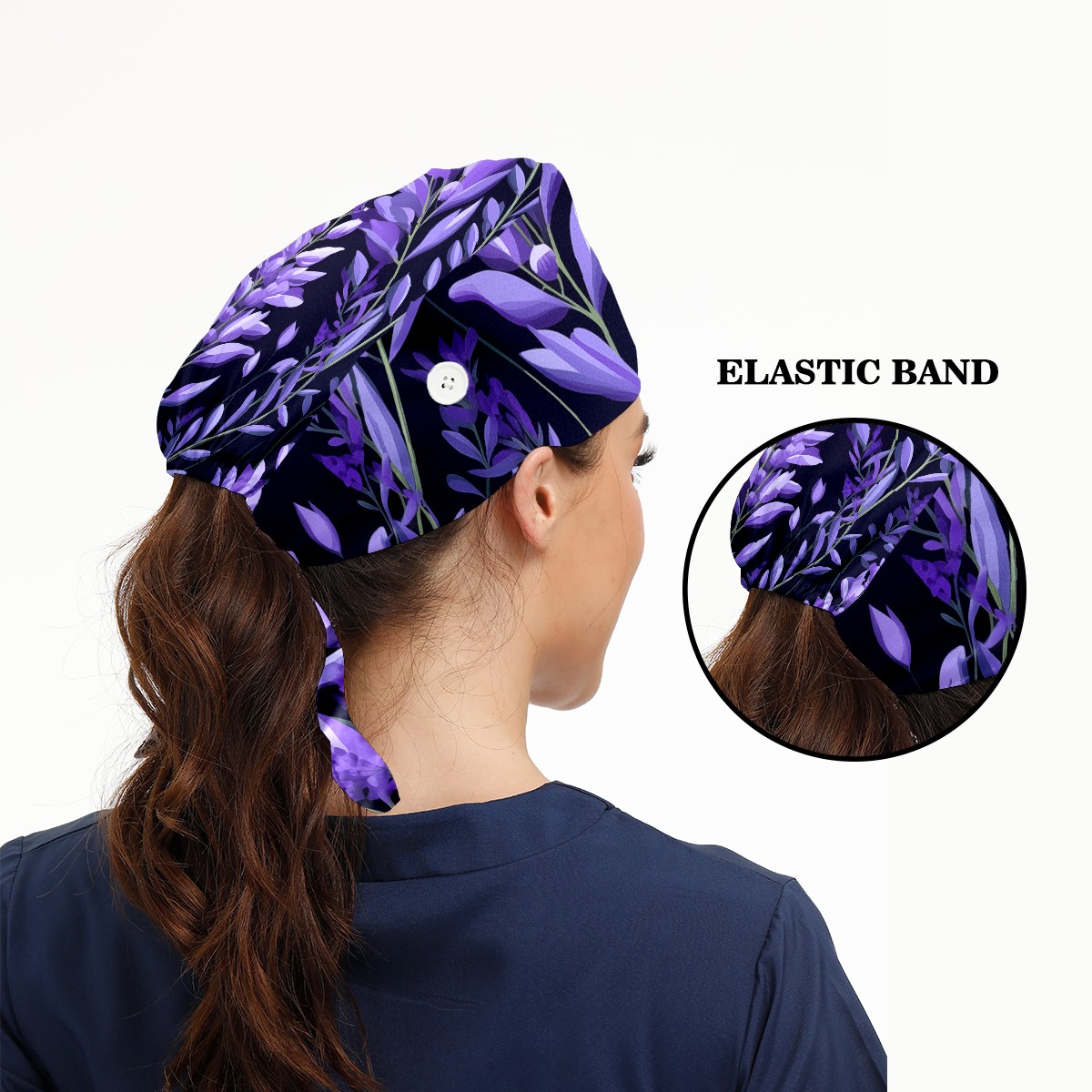 Working Caps with Button&Sweatband Satin Lined Cotton Adjustable Nurse Hats Elastic Band Scrub Cap Surgeon Hat Purple Plants