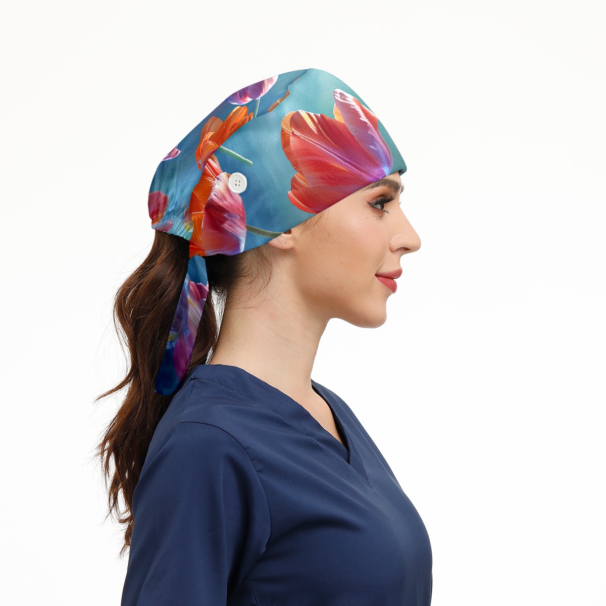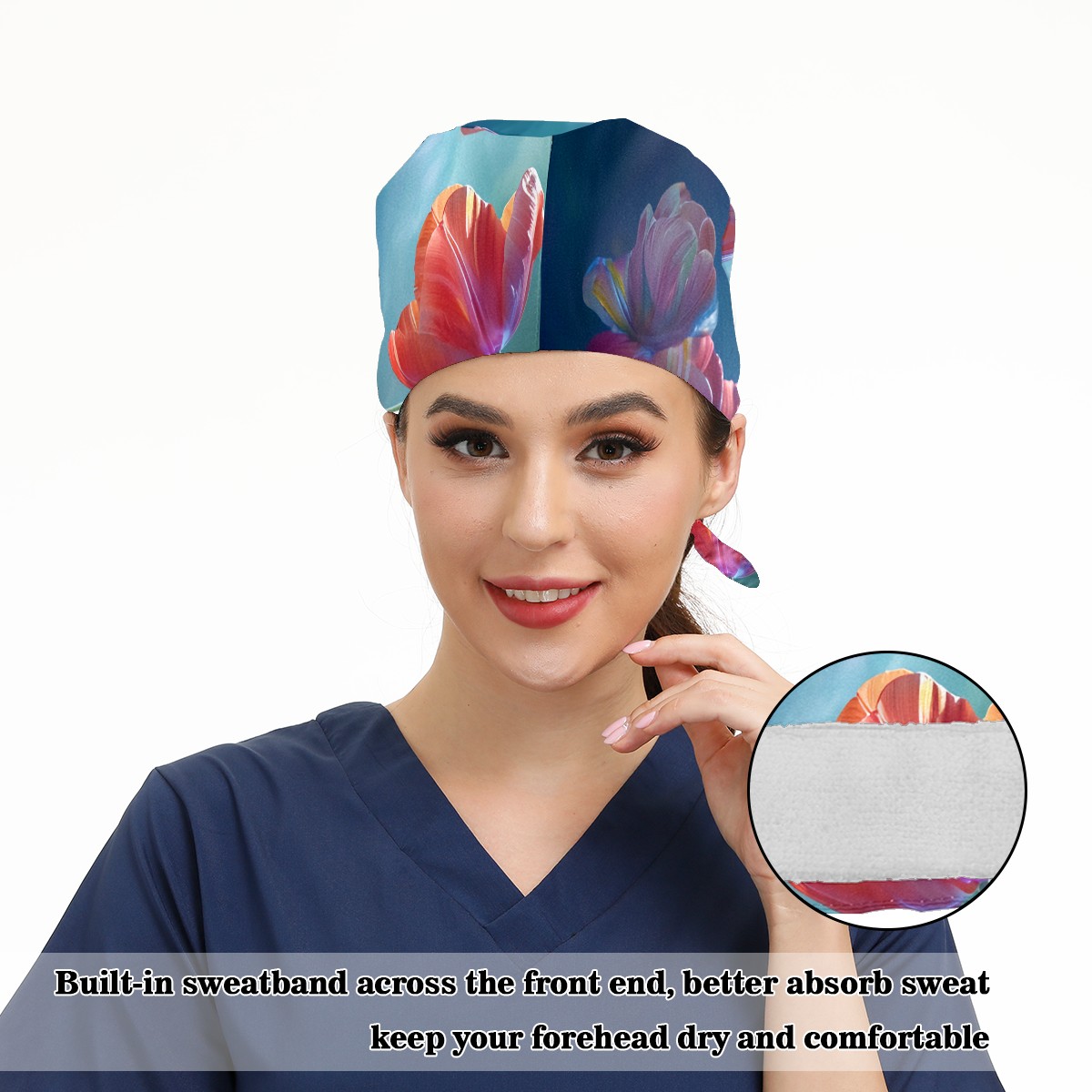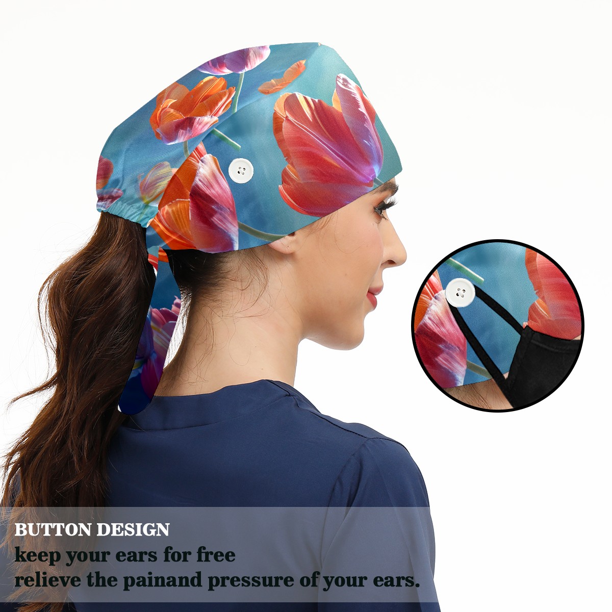 Working Caps with Button&Sweatband Satin Lined Cotton Adjustable Nurse Hats Elastic Band Scrub Cap Surgeon Hat Tulip Petal B