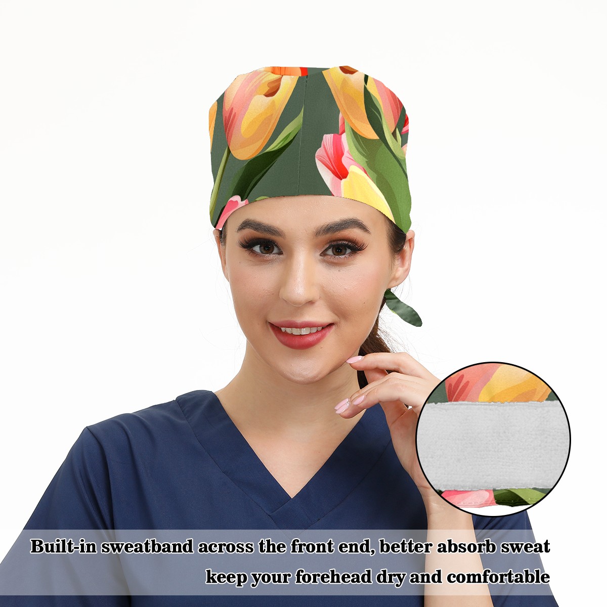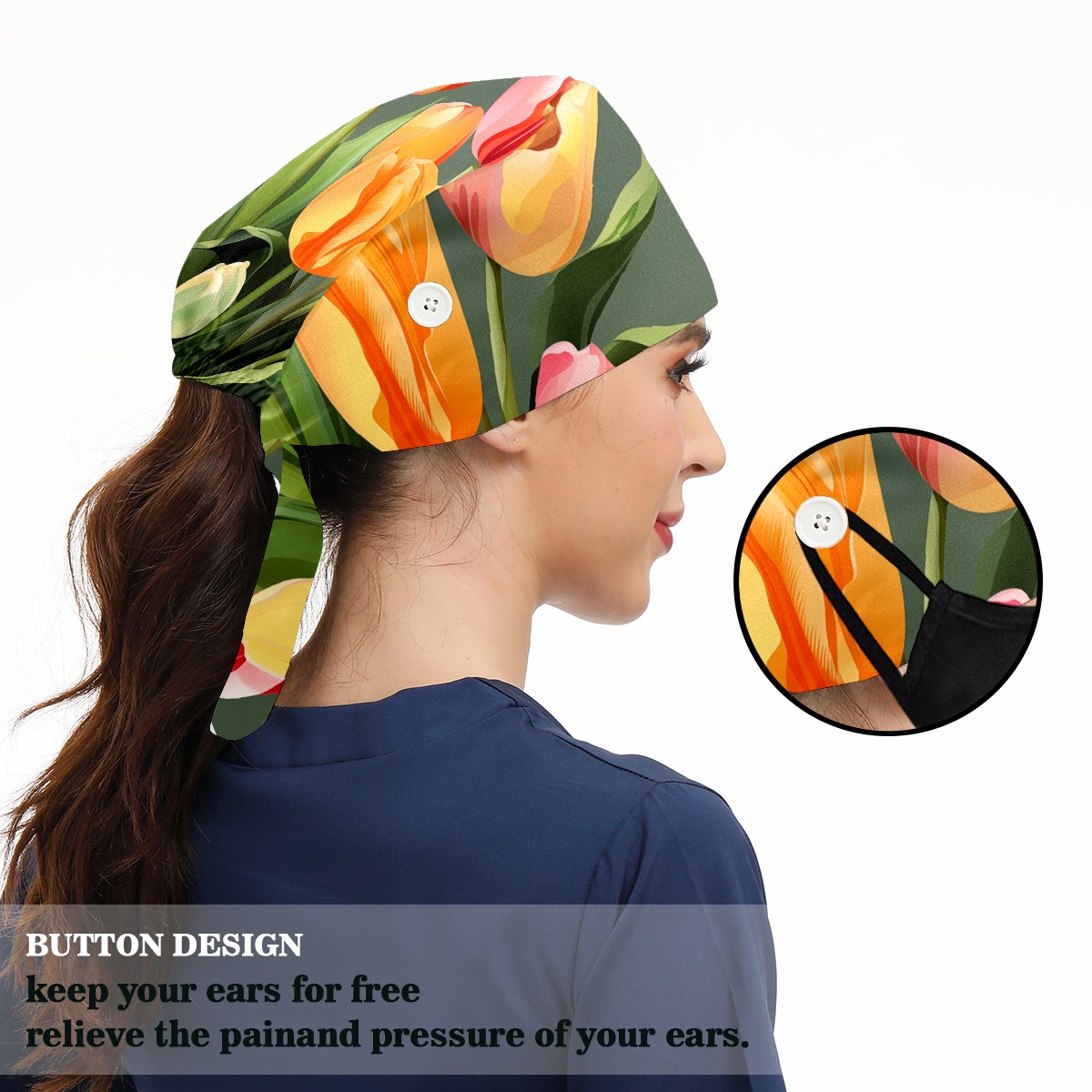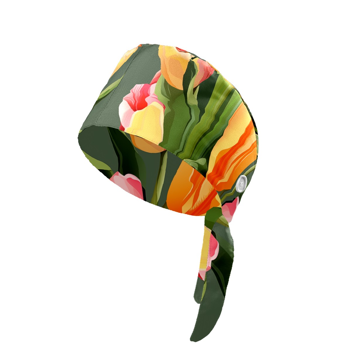 Working Caps with Button&Sweatband Satin Lined Cotton Adjustable Nurse Hats Elastic Band Scrub Cap Surgeon Hat Tulip Petal C