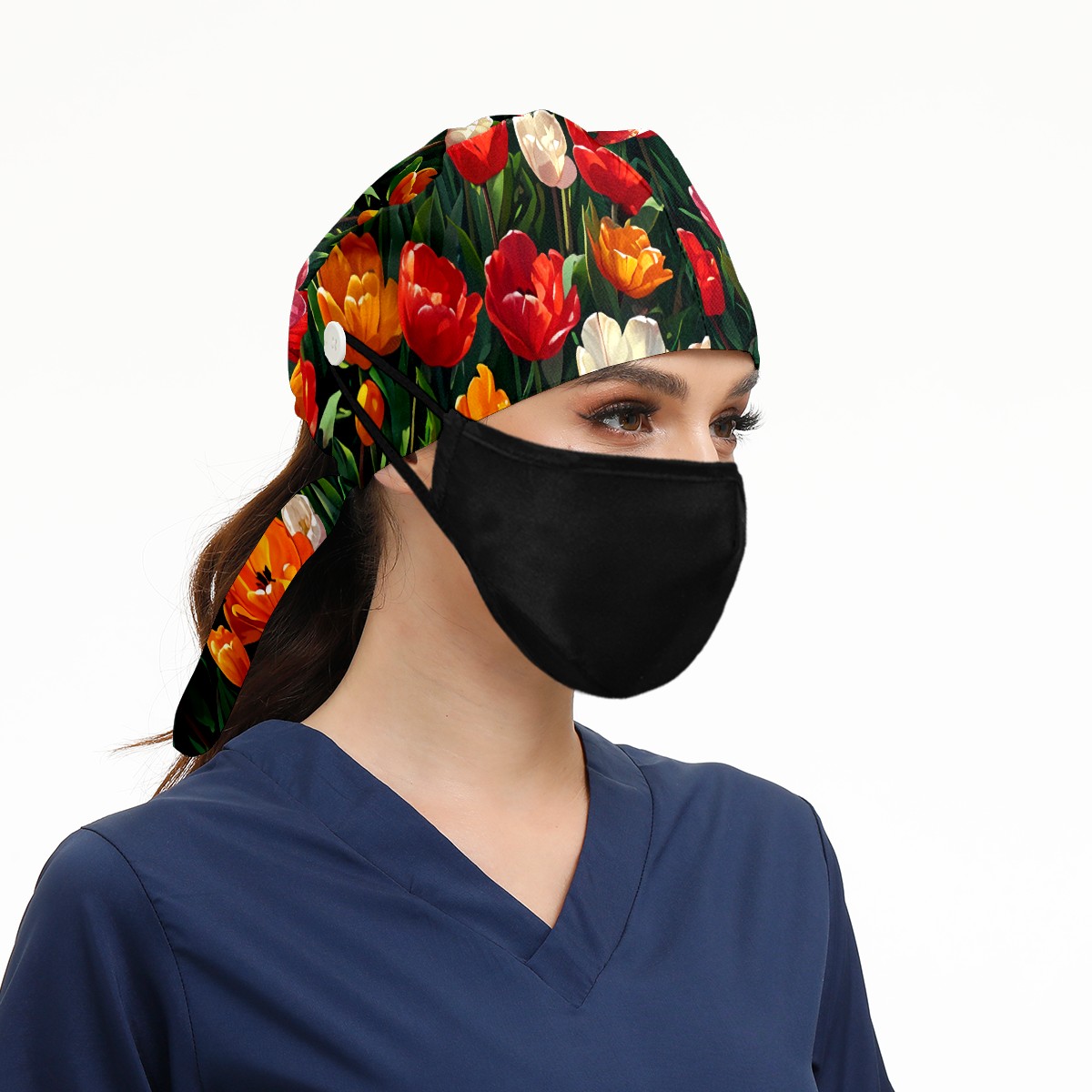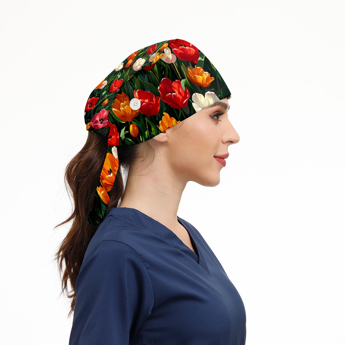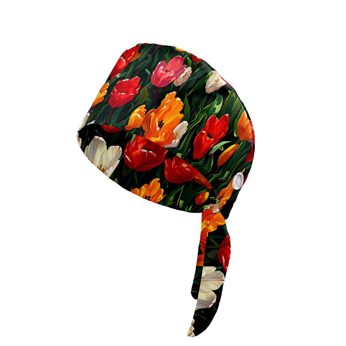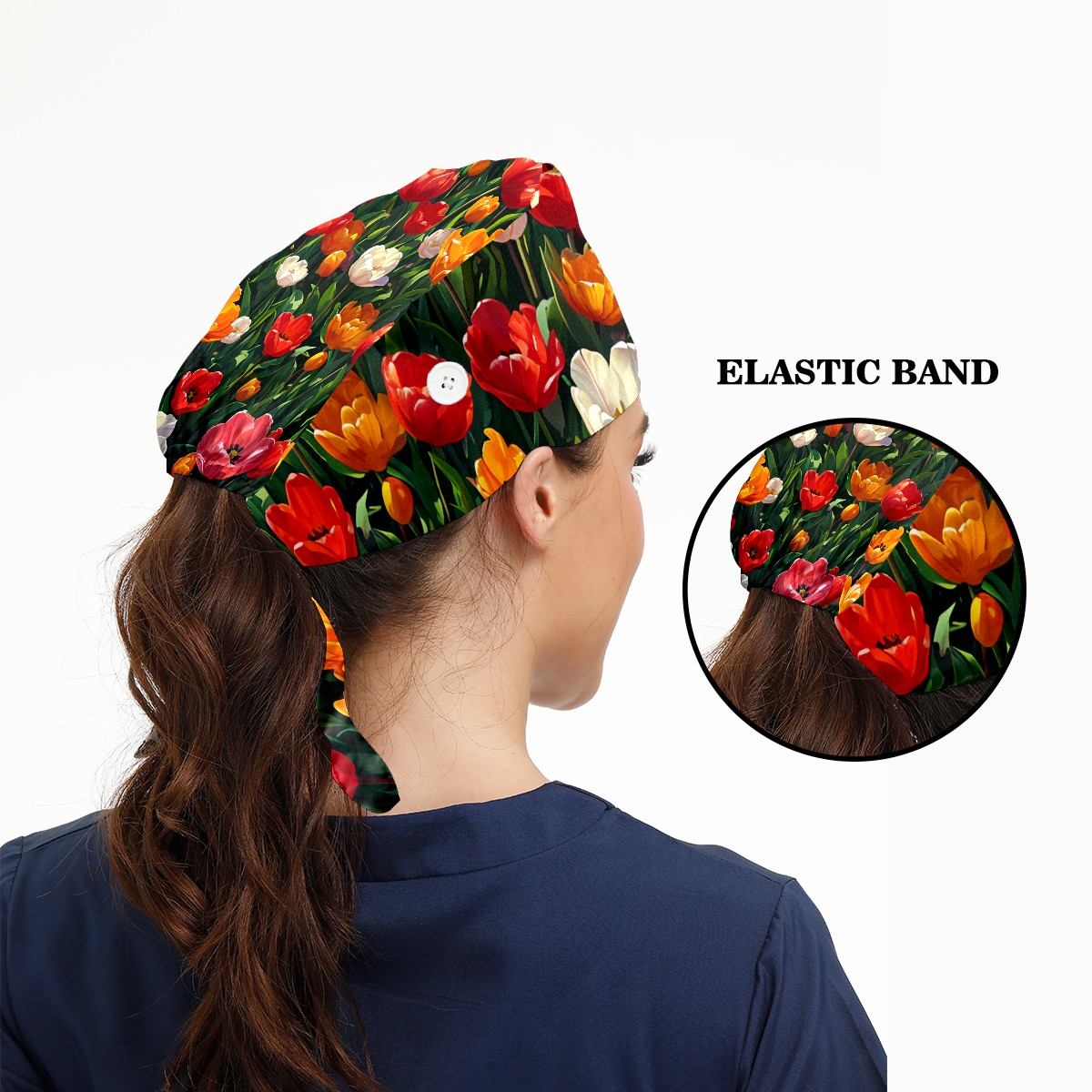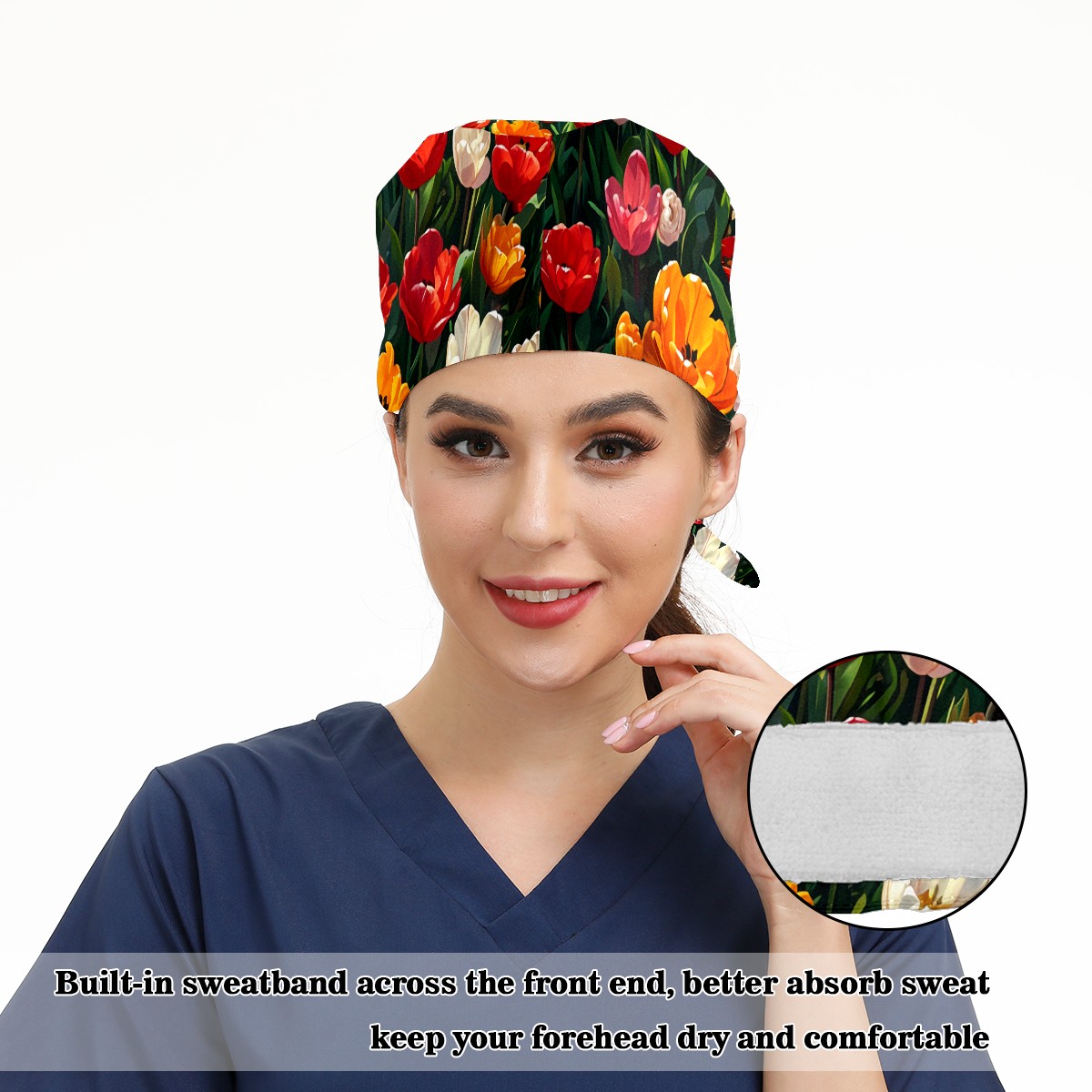 Working Caps with Button&Sweatband Satin Lined Cotton Adjustable Nurse Hats Elastic Band Scrub Cap Surgeon Hat Tulip Blossom E