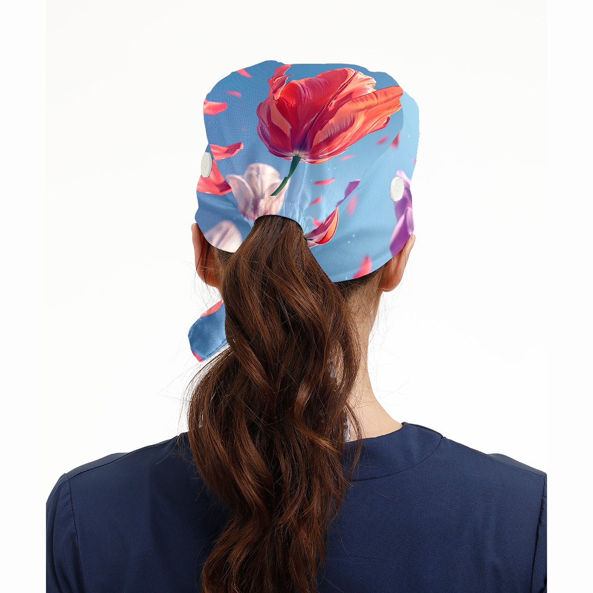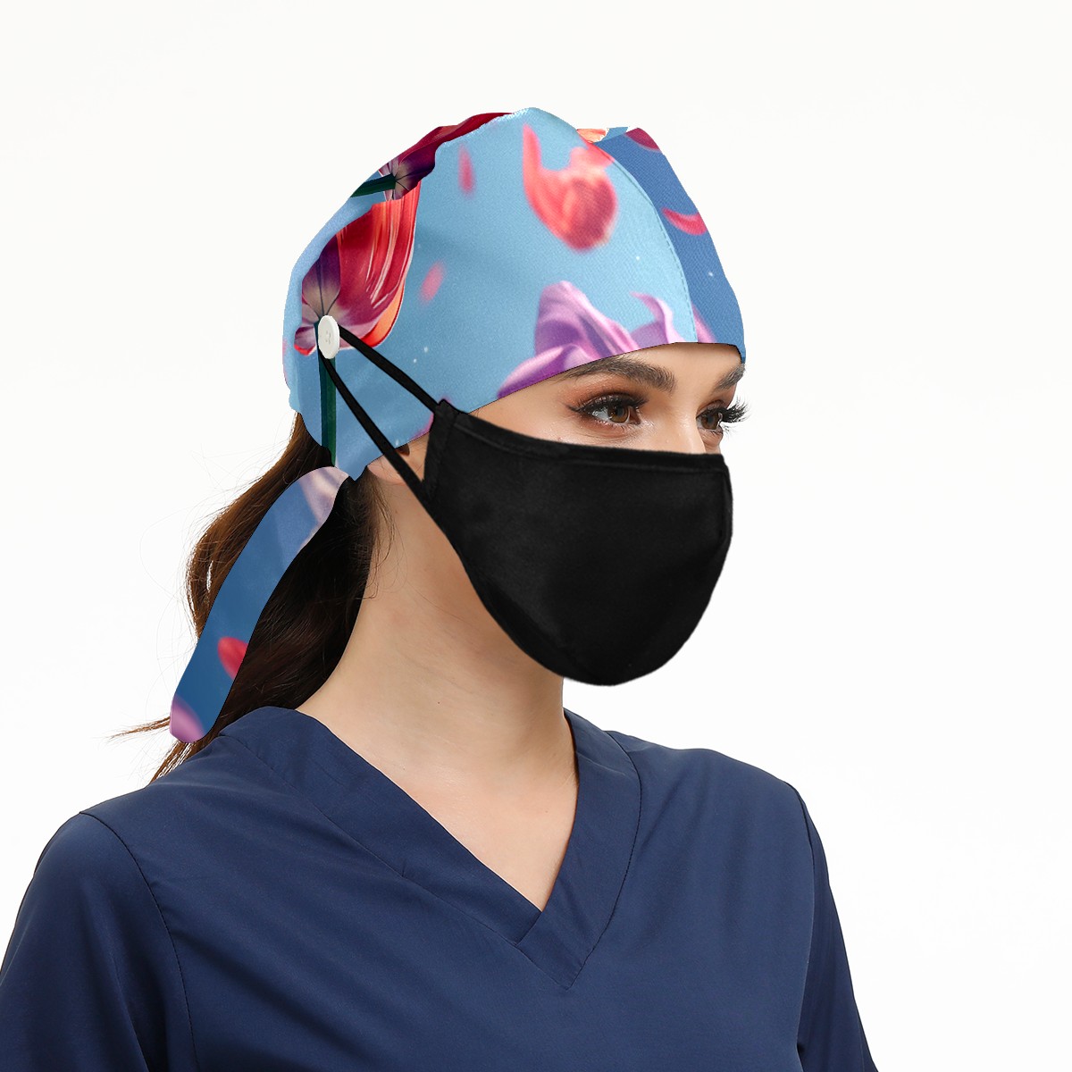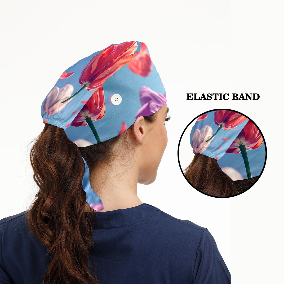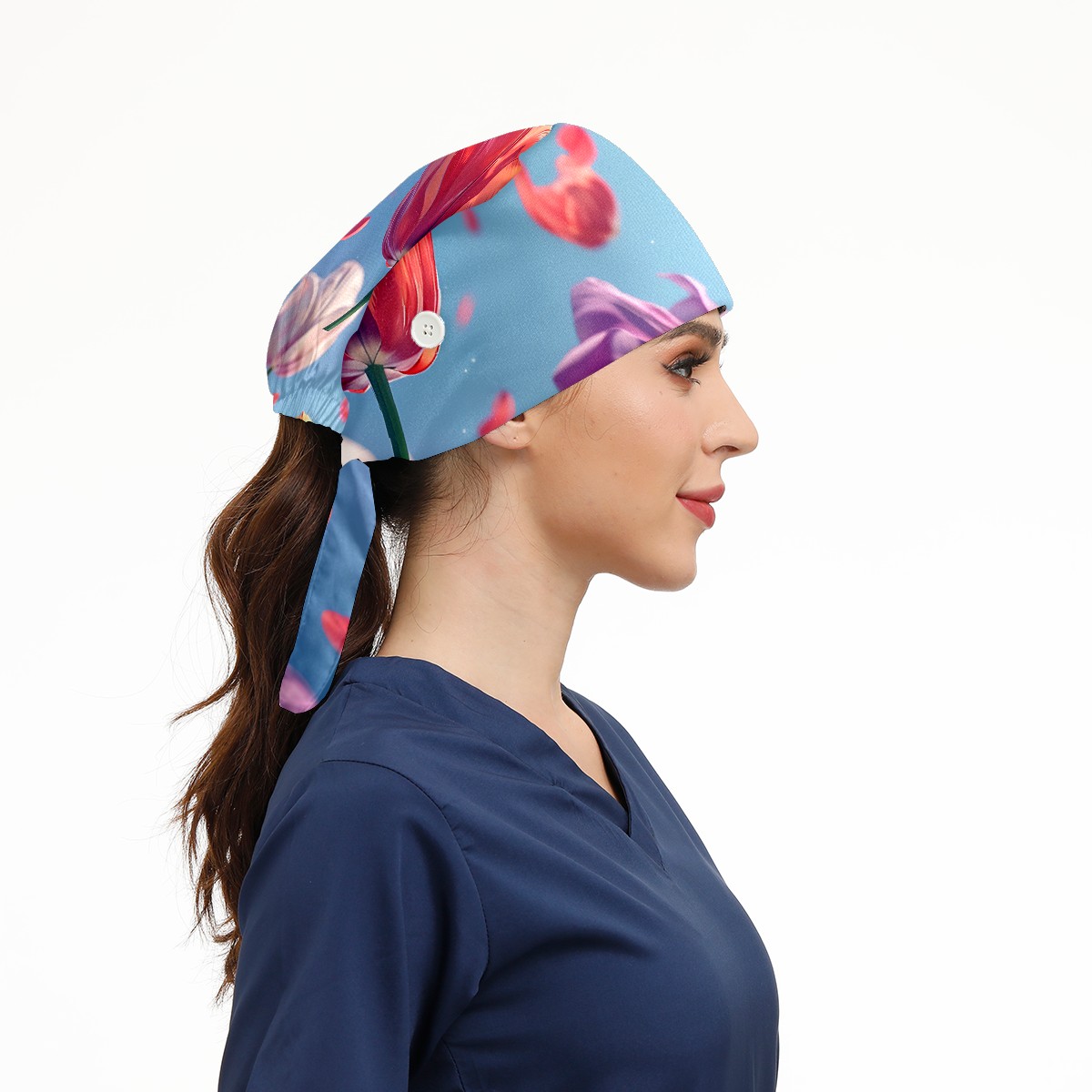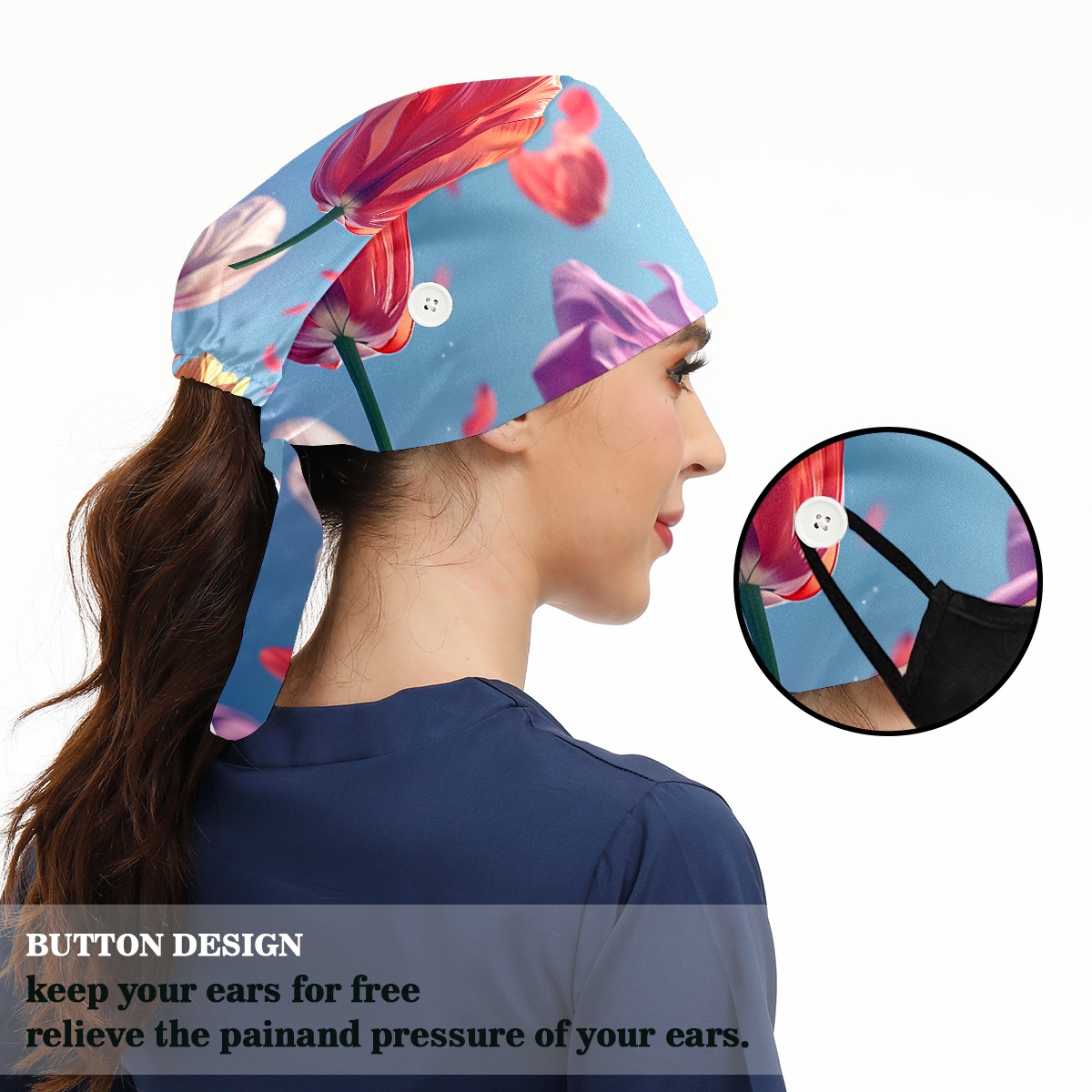 Working Caps with Button&Sweatband Satin Lined Cotton Adjustable Nurse Hats Elastic Band Scrub Cap Surgeon Hat Tulips F