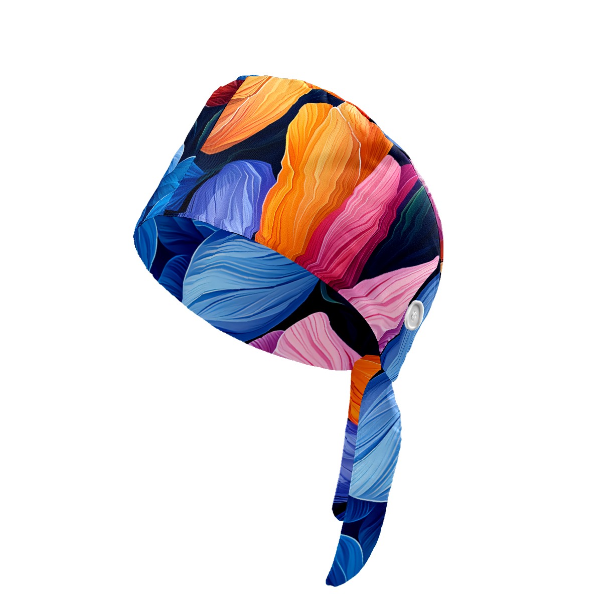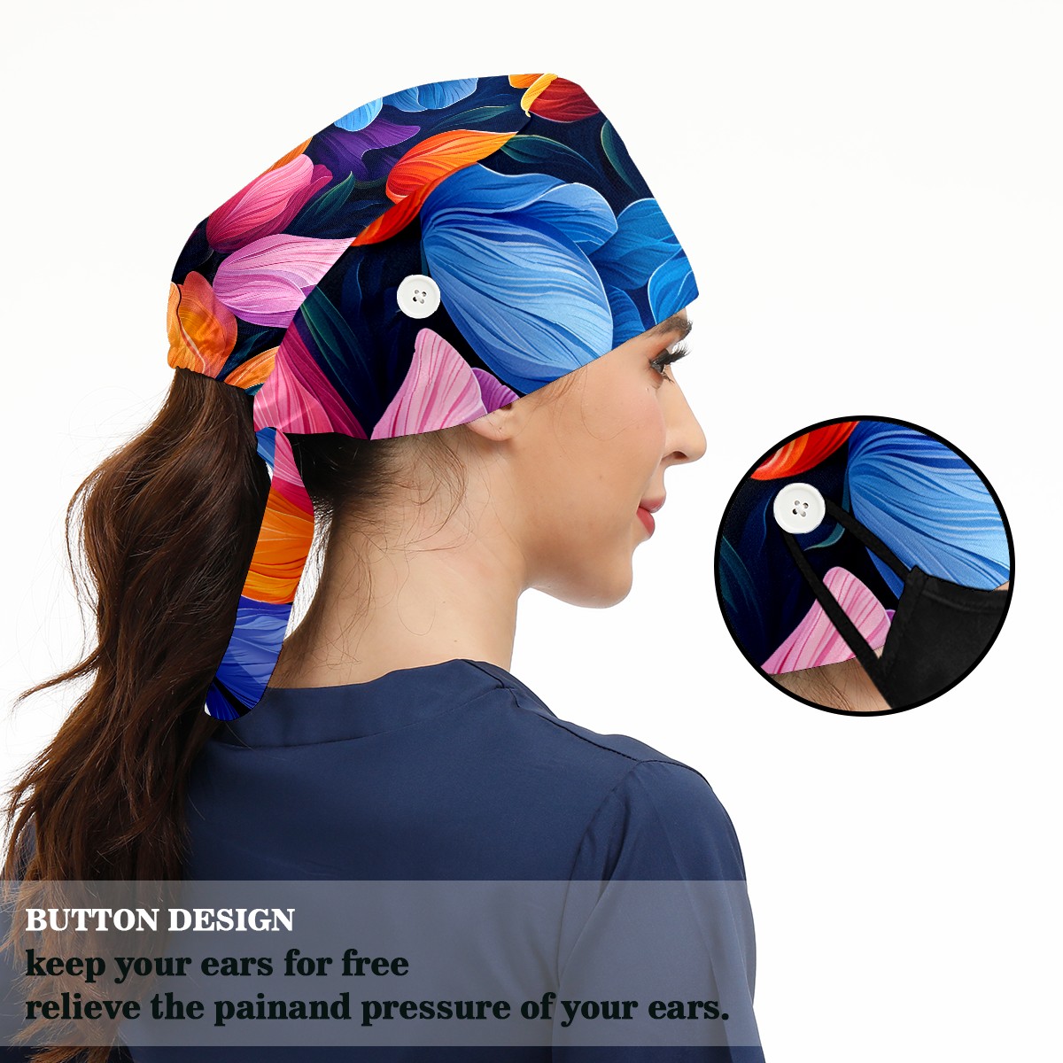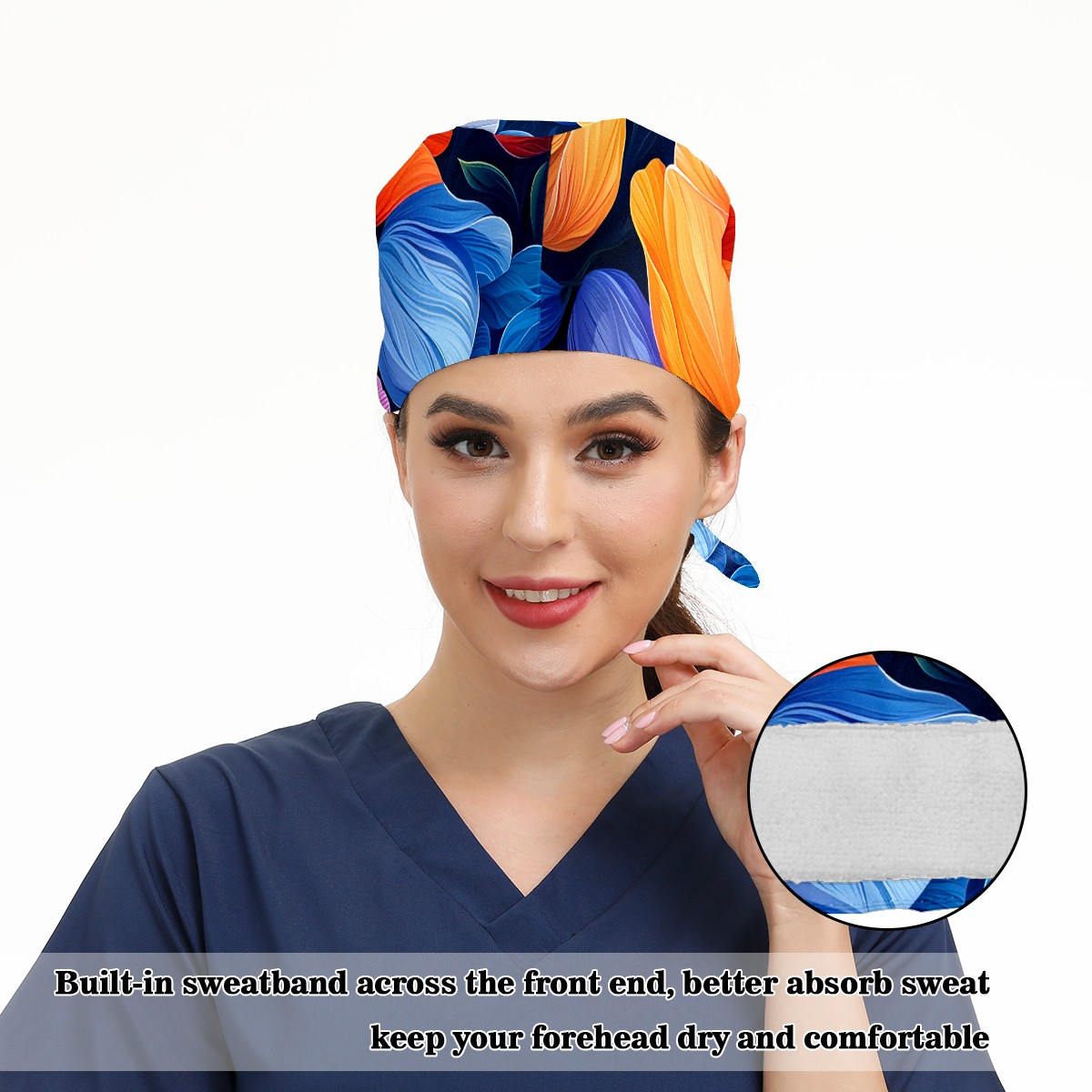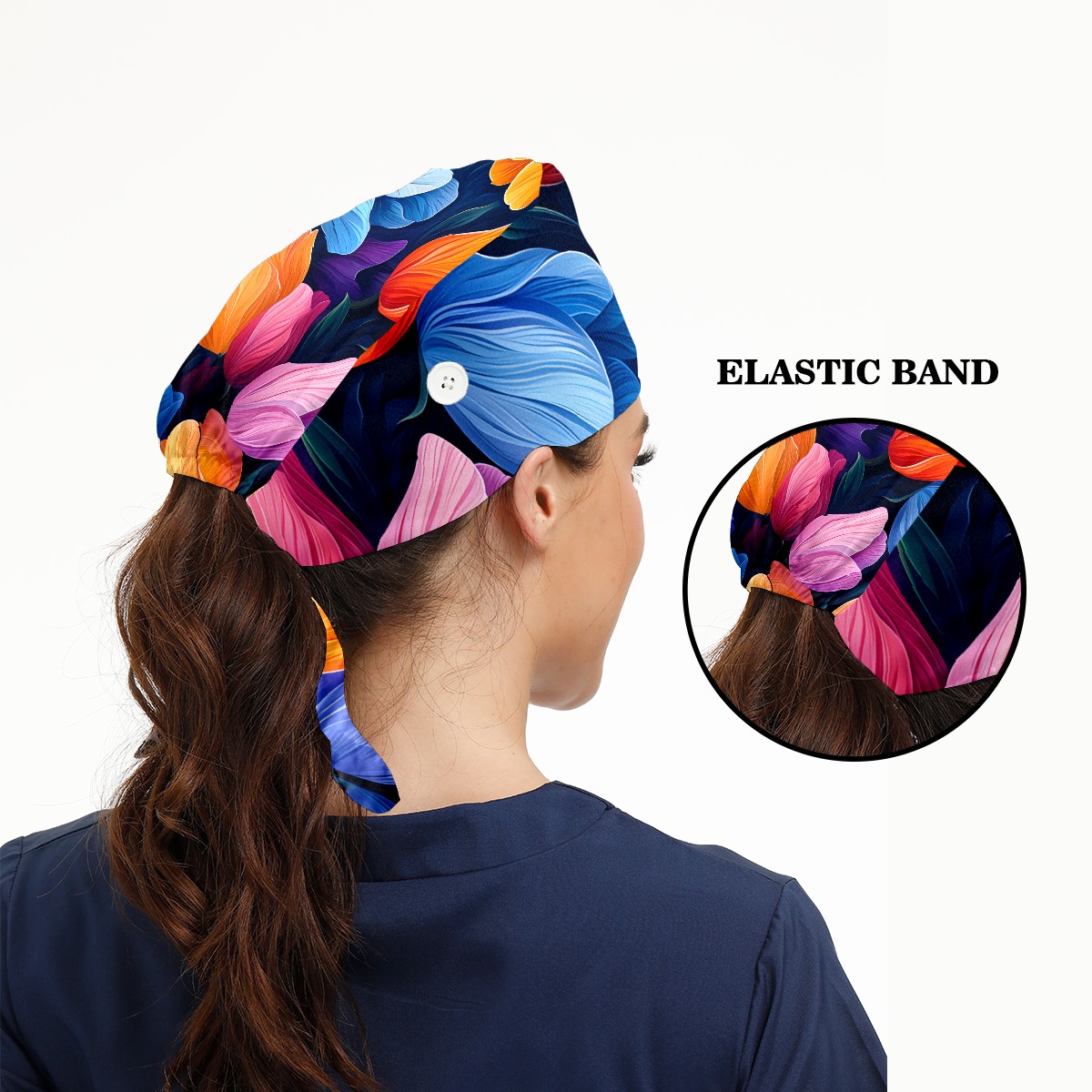 Working Caps with Button&Sweatband Satin Lined Cotton Adjustable Nurse Hats Elastic Band Scrub Cap Surgeon Hat Tulip Flowers F