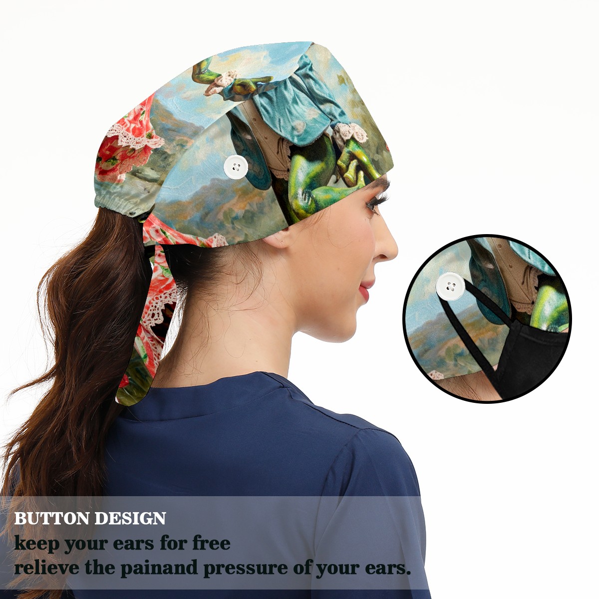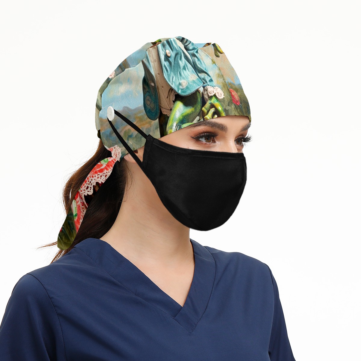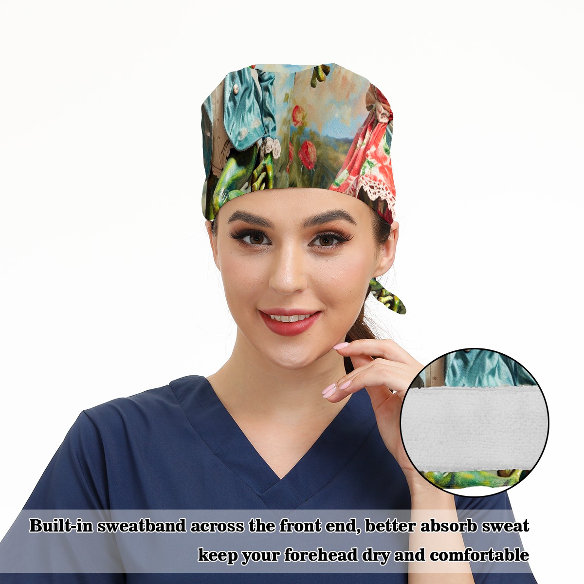 Working Caps with Button&Sweatband Satin Lined Cotton Adjustable Nurse Hats Elastic Band Scrub Cap Surgeon Hat Frog