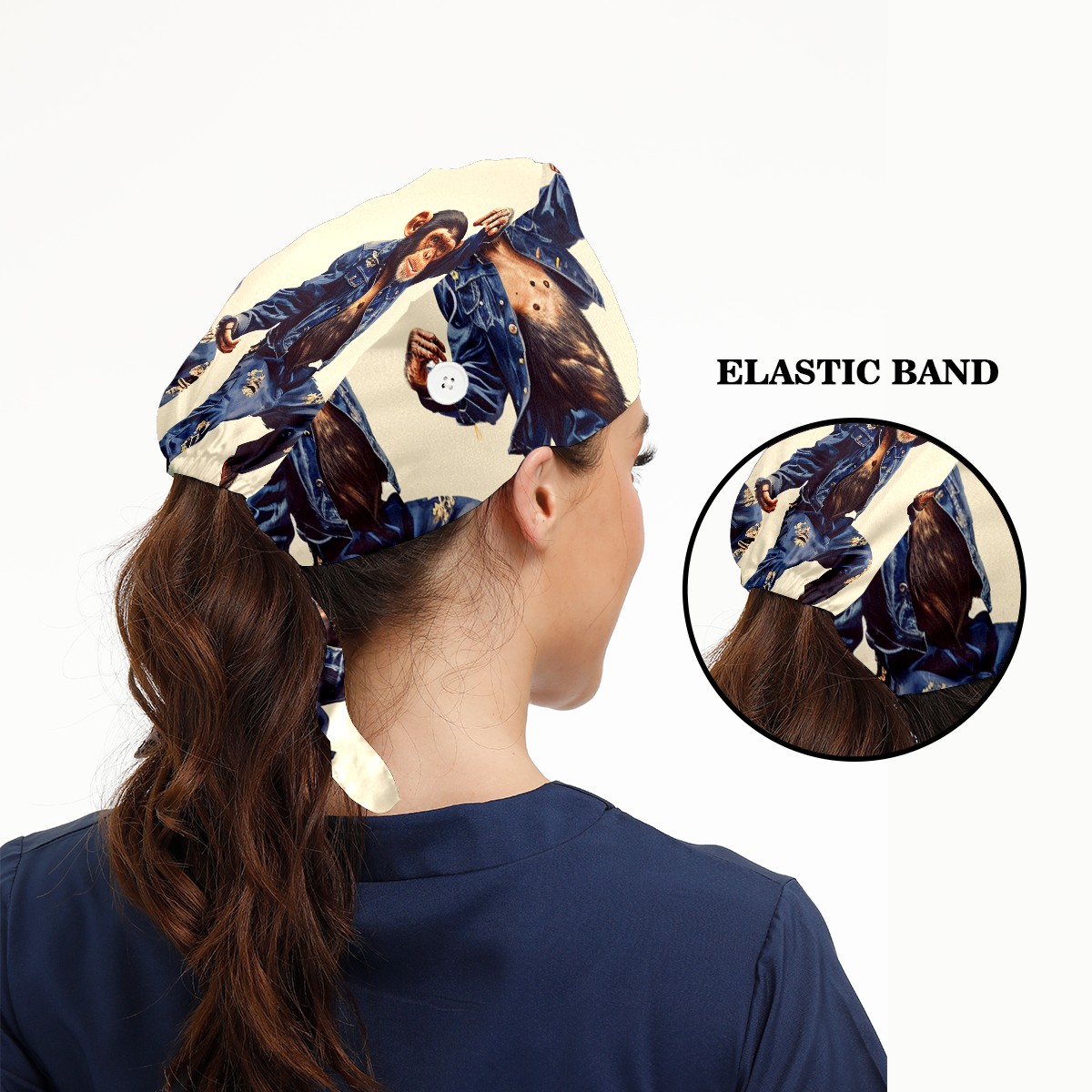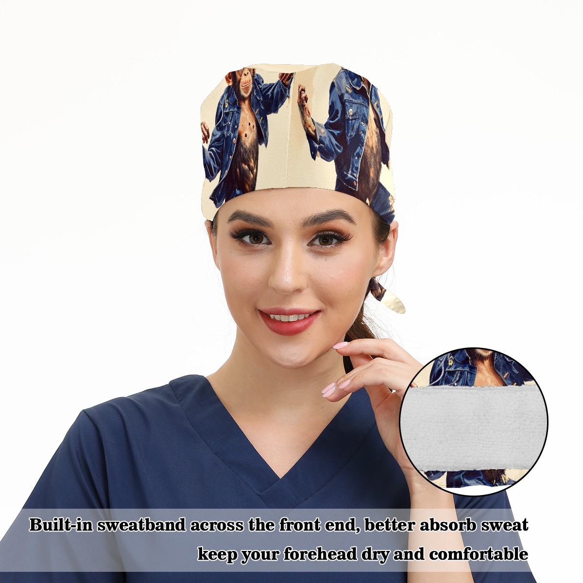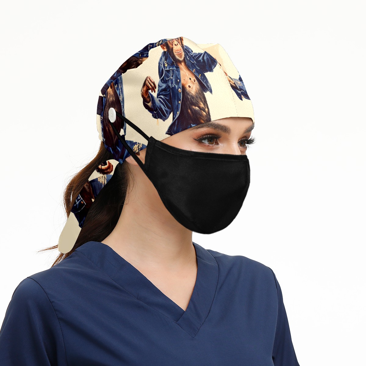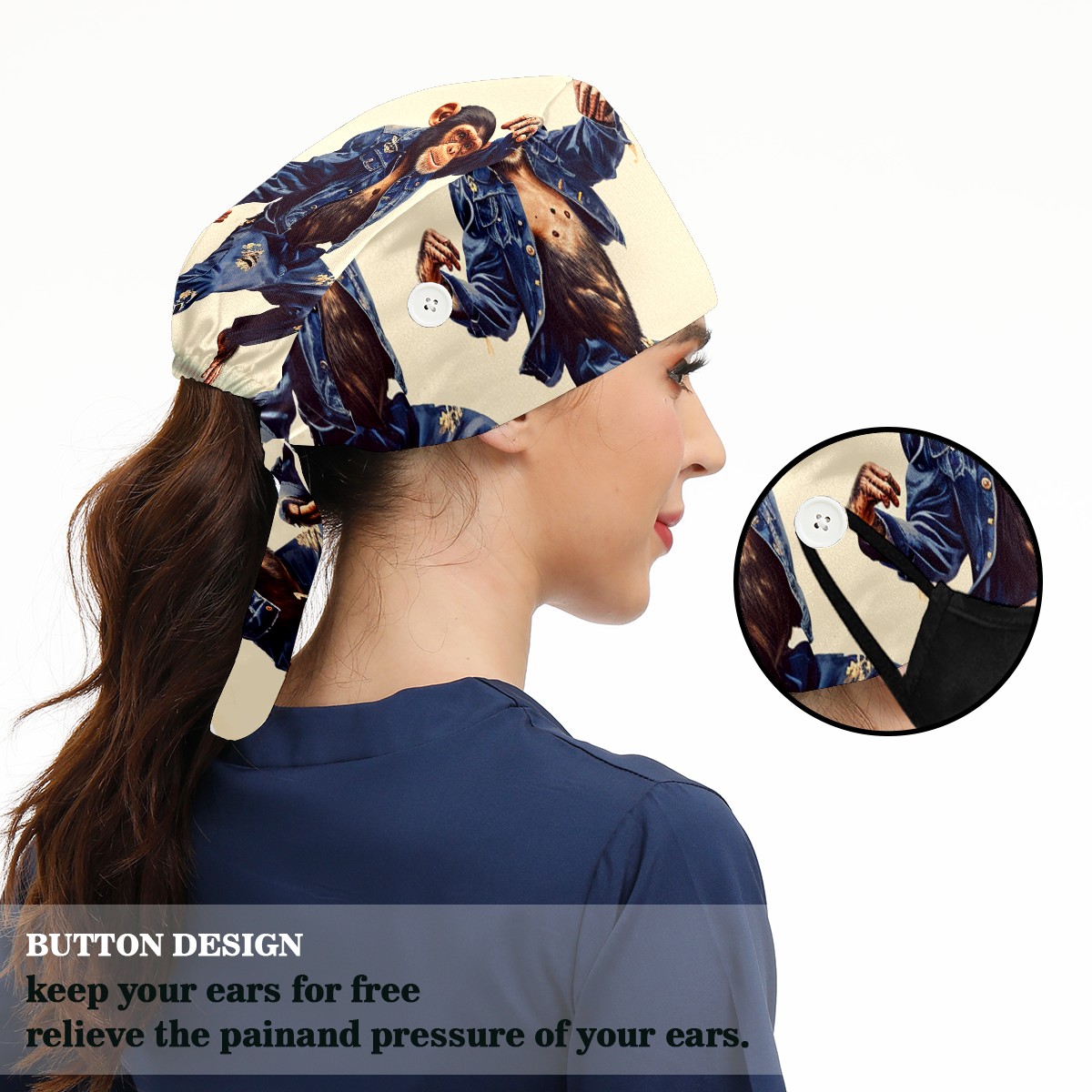Working Caps with Button&Sweatband Satin Lined Cotton Adjustable Nurse Hats Elastic Band Scrub Cap Surgeon Hat Monkey