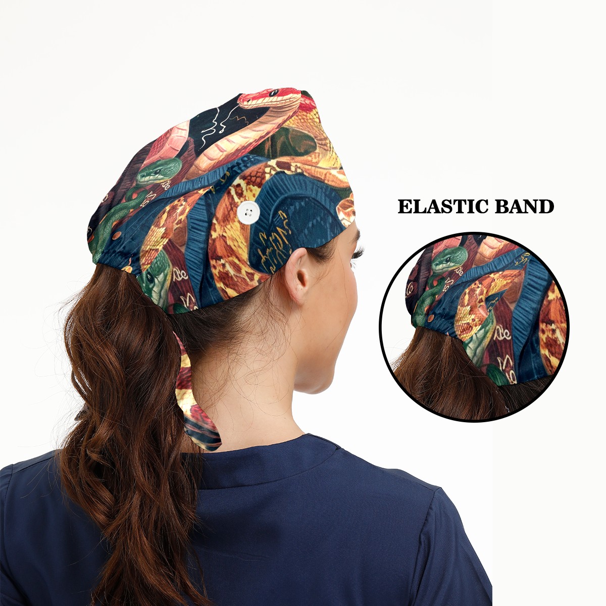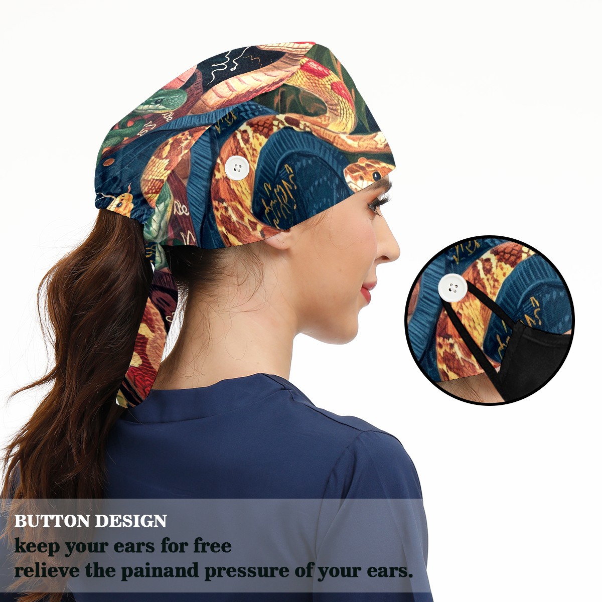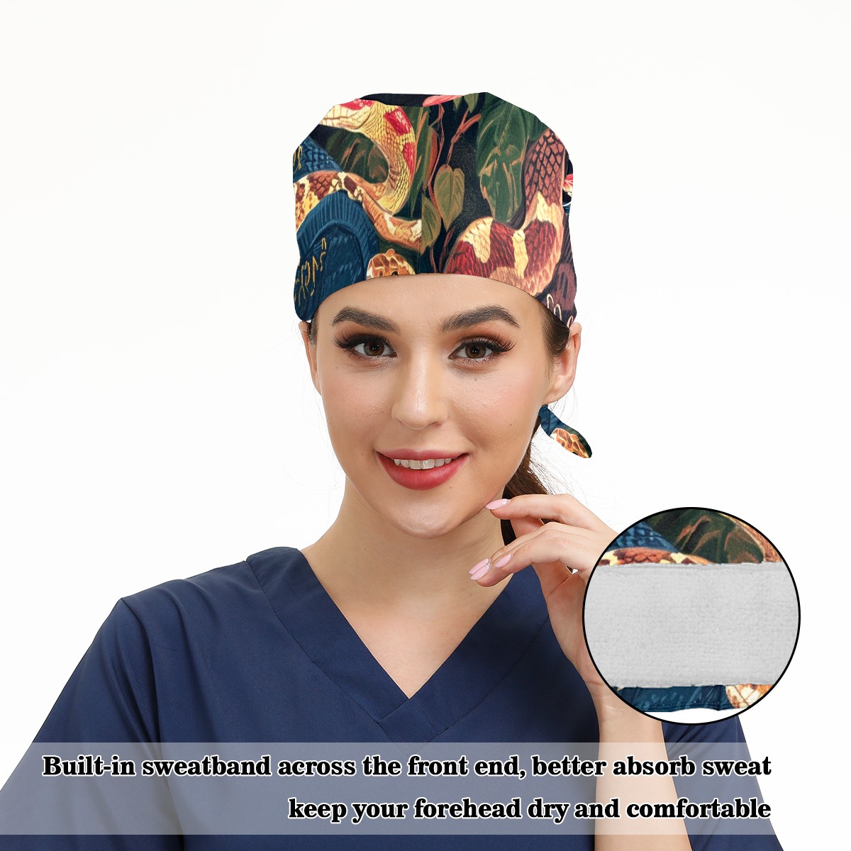 Working Caps with Button&Sweatband Satin Lined Cotton Adjustable Nurse Hats Elastic Band Scrub Cap Surgeon Hat Snake