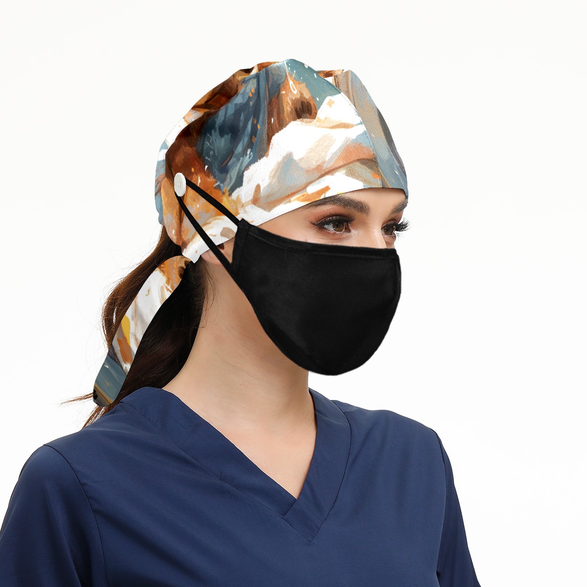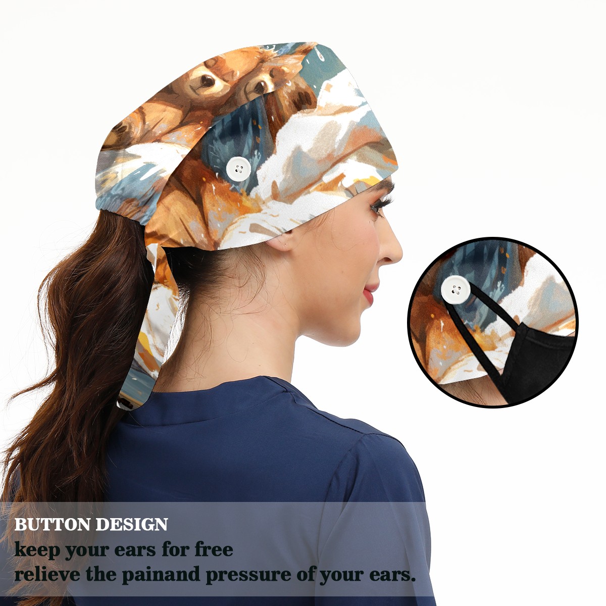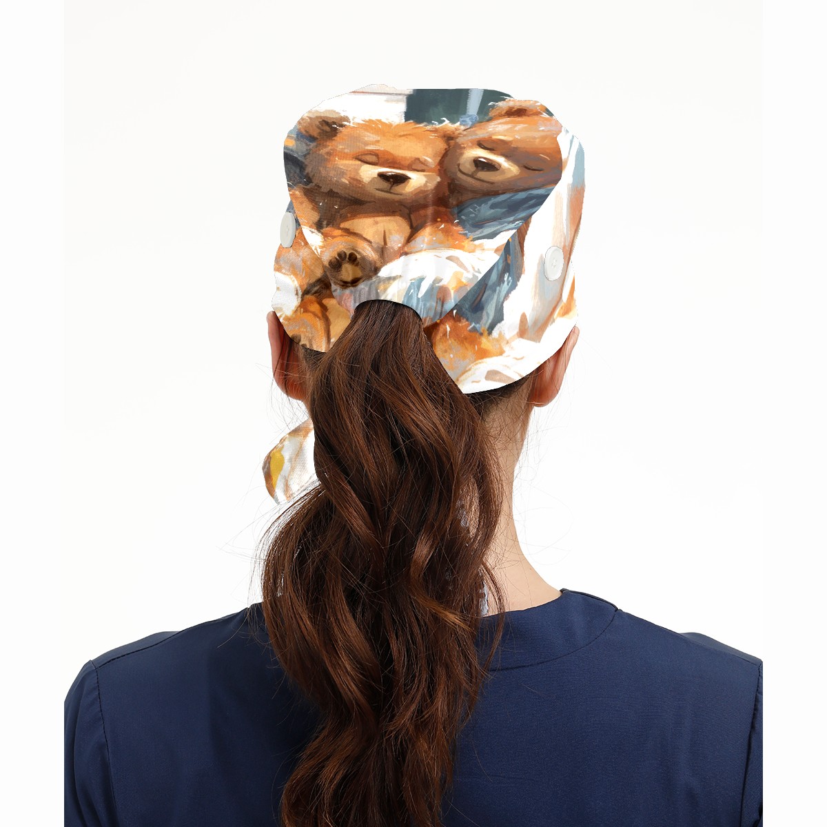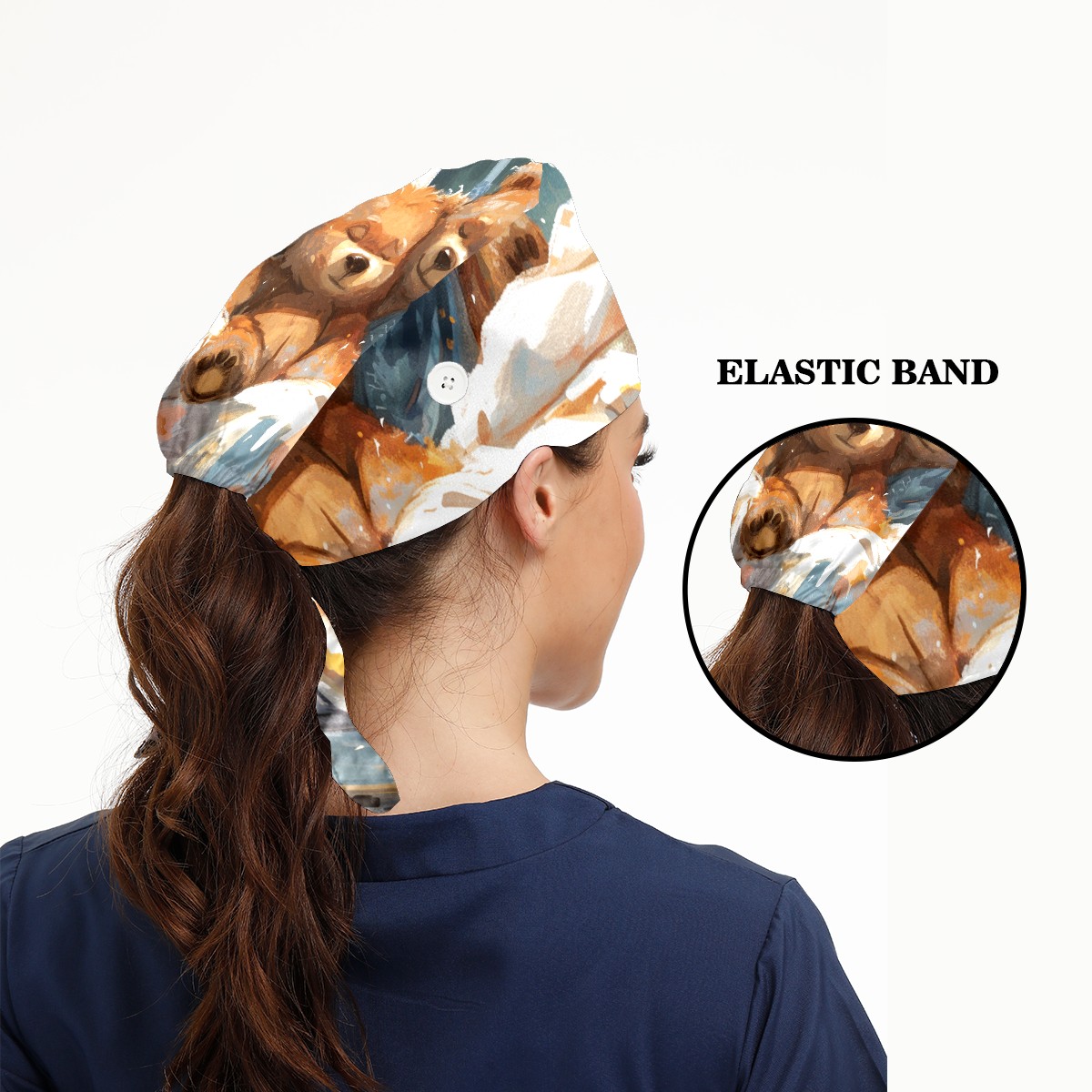 Working Caps with Button&Sweatband Satin Lined Cotton Adjustable Nurse Hats Elastic Band Scrub Cap Surgeon Hat Bear