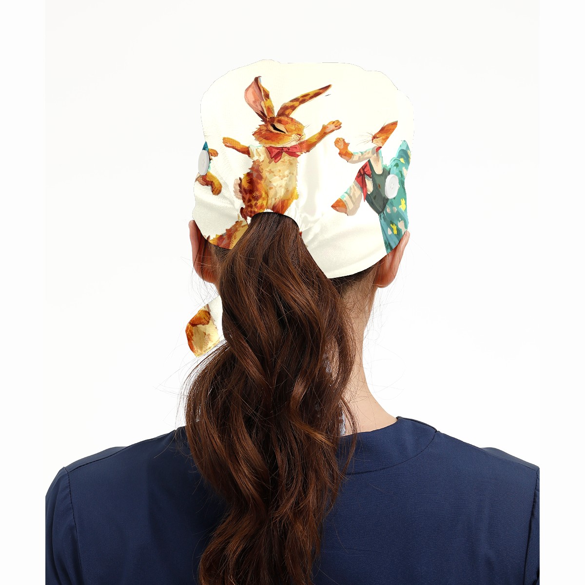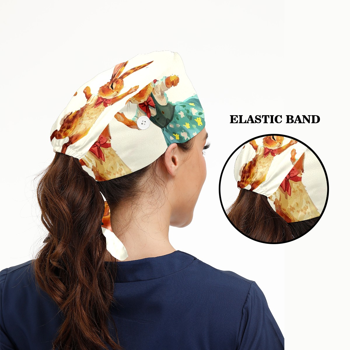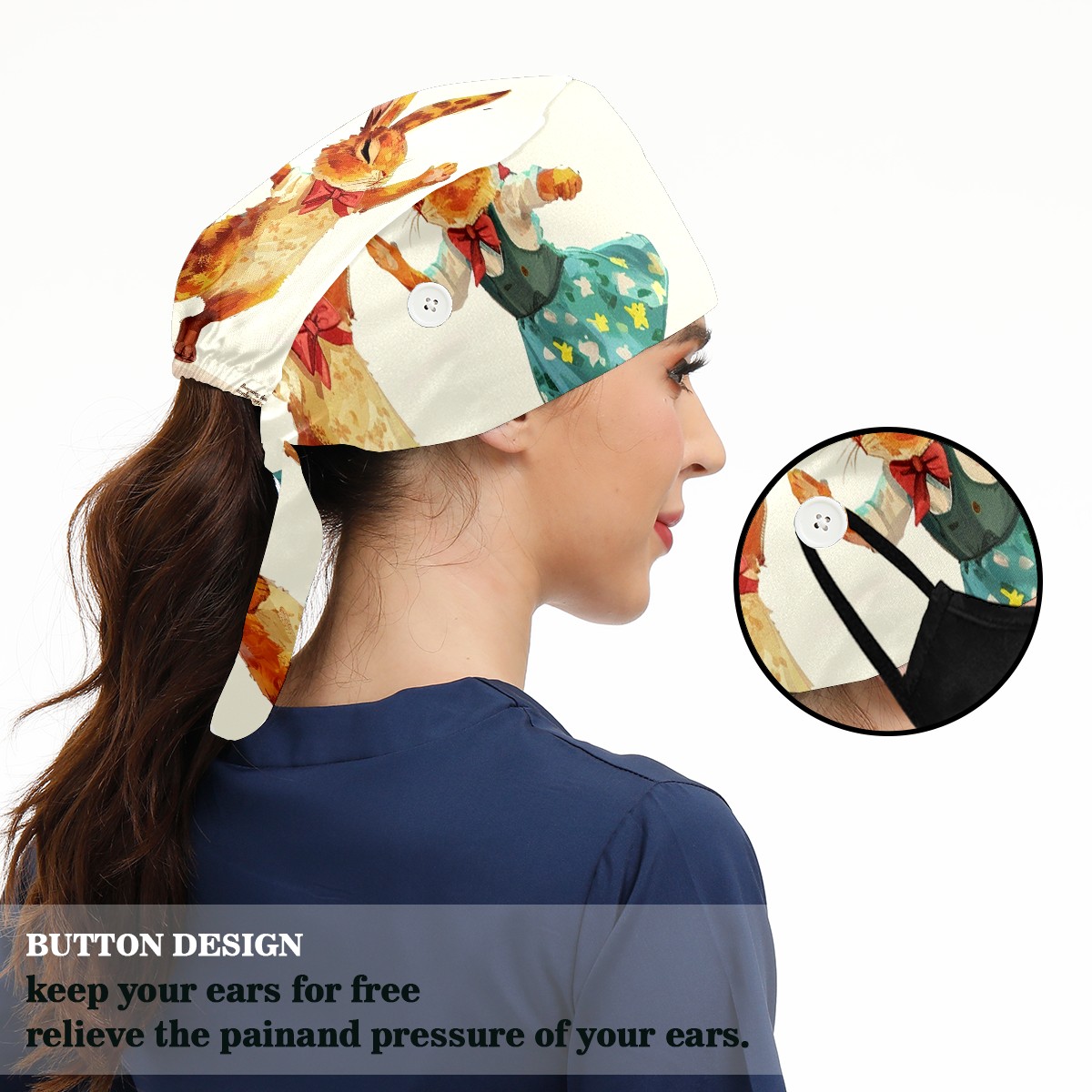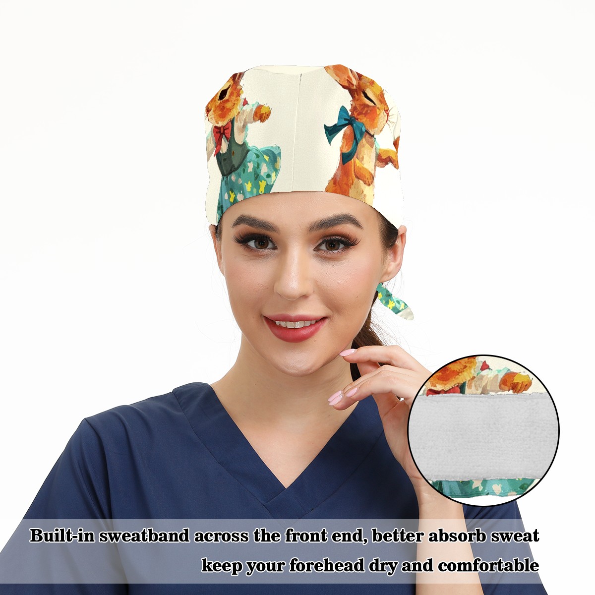 Working Caps with Button&Sweatband Satin Lined Cotton Adjustable Nurse Hats Elastic Band Scrub Cap Surgeon Hat Rabbit