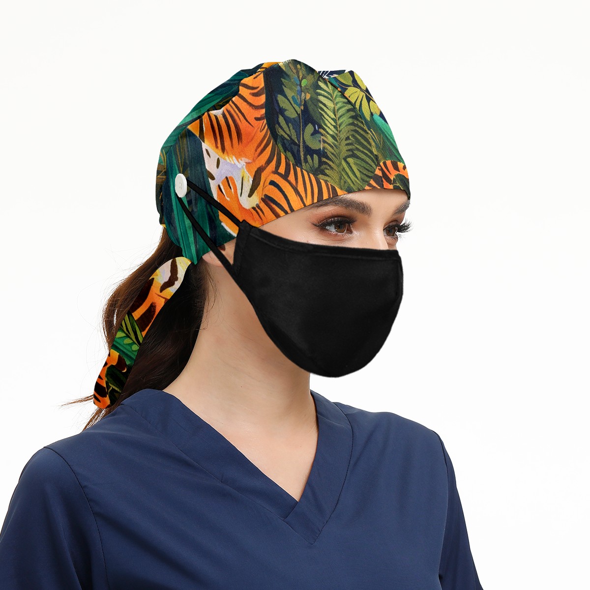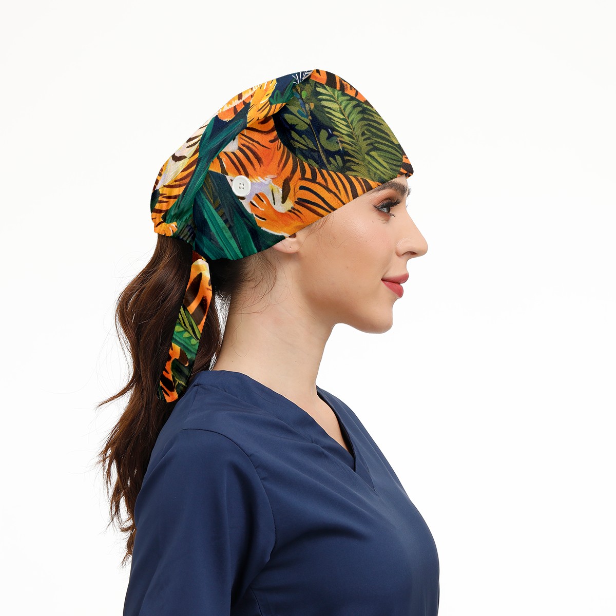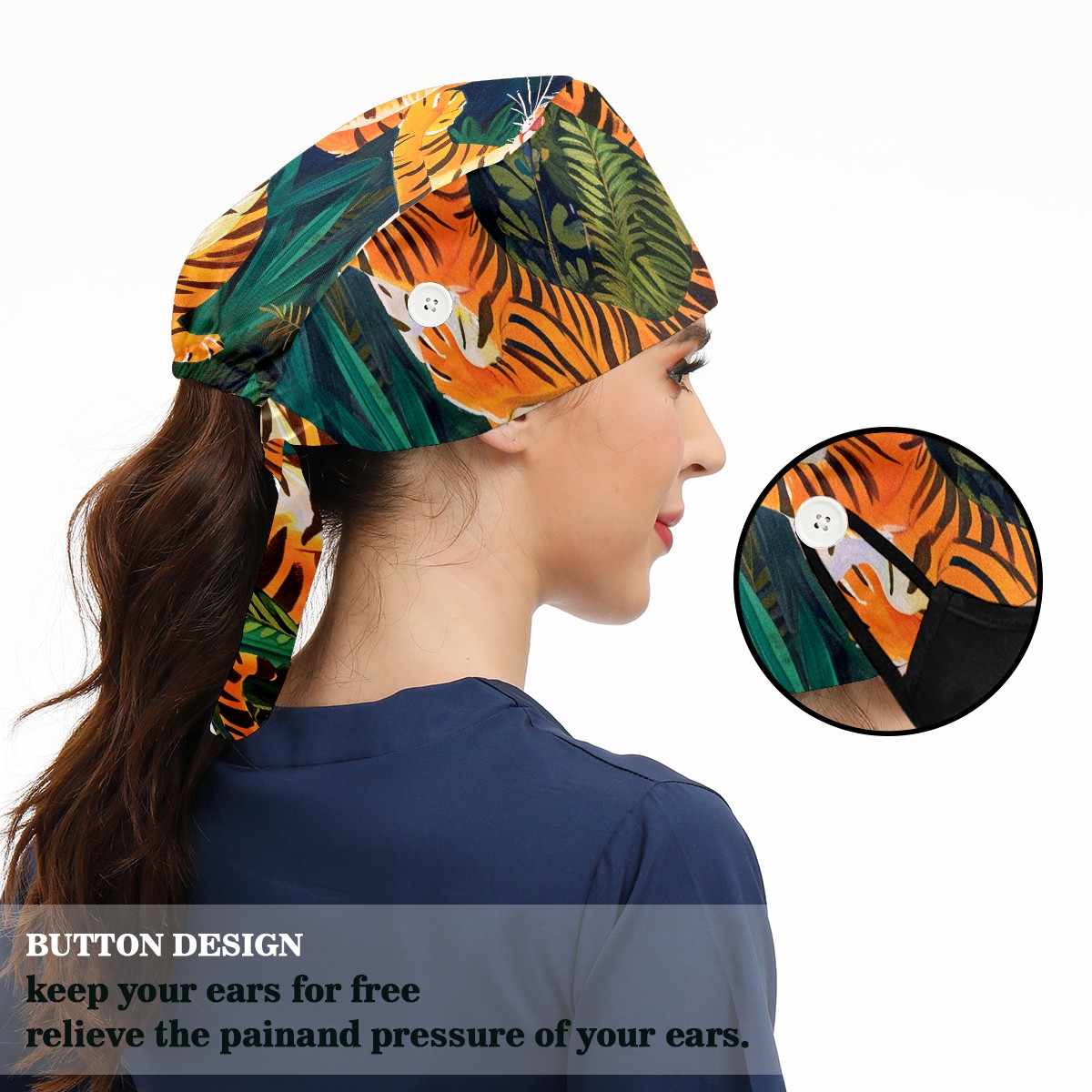 Working Caps with Button&Sweatband Satin Lined Cotton Adjustable Nurse Hats Elastic Band Scrub Cap Surgeon Hat Tiger
