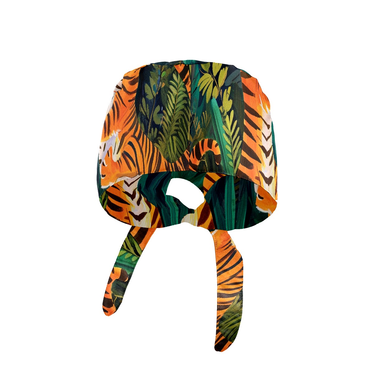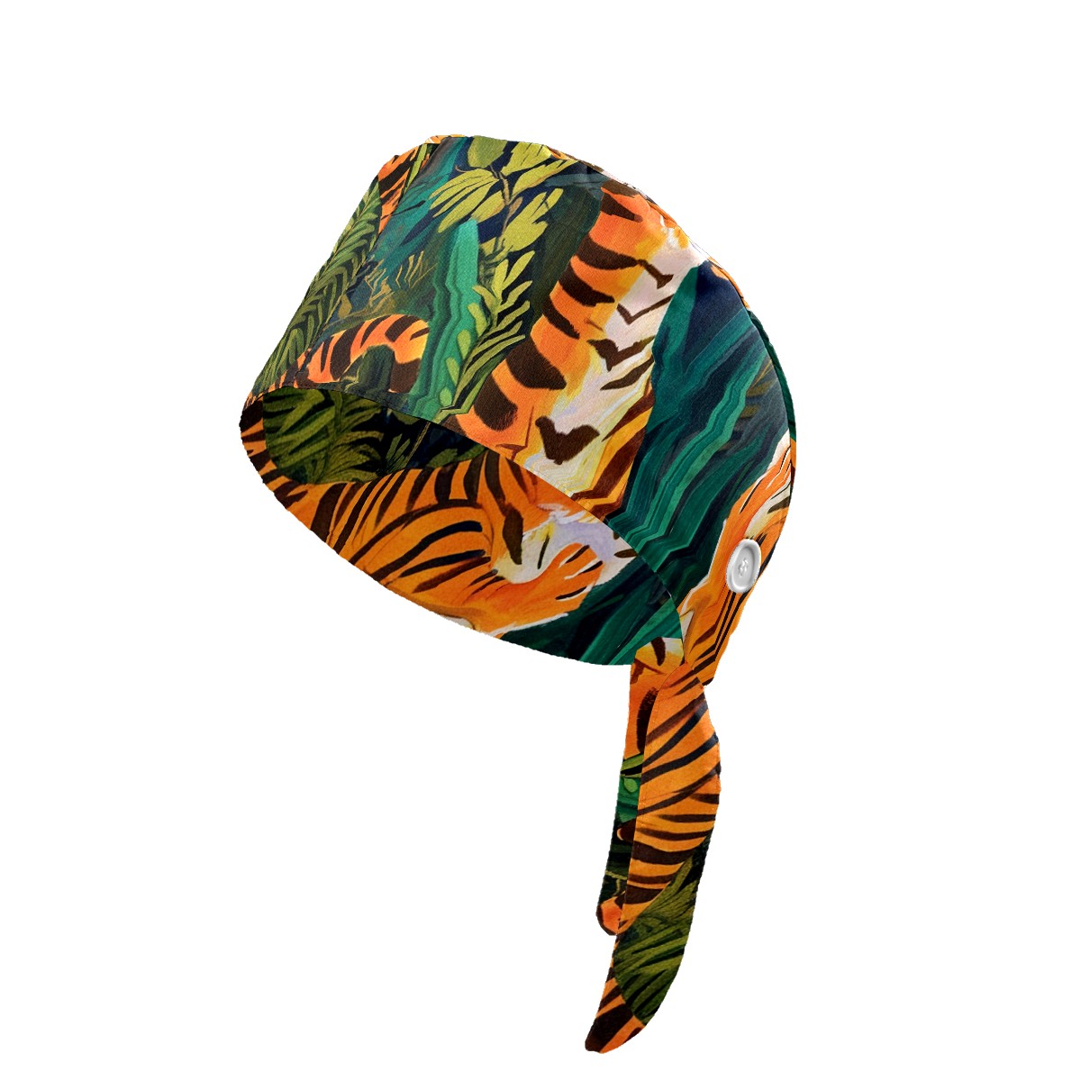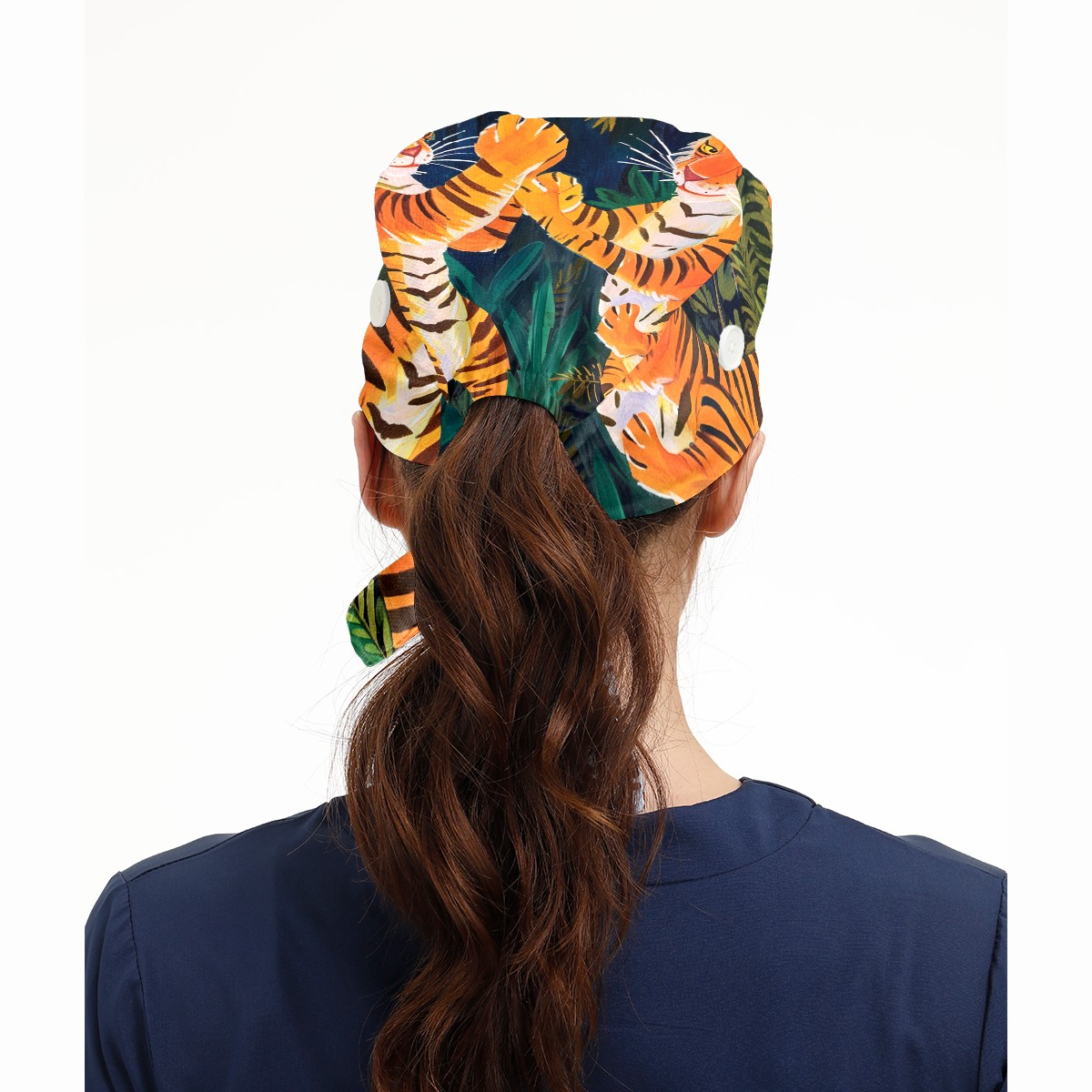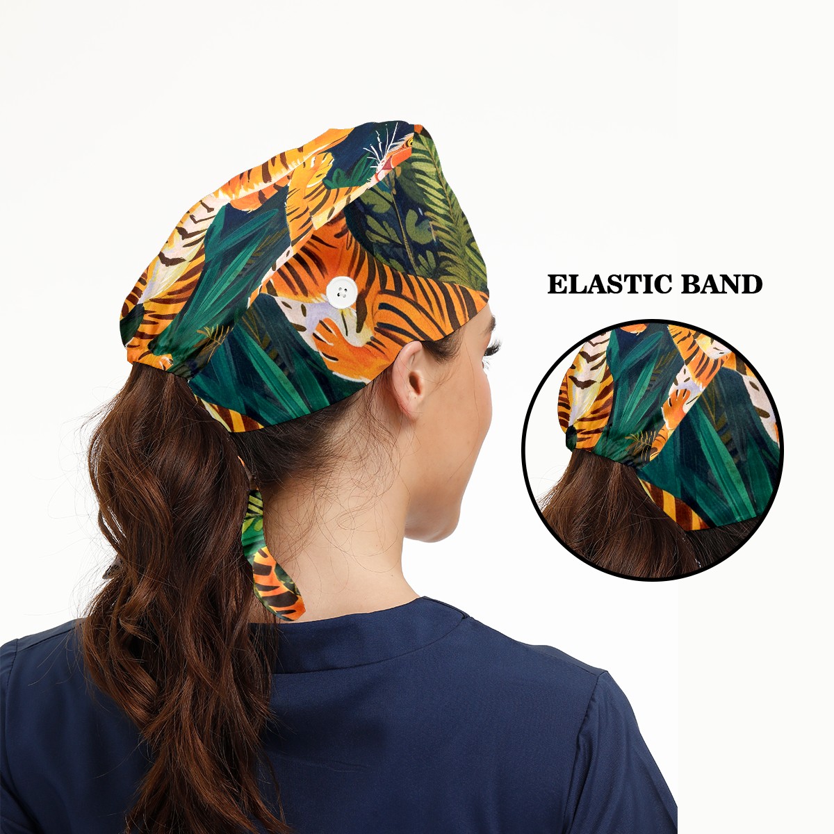Working Caps with Button&Sweatband Satin Lined Cotton Adjustable Nurse Hats Elastic Band Scrub Cap Surgeon Hat Tiger