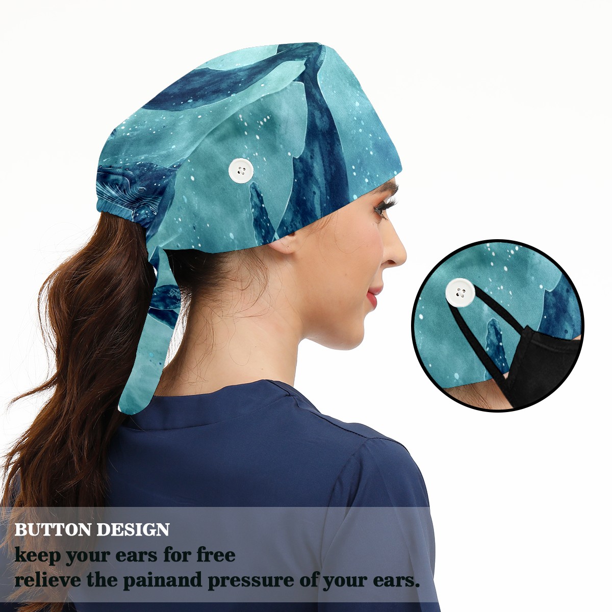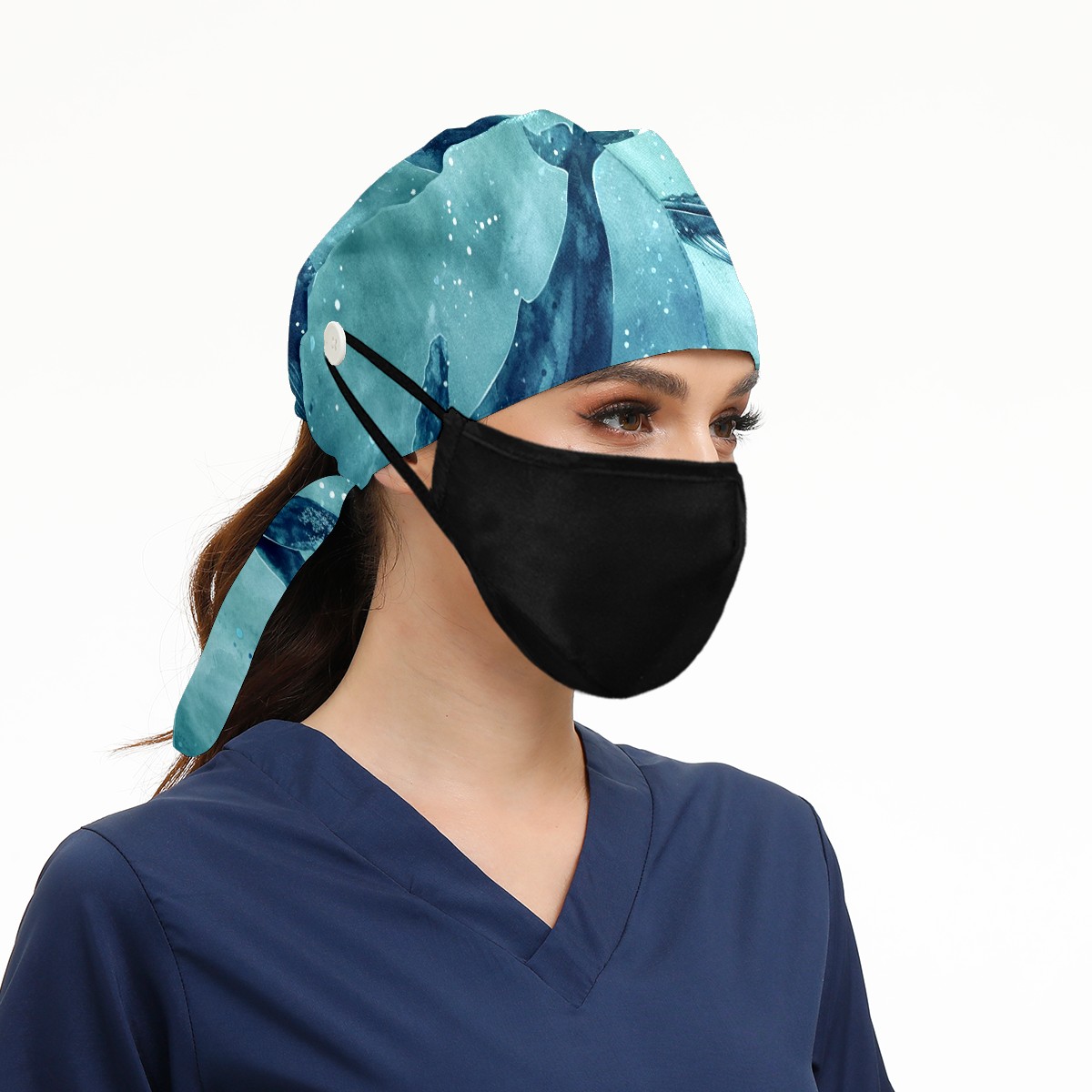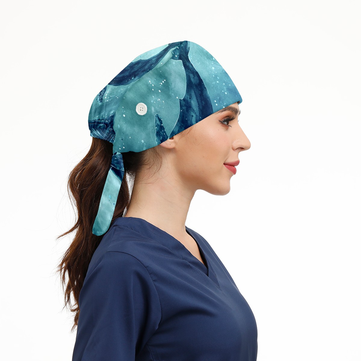 Working Caps with Button&Sweatband Satin Lined Cotton Adjustable Nurse Hats Elastic Band Scrub Cap Surgeon Hat Fish
