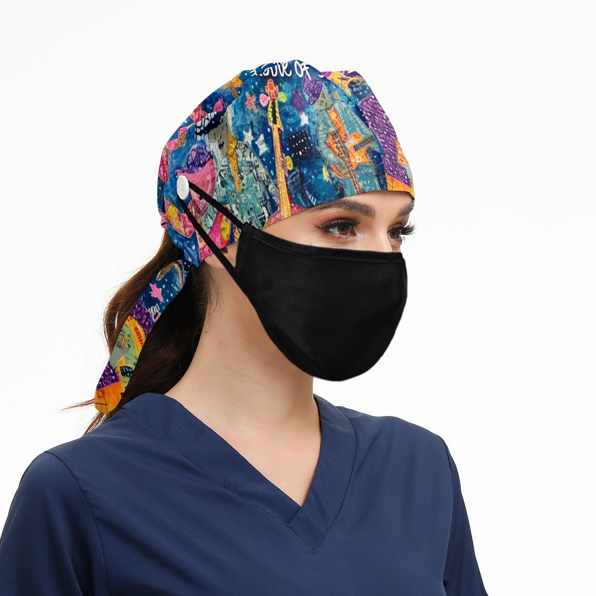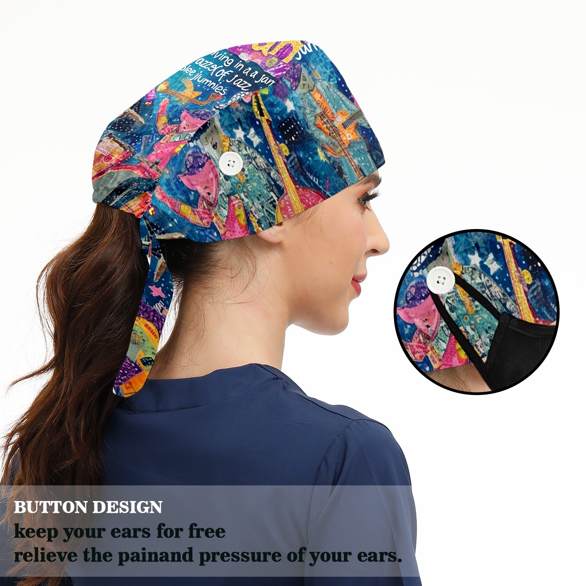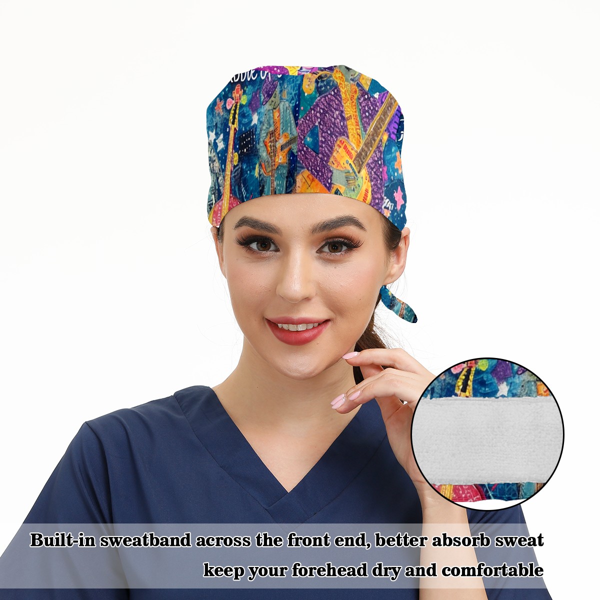 Working Caps with Button&Sweatband Satin Lined Cotton Adjustable Nurse Hats Elastic Band Scrub Cap Surgeon Hat Guitar
