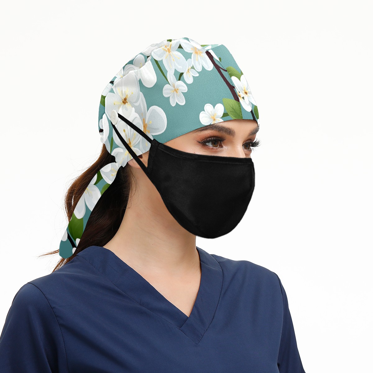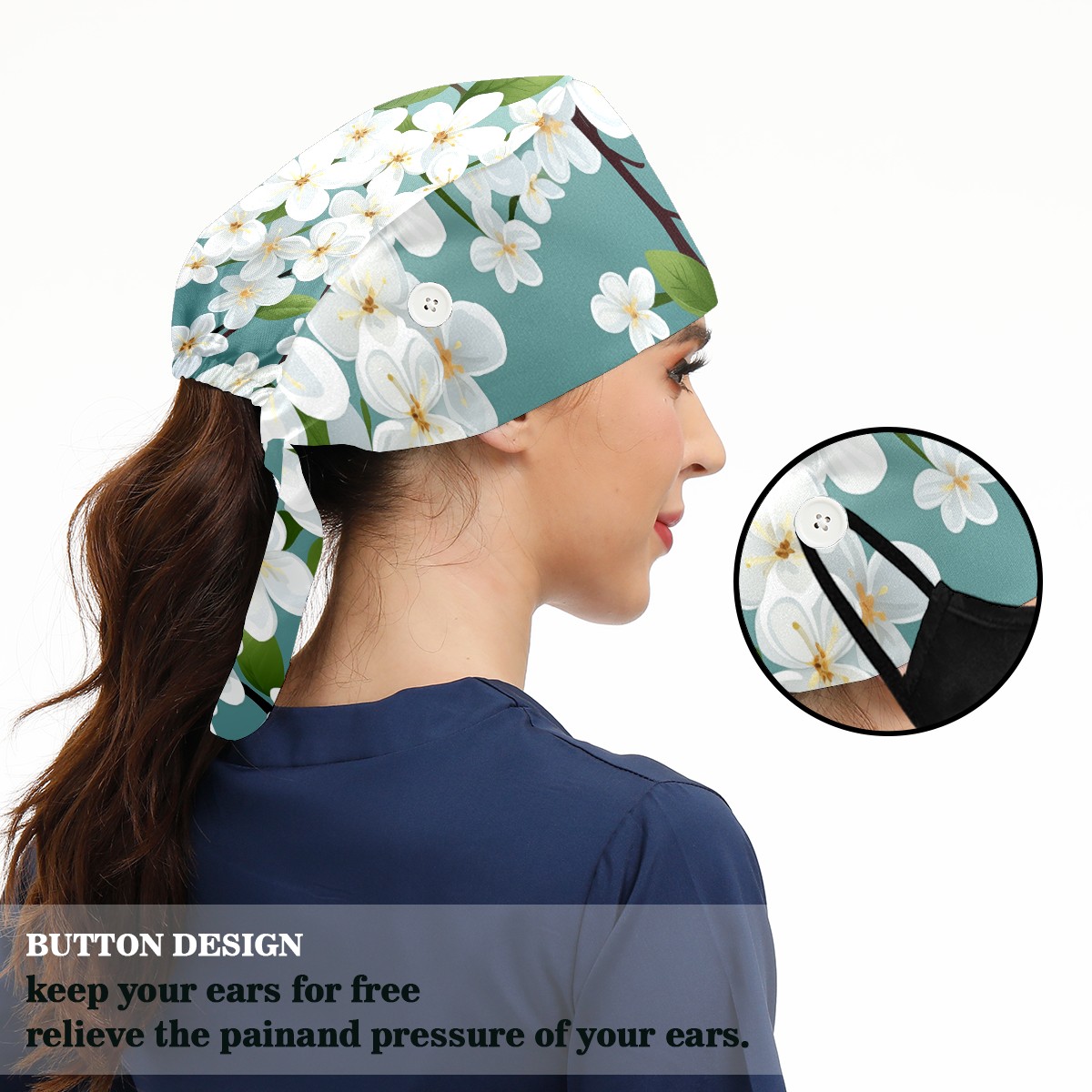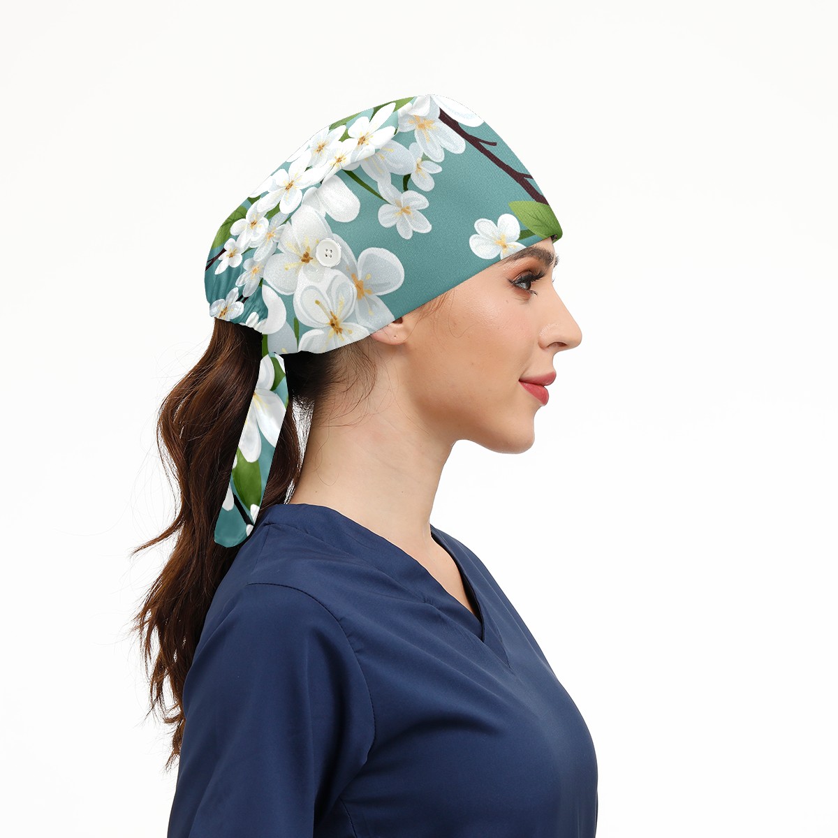 Working Caps with Button&Sweatband Satin Lined Cotton Adjustable Nurse Hats Elastic Band Scrub Cap Surgeon Hat Pretty Flowers A