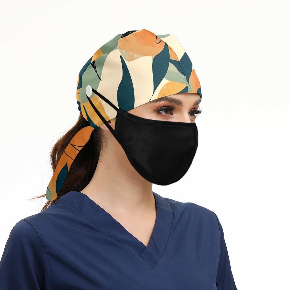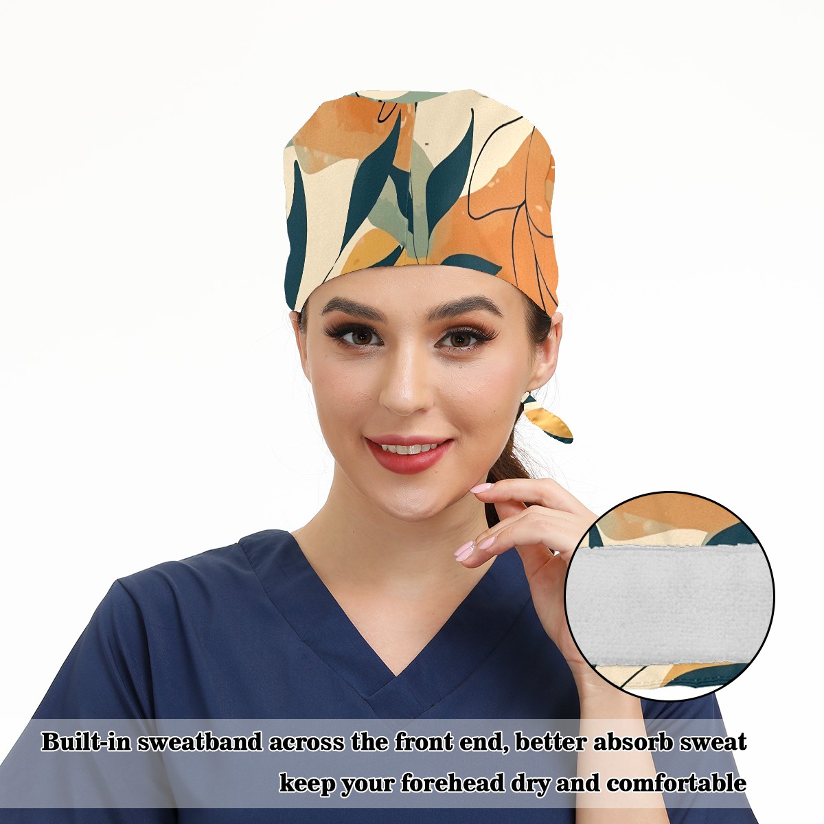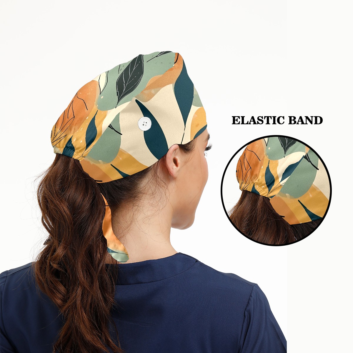 Working Caps with Button&Sweatband Satin Lined Cotton Adjustable Nurse Hats Elastic Band Scrub Cap Surgeon Hat Leaf