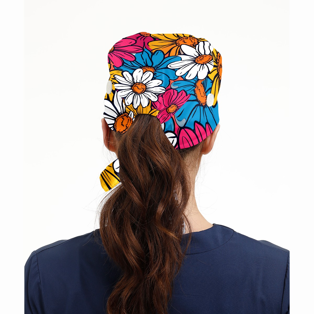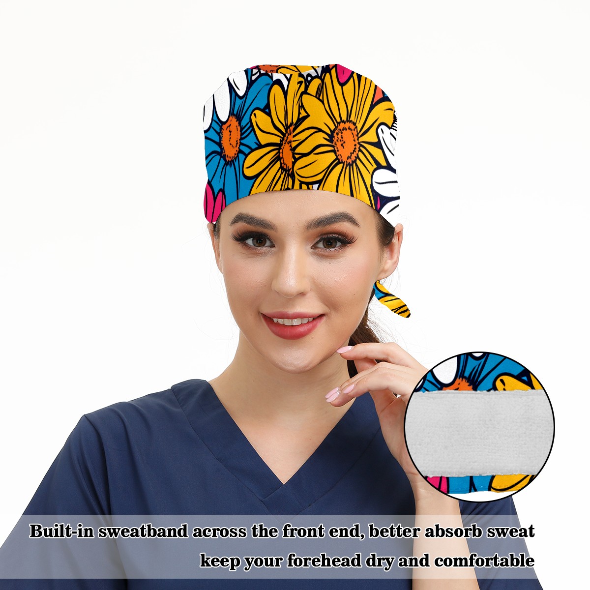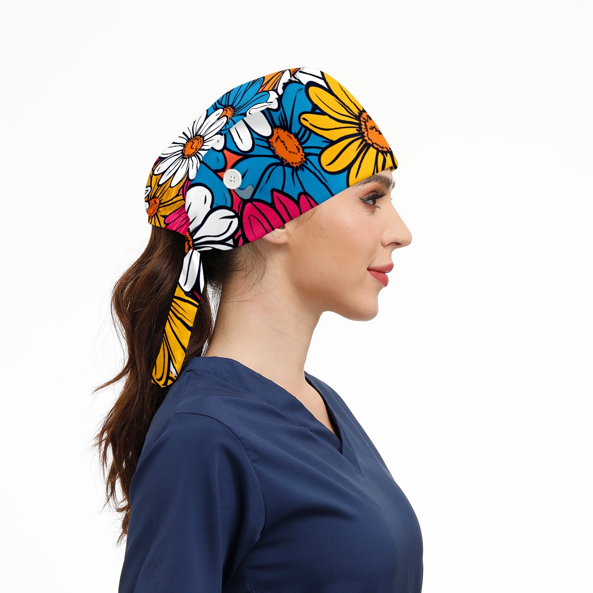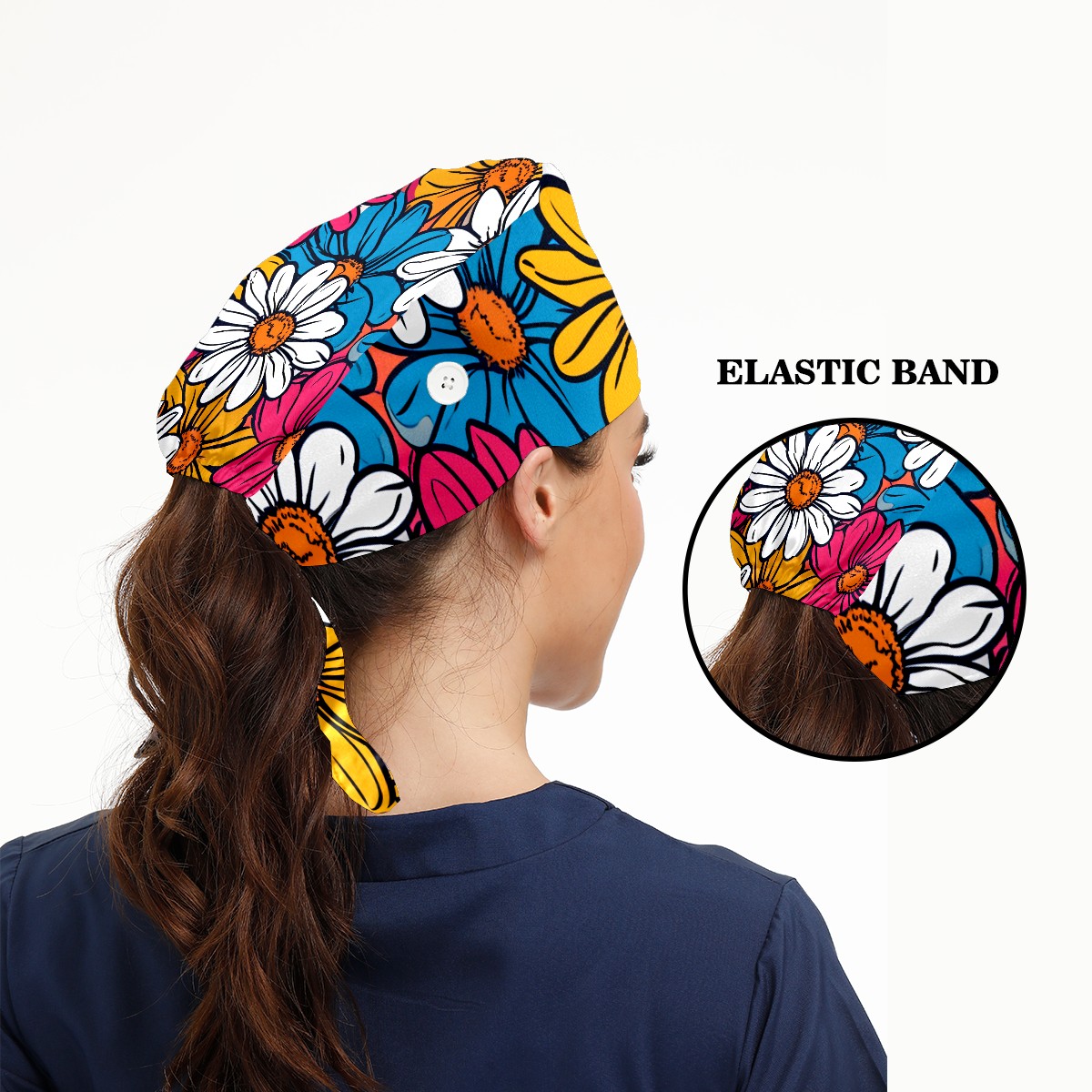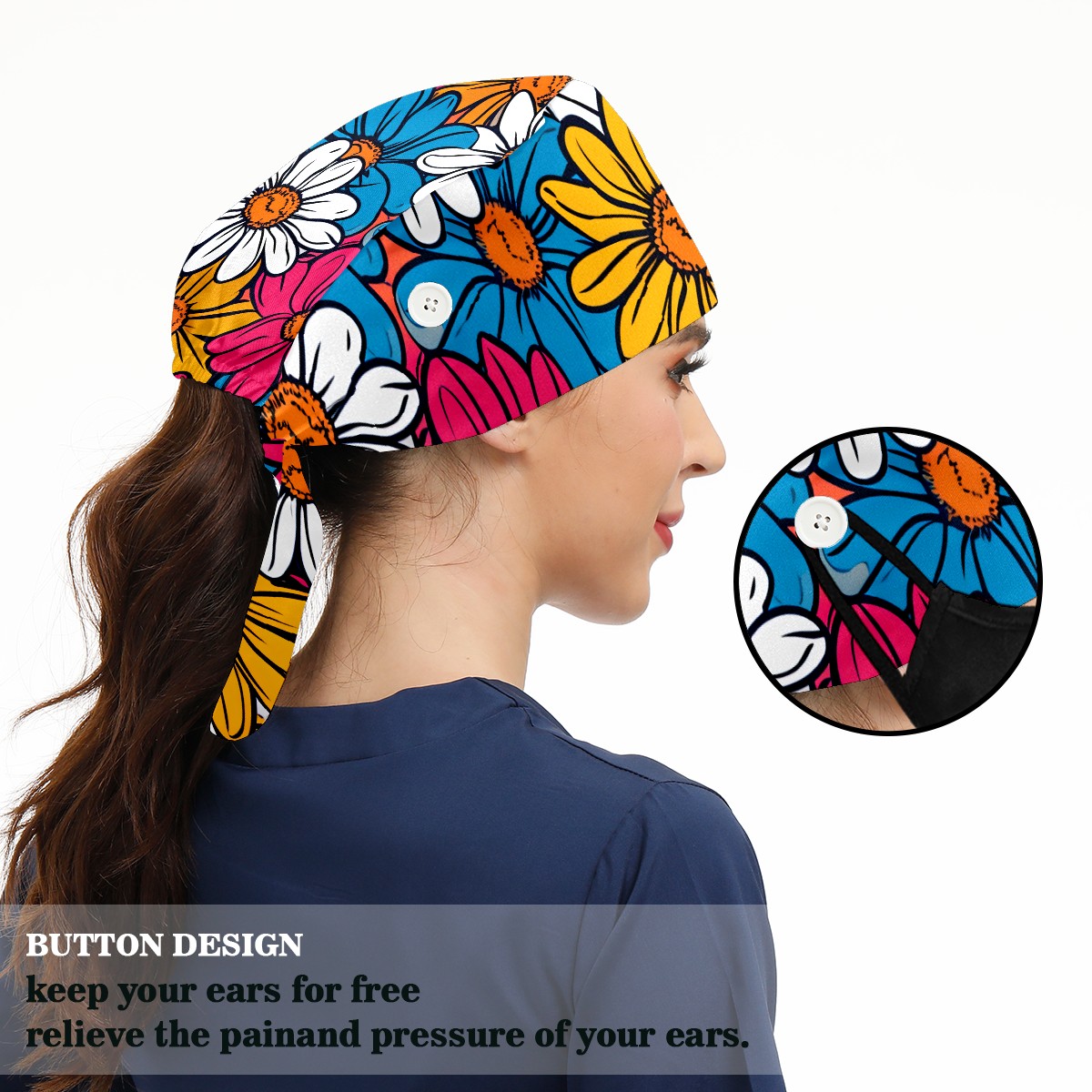 Working Caps with Button&Sweatband Satin Lined Cotton Adjustable Nurse Hats Elastic Band Scrub Cap Surgeon Hat Daisy Flower