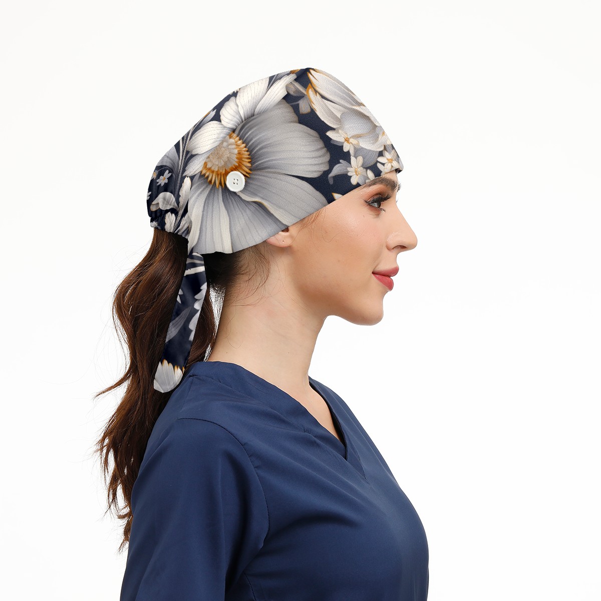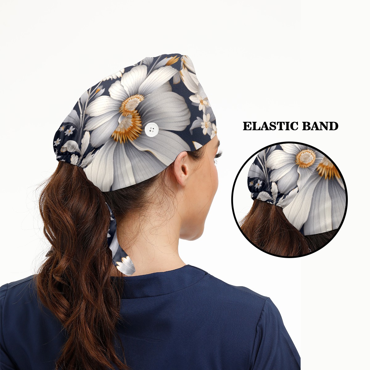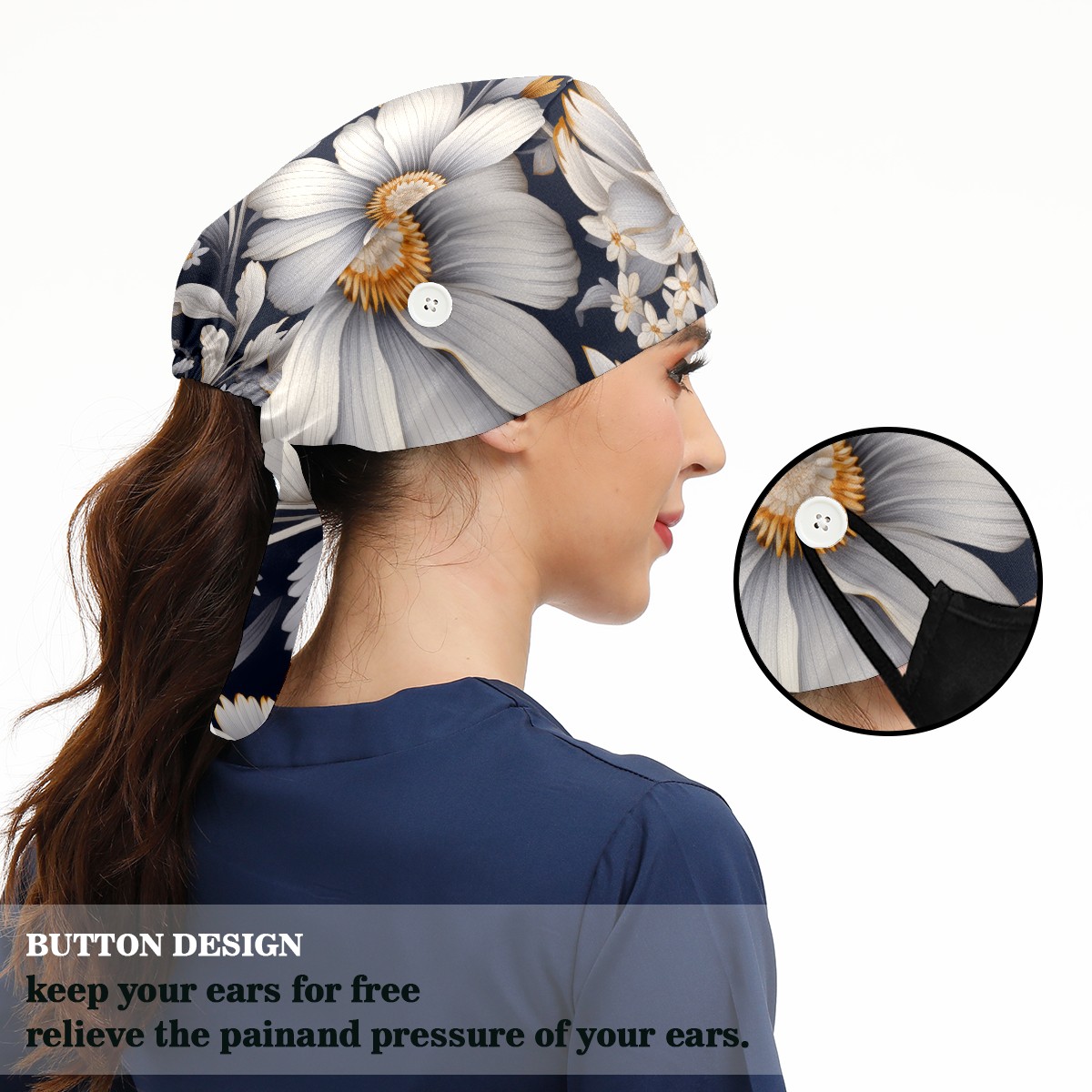 Working Caps with Button&Sweatband Satin Lined Cotton Adjustable Nurse Hats Elastic Band Scrub Cap Surgeon Hat Cute Flower A