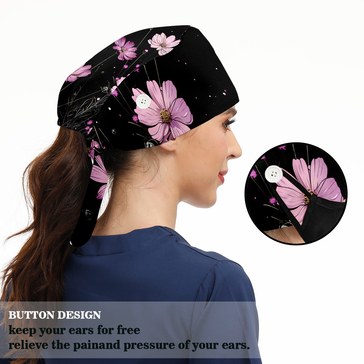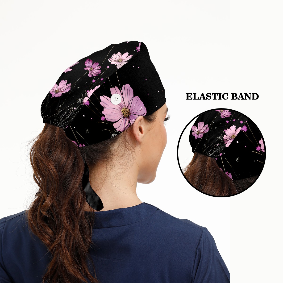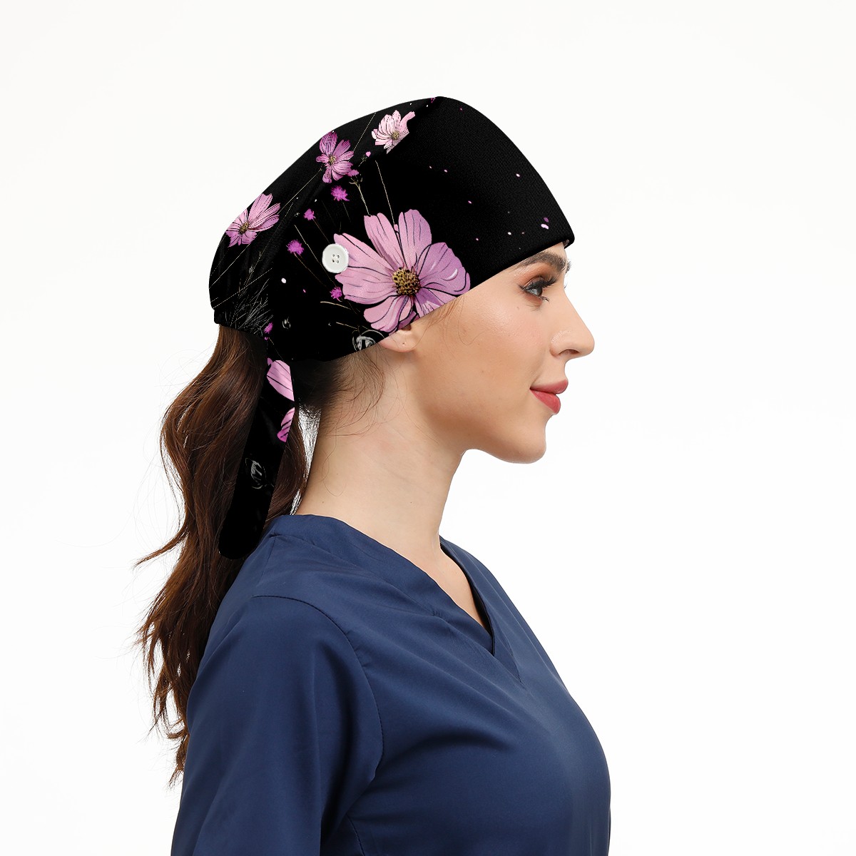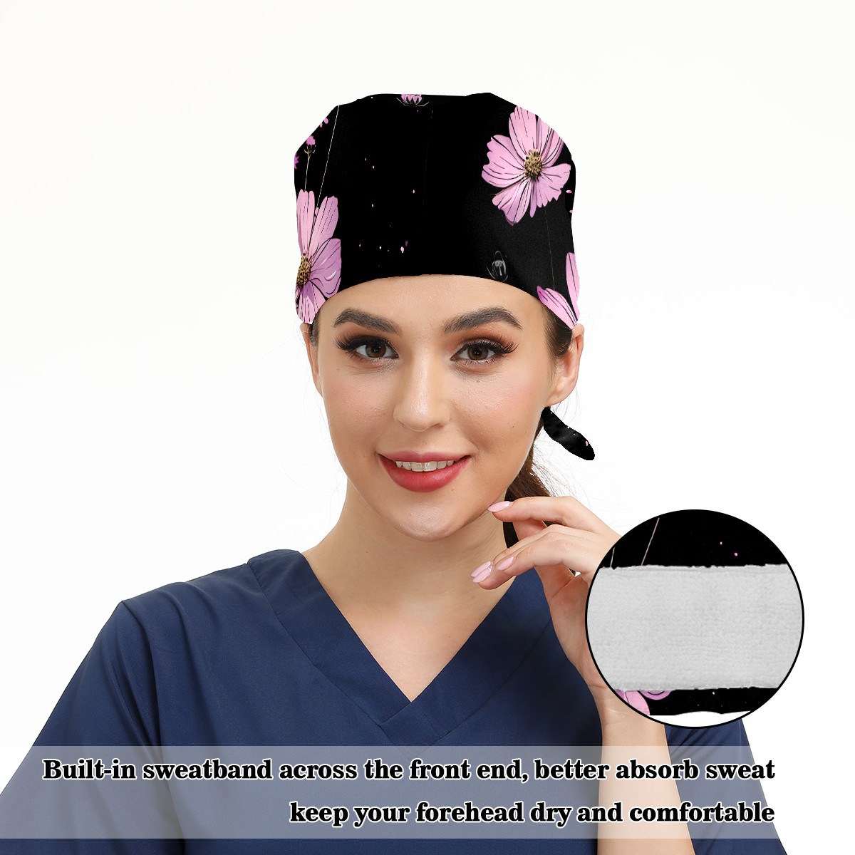 Working Caps with Button&Sweatband Satin Lined Cotton Adjustable Nurse Hats Elastic Band Scrub Cap Surgeon Hat Cute Bouquet C