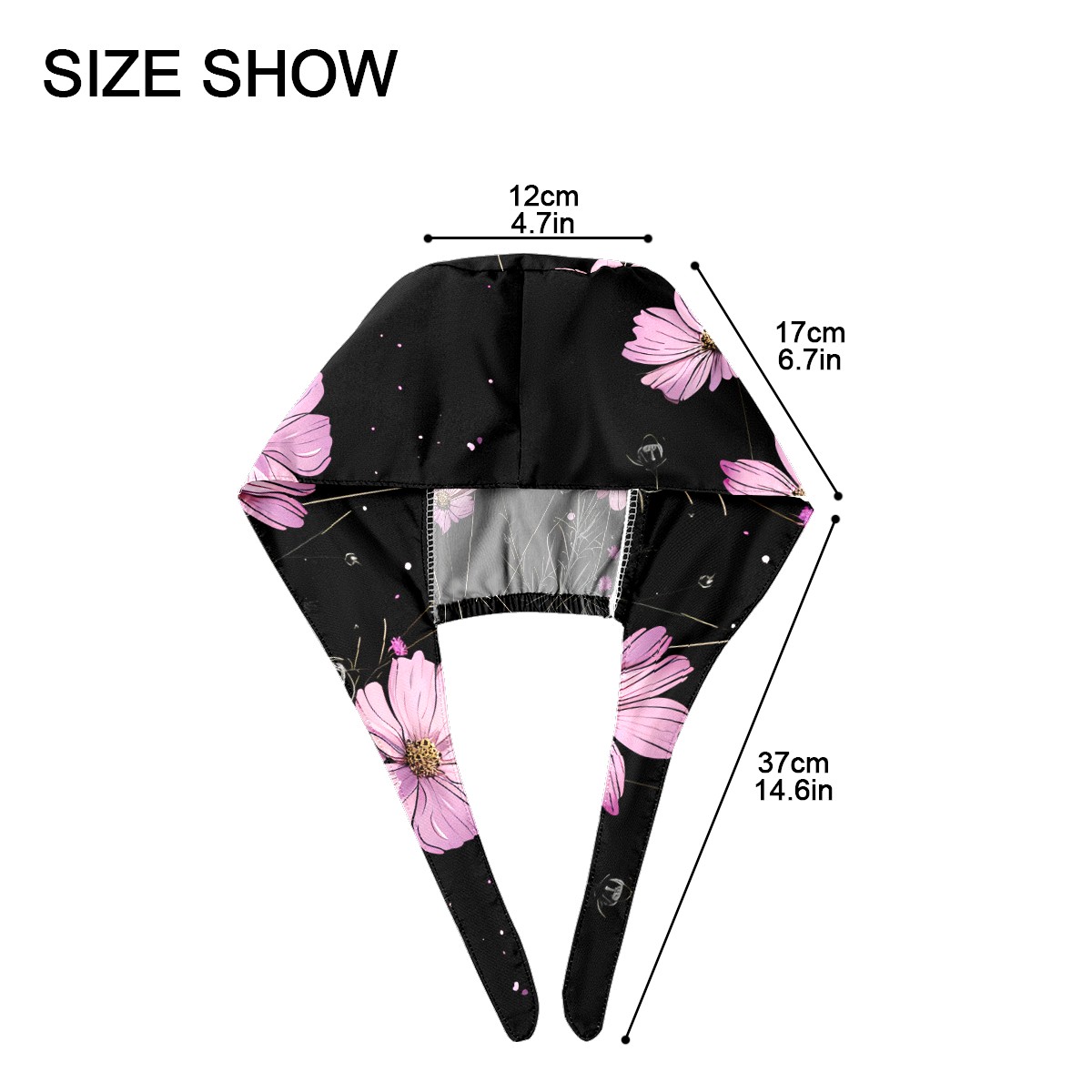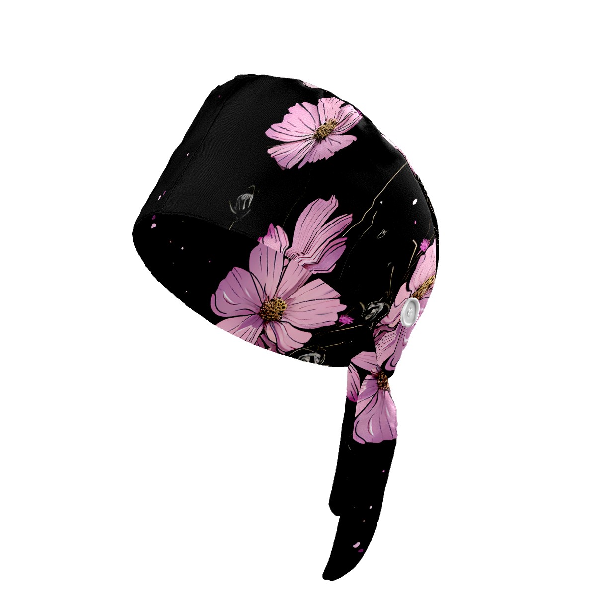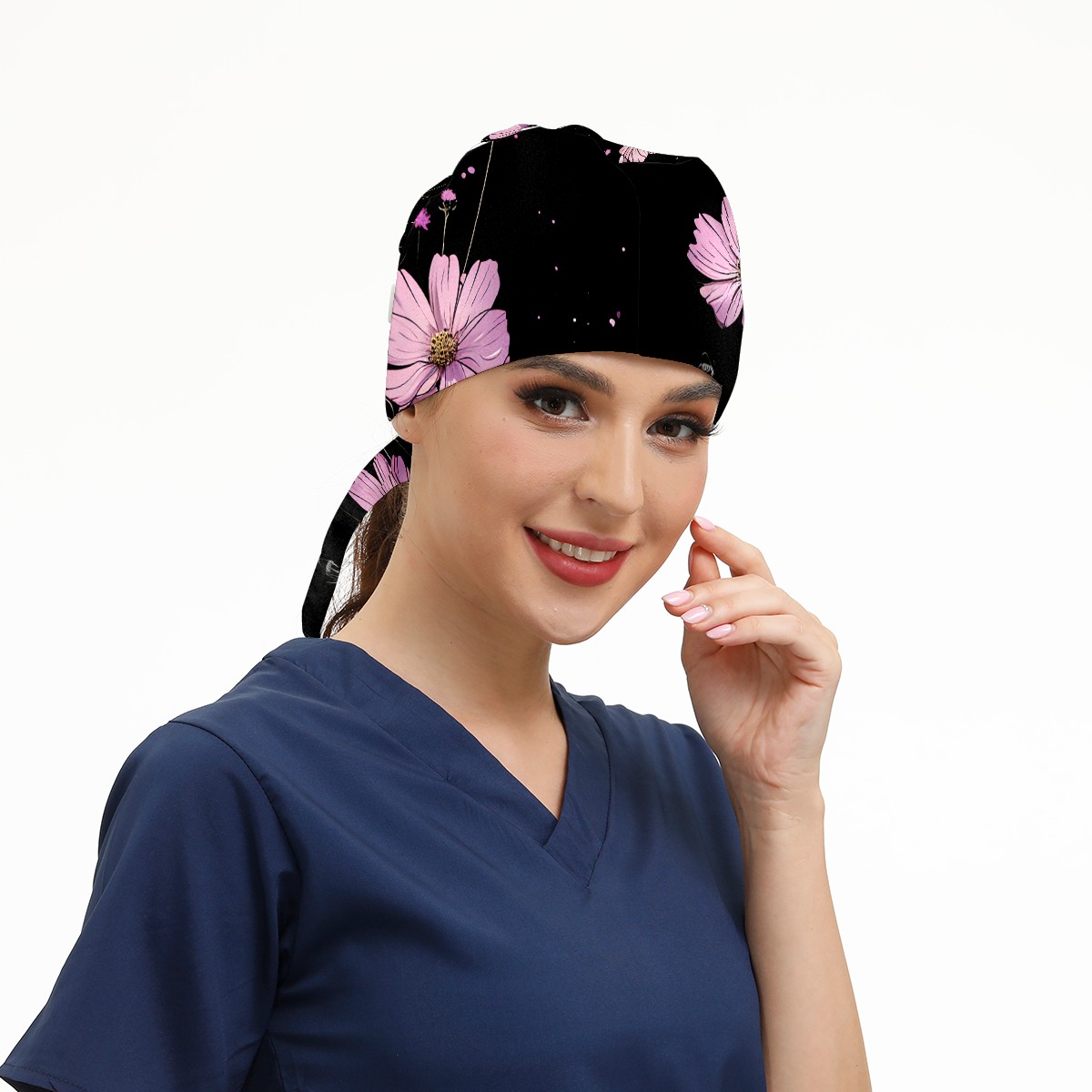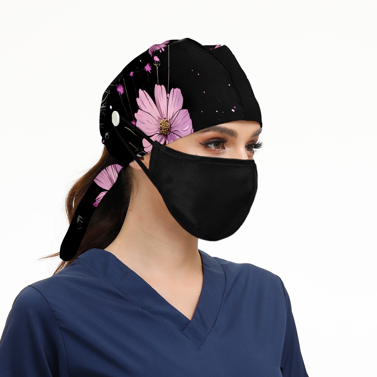 Working Caps with Button&Sweatband Satin Lined Cotton Adjustable Nurse Hats Elastic Band Scrub Cap Surgeon Hat Cute Bouquet C