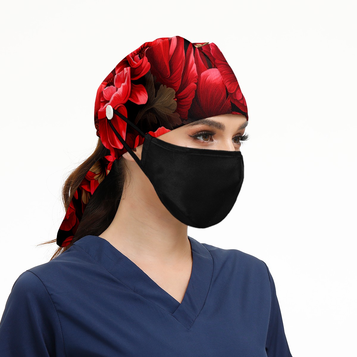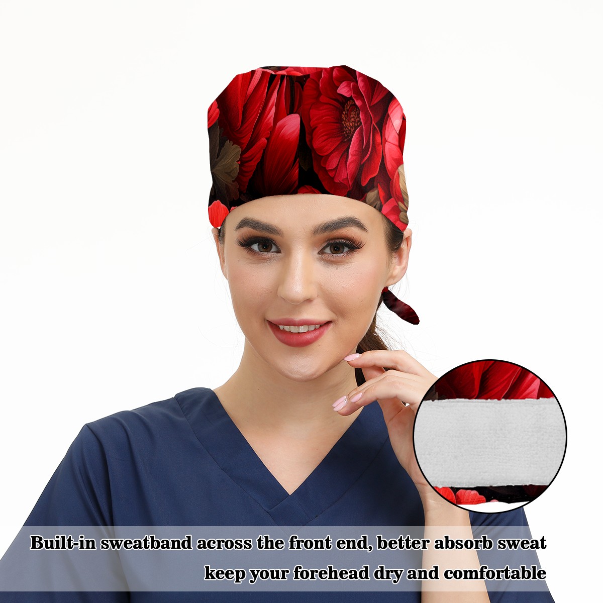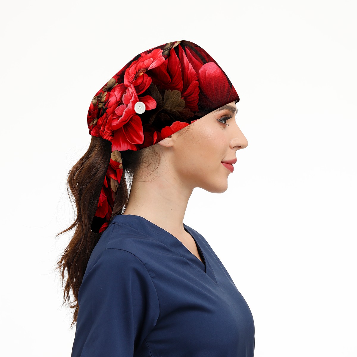 Working Caps with Button&Sweatband Satin Lined Cotton Adjustable Nurse Hats Elastic Band Scrub Cap Surgeon Hat Blossom A
