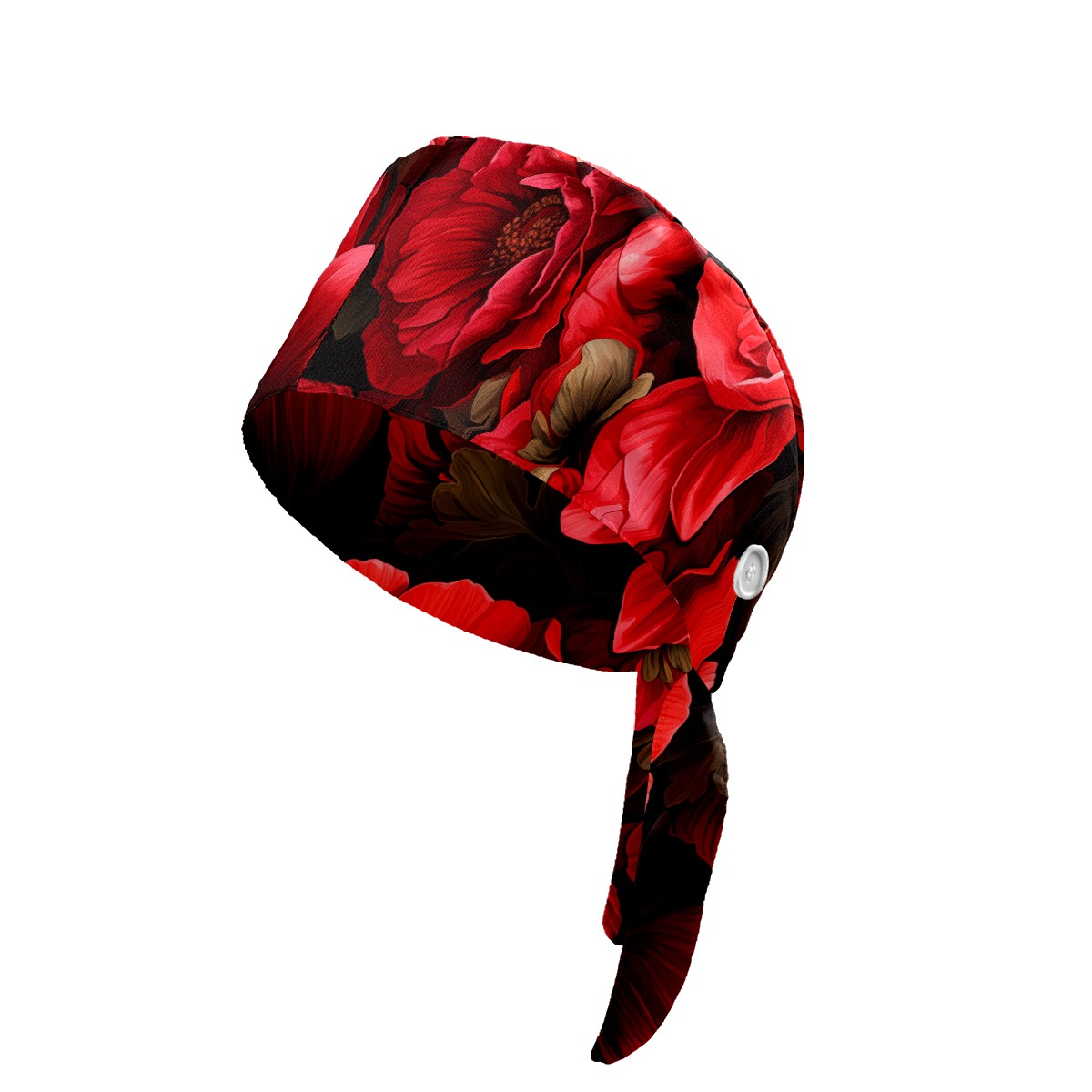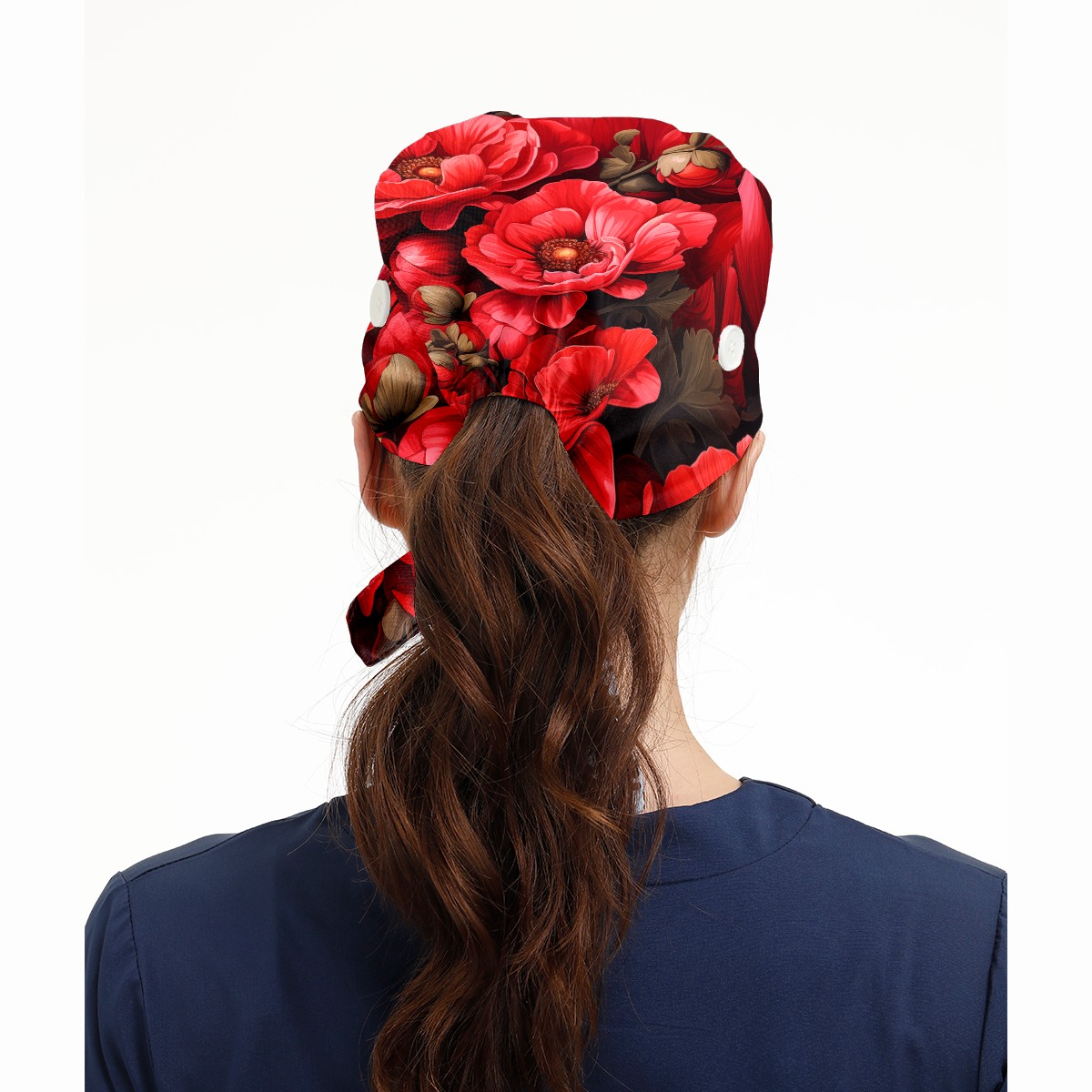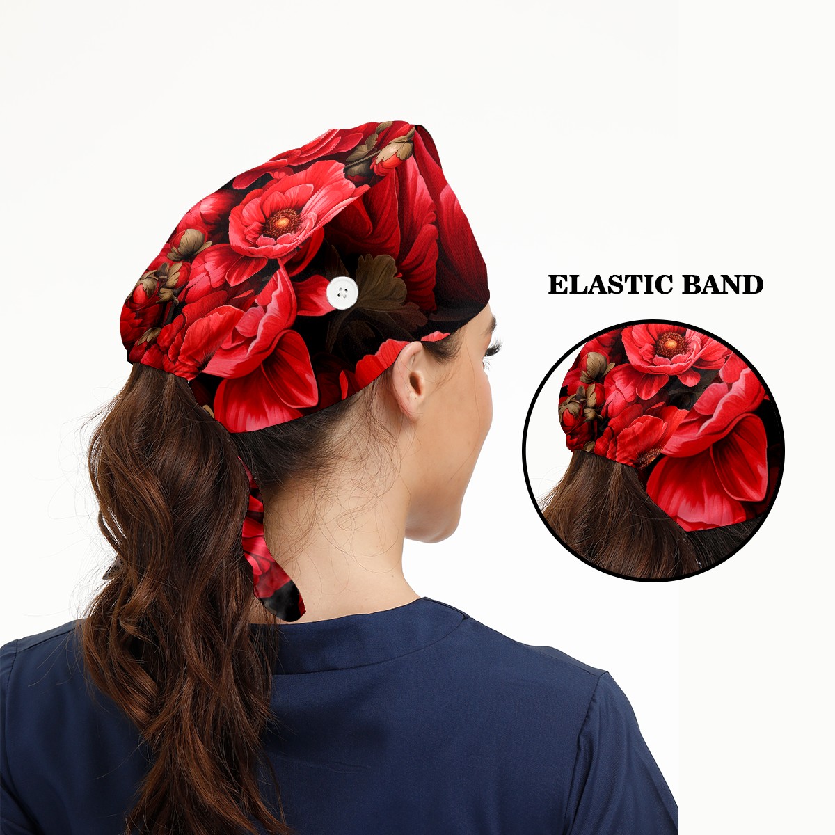 Working Caps with Button&Sweatband Satin Lined Cotton Adjustable Nurse Hats Elastic Band Scrub Cap Surgeon Hat Blossom A