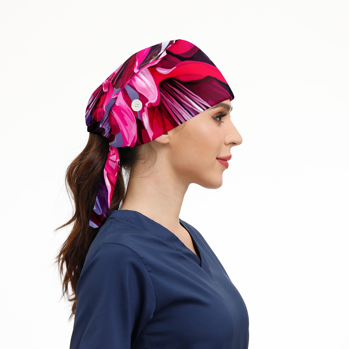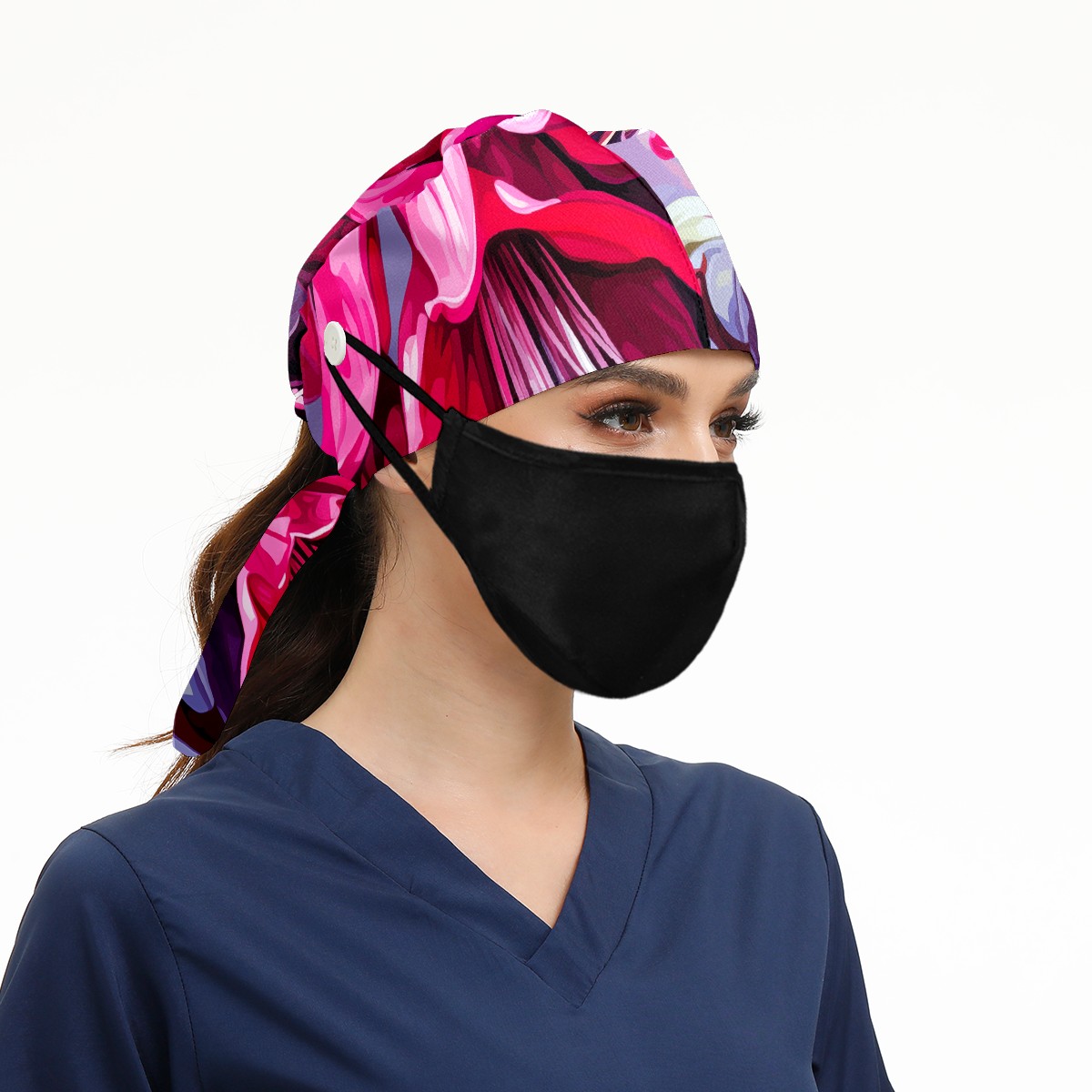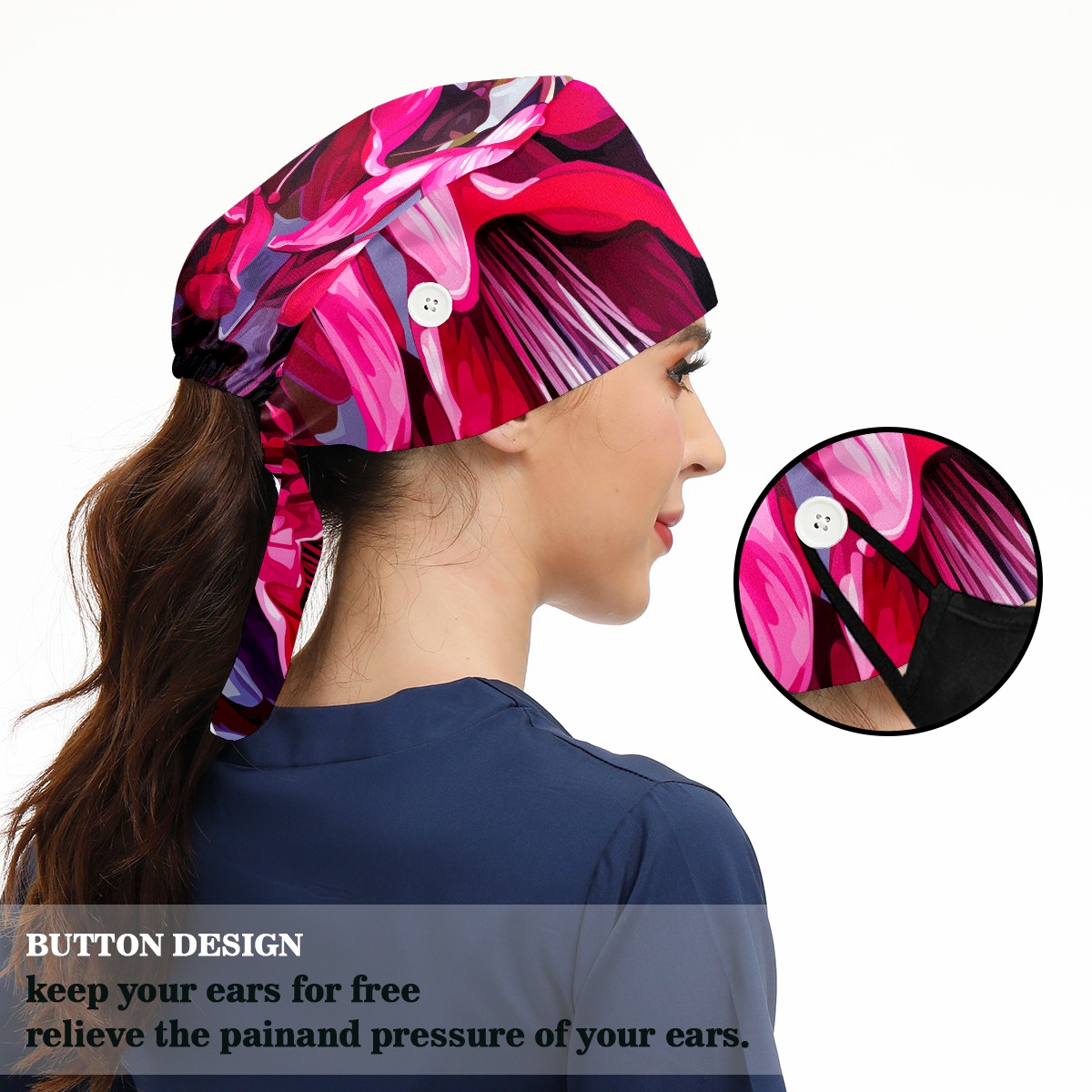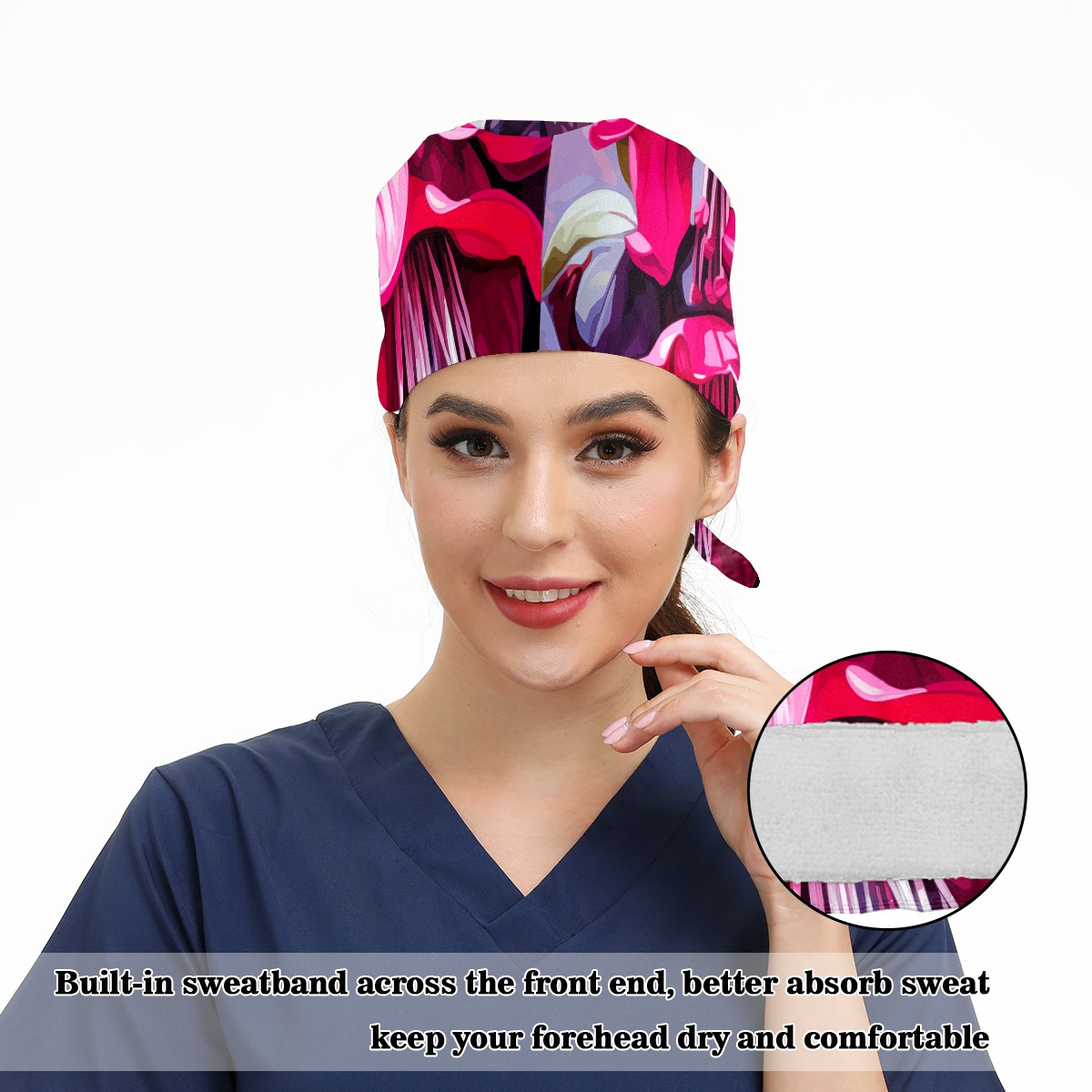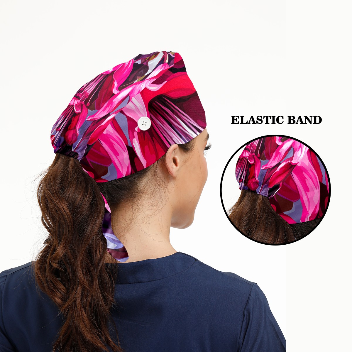 Working Caps with Button&Sweatband Satin Lined Cotton Adjustable Nurse Hats Elastic Band Scrub Cap Surgeon Hat Cute Bouquet B