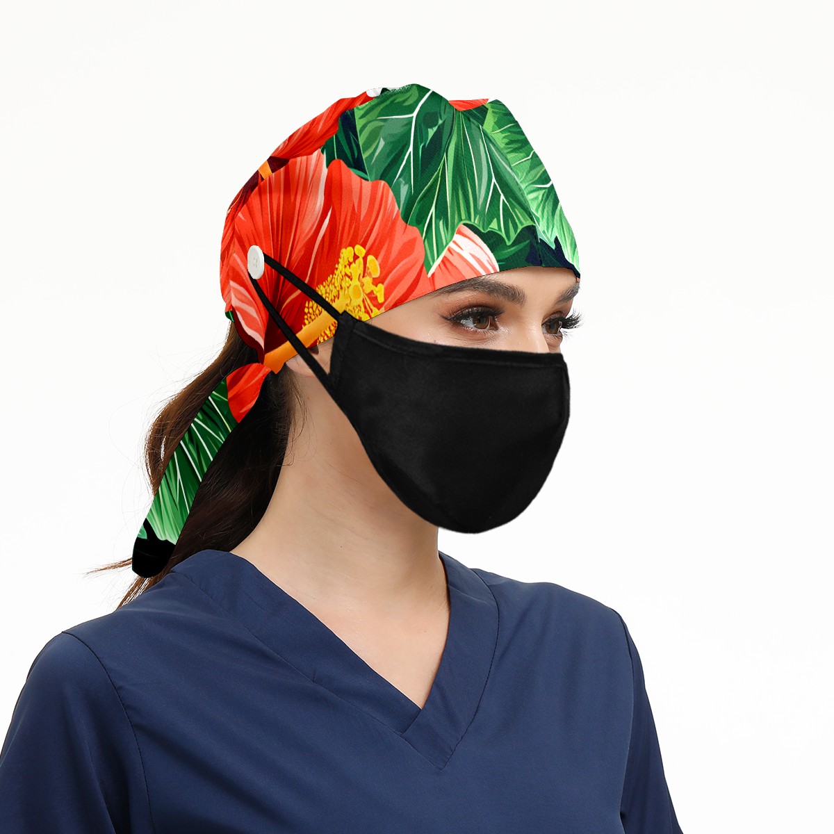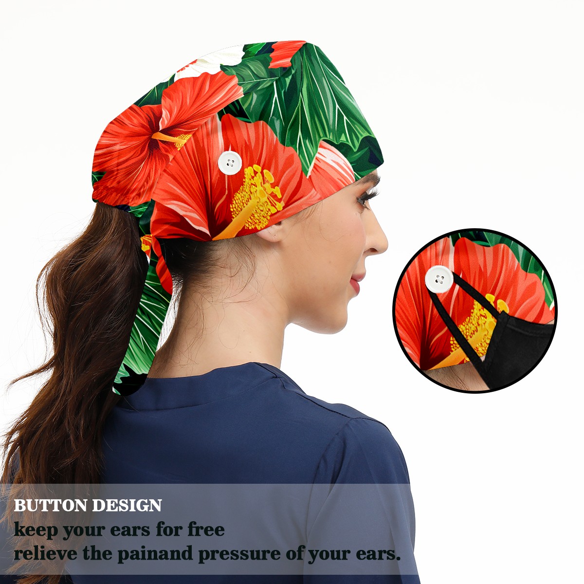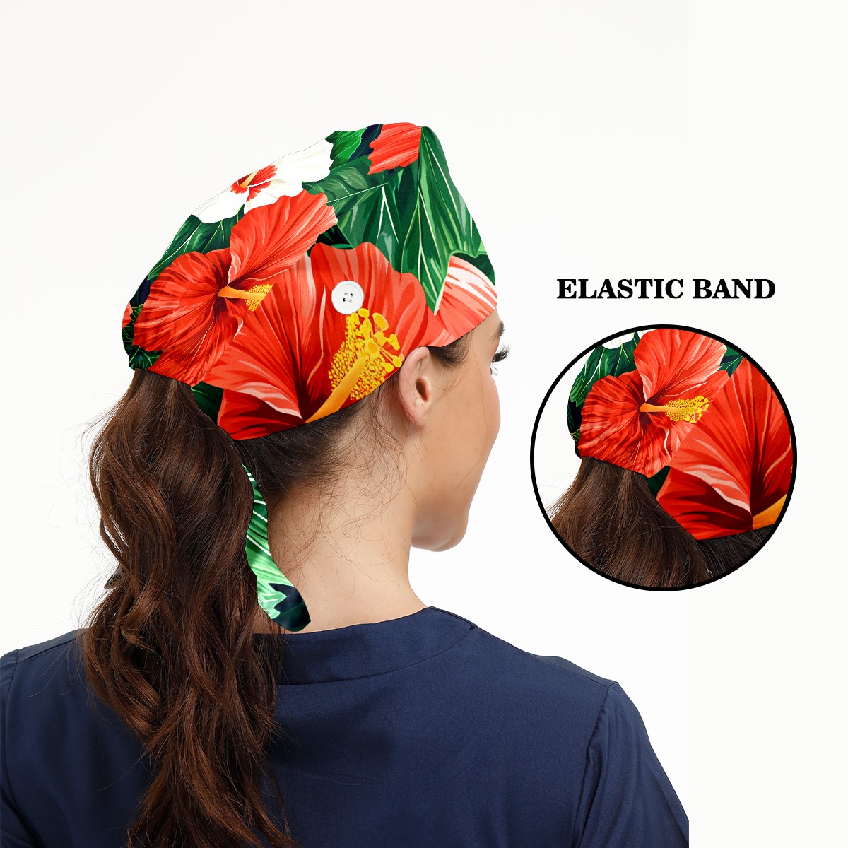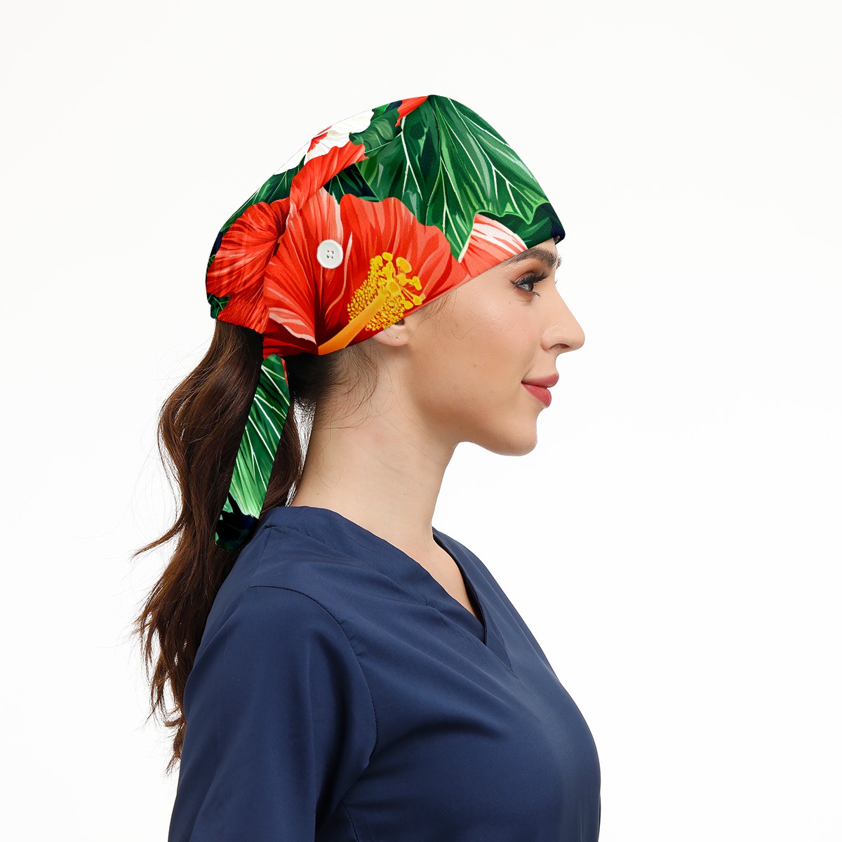 Working Caps with Button&Sweatband Satin Lined Cotton Adjustable Nurse Hats Elastic Band Scrub Cap Surgeon Hat Cotton Rose Hibiscus E