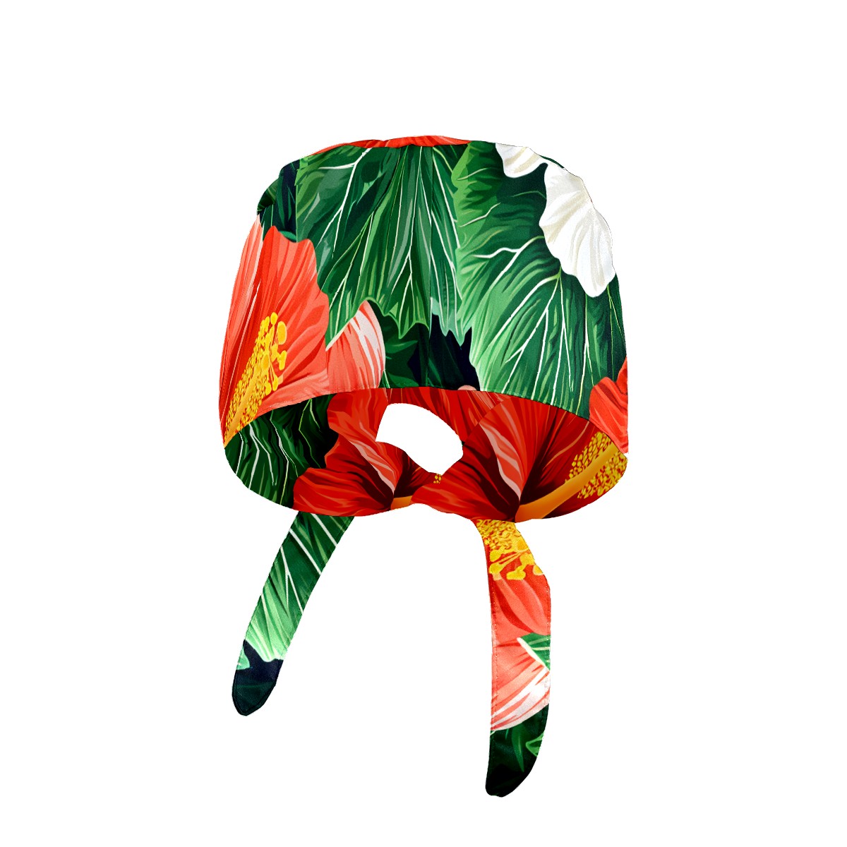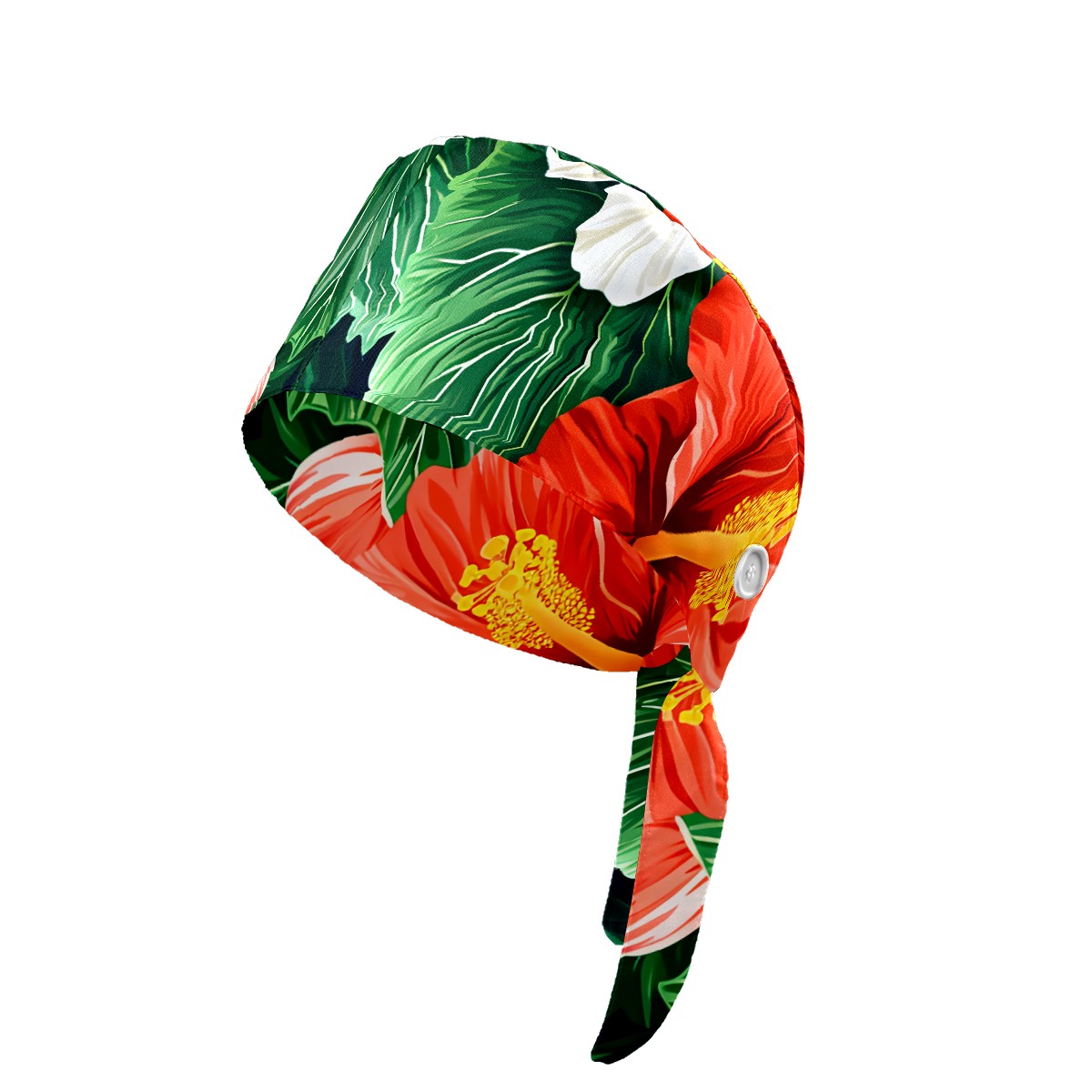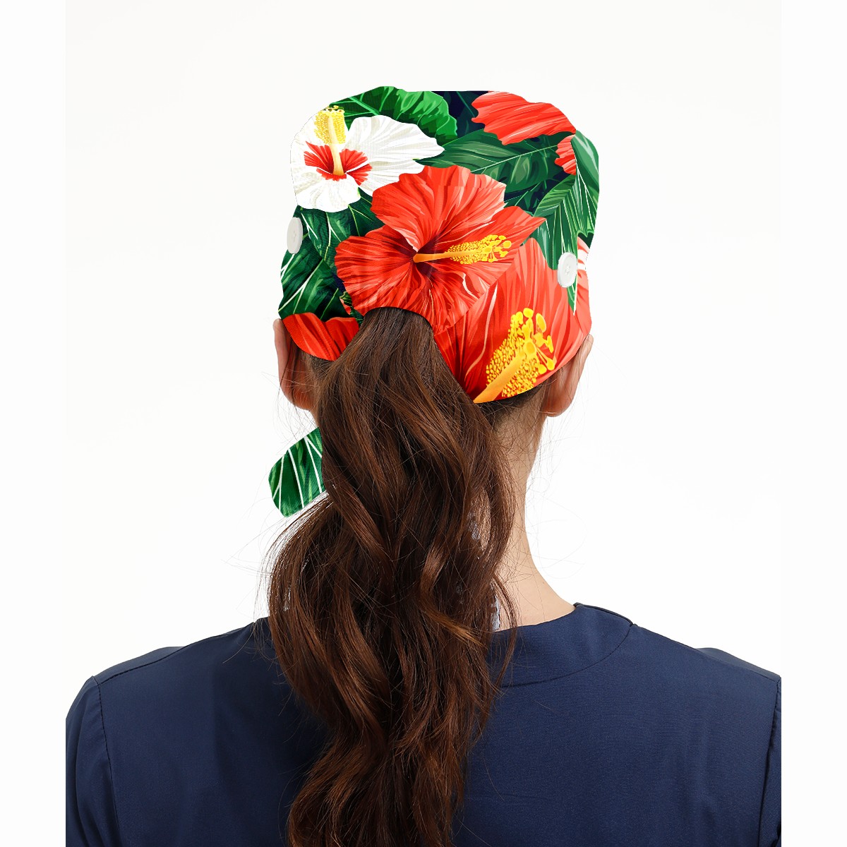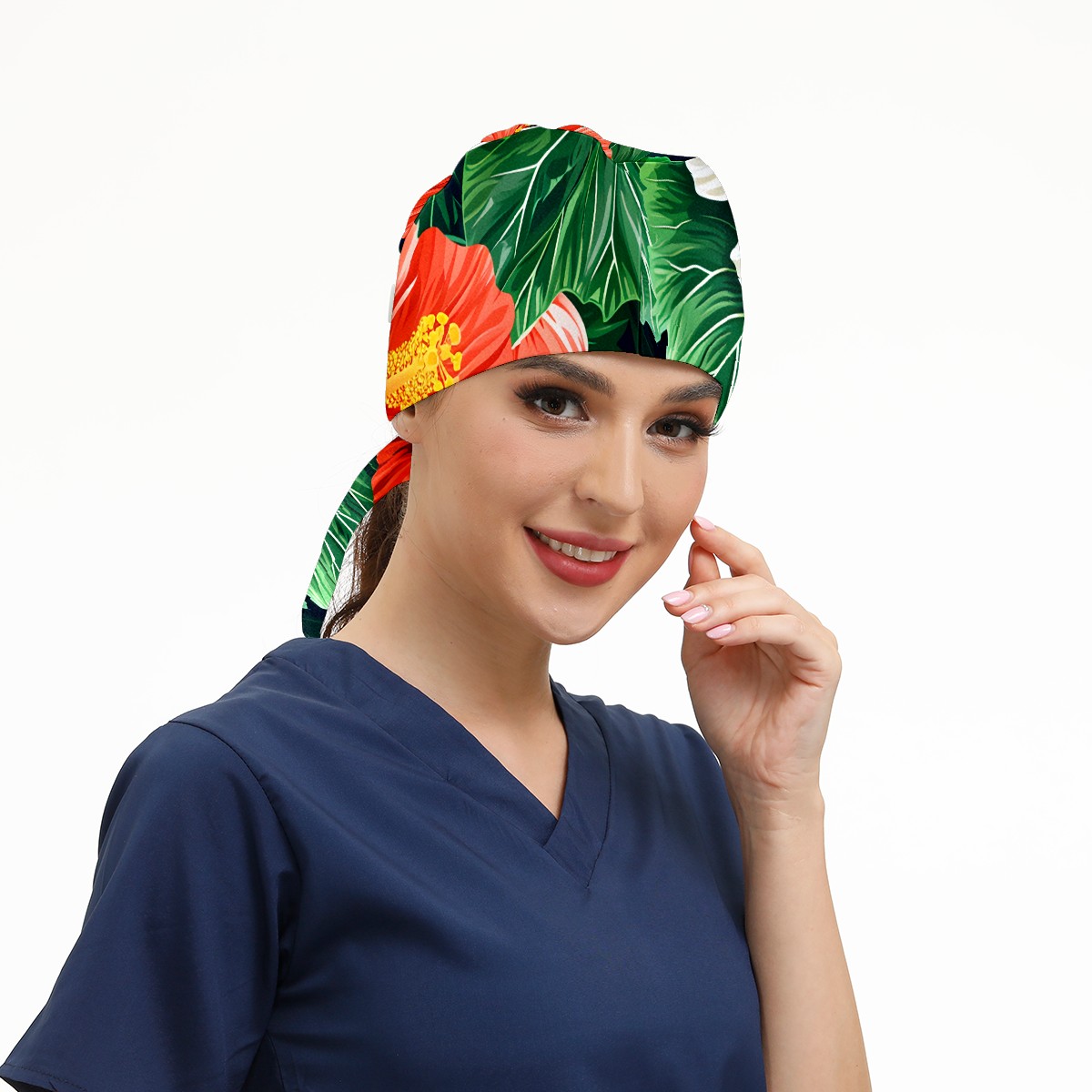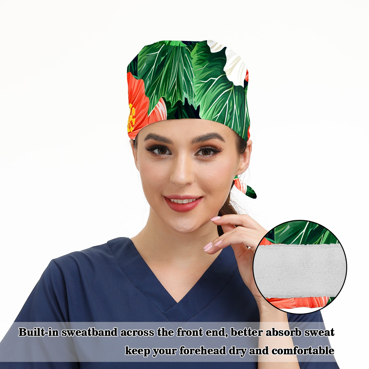 Working Caps with Button&Sweatband Satin Lined Cotton Adjustable Nurse Hats Elastic Band Scrub Cap Surgeon Hat Cotton Rose Hibiscus E