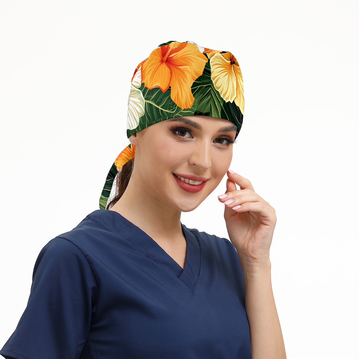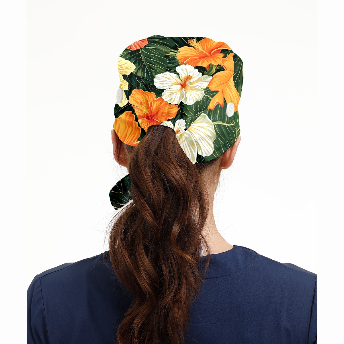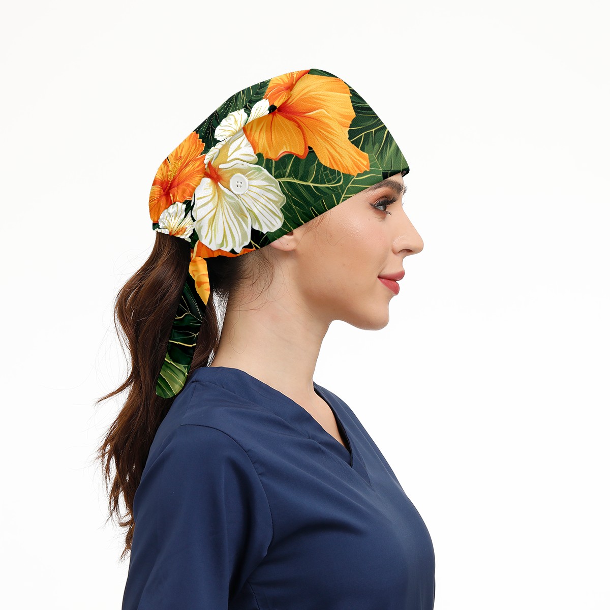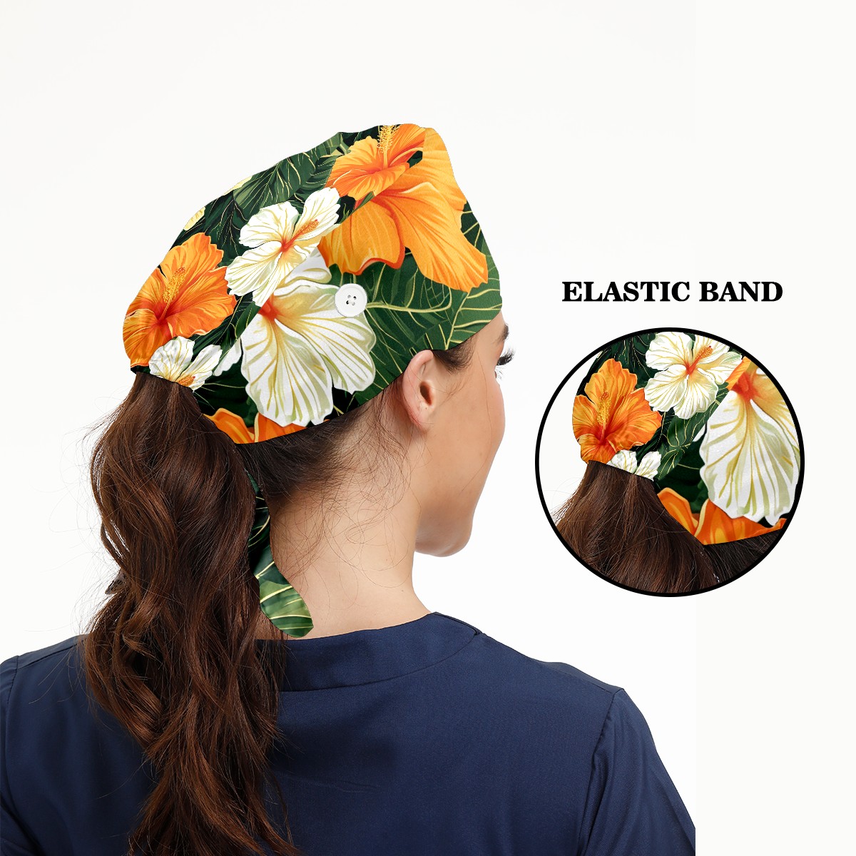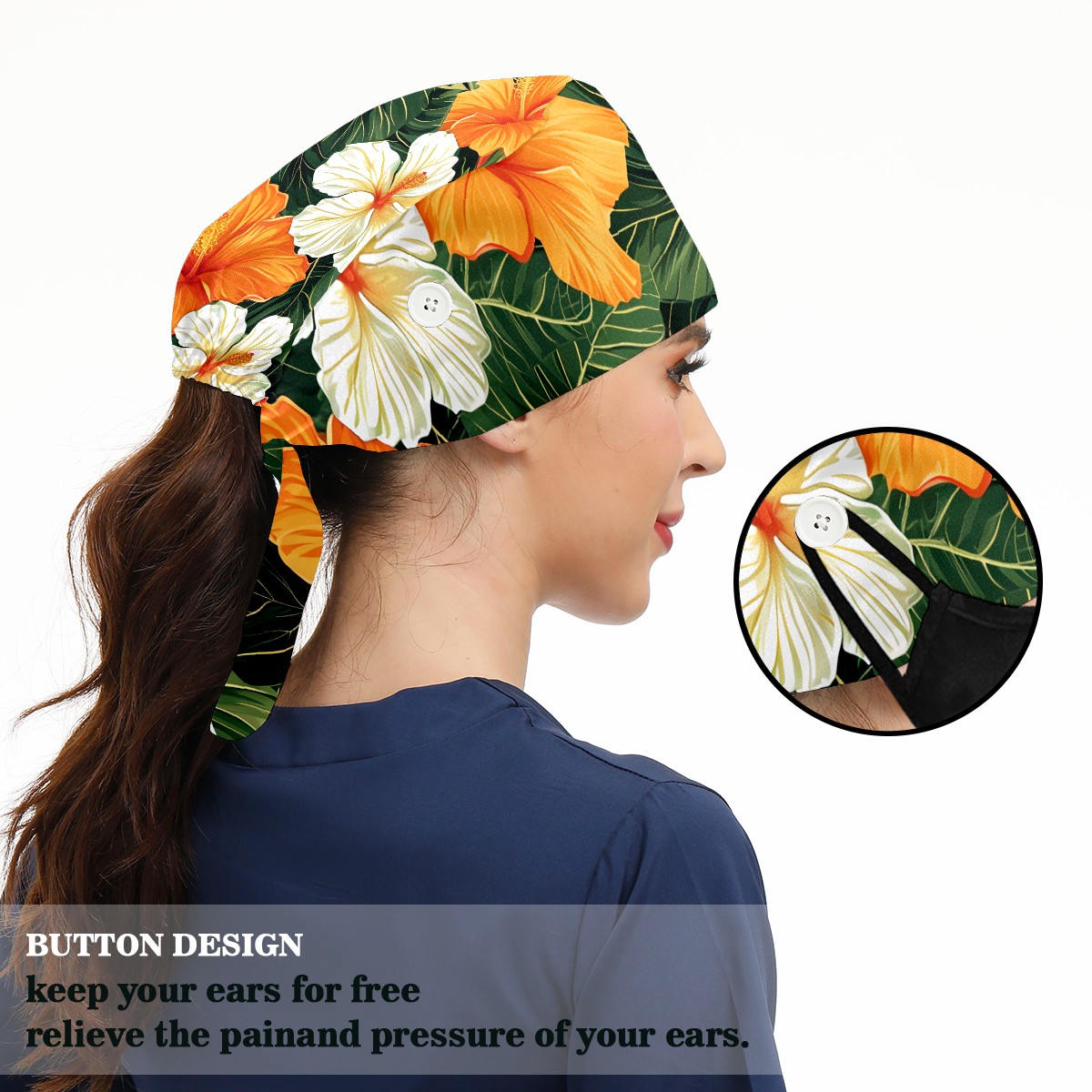 Working Caps with Button&Sweatband Satin Lined Cotton Adjustable Nurse Hats Elastic Band Scrub Cap Surgeon Hat Hibiscus Flower E