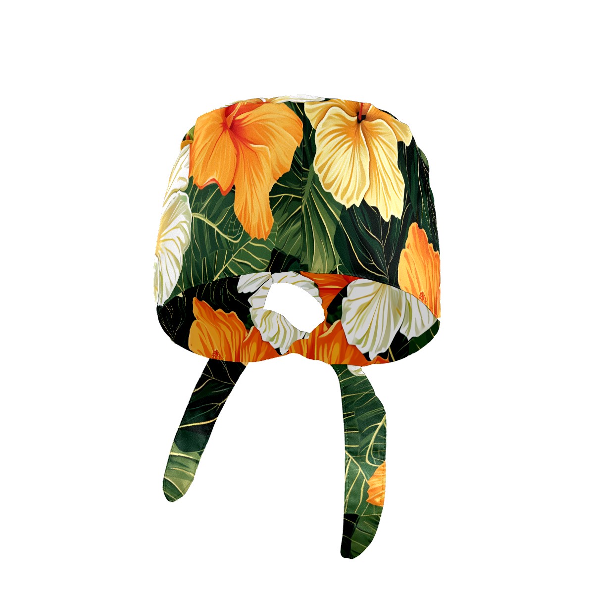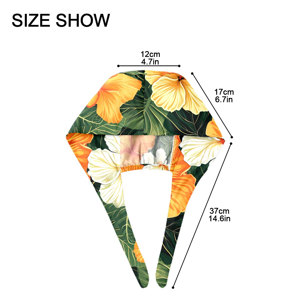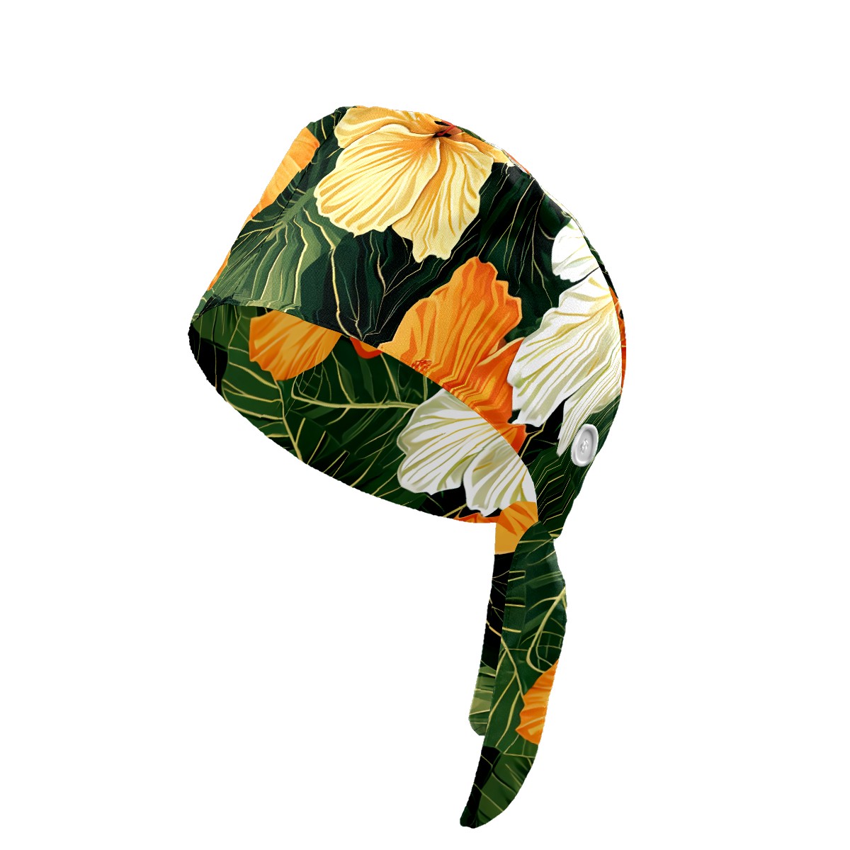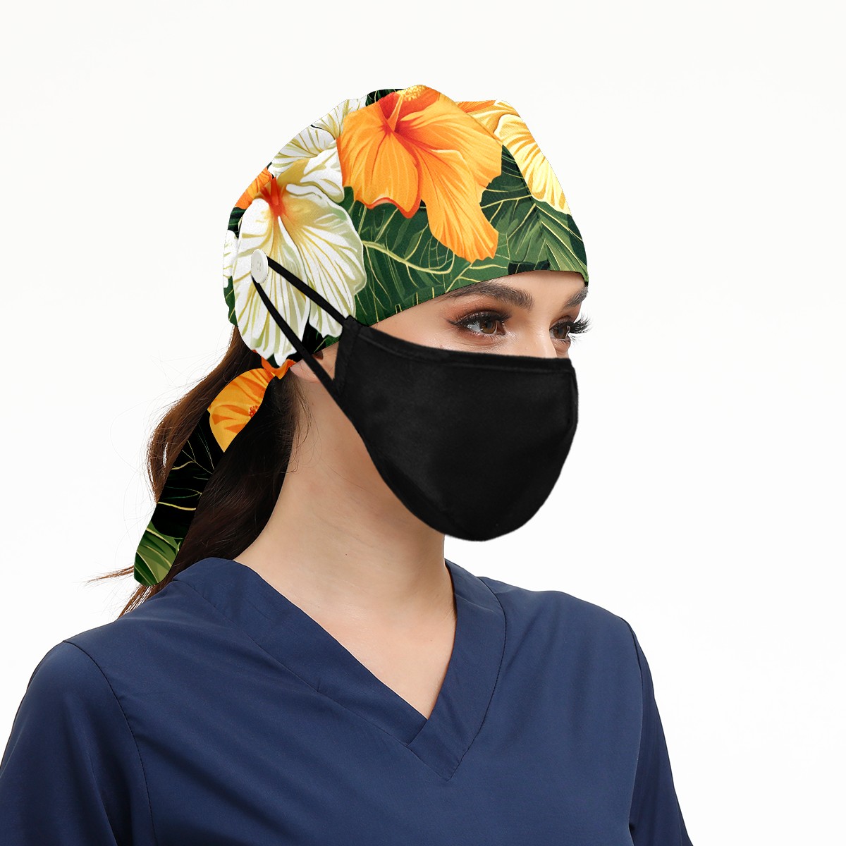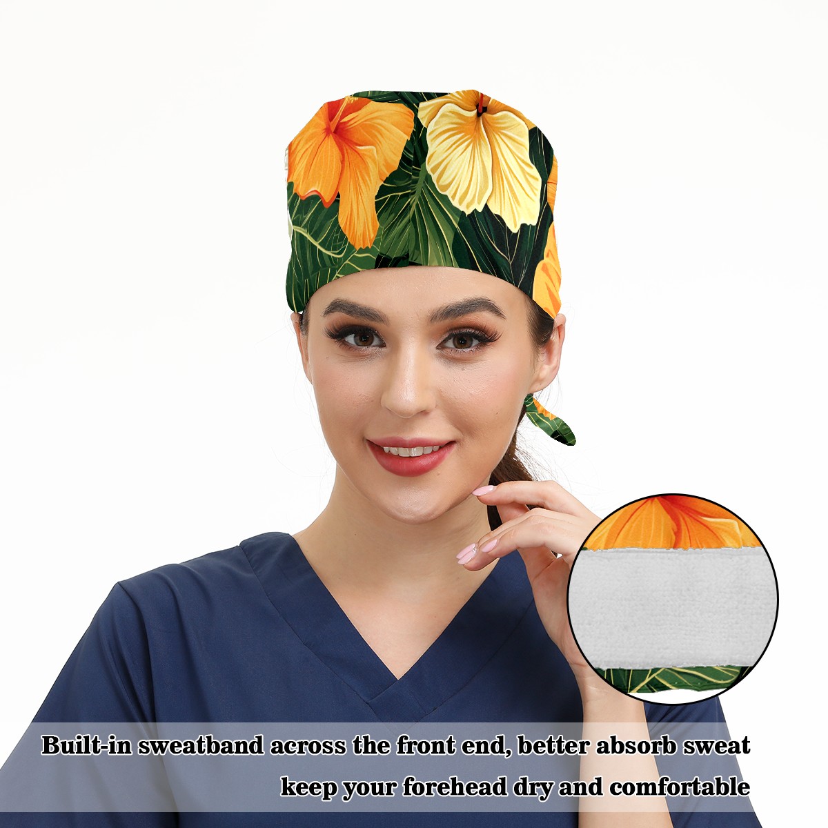 Working Caps with Button&Sweatband Satin Lined Cotton Adjustable Nurse Hats Elastic Band Scrub Cap Surgeon Hat Hibiscus Flower E