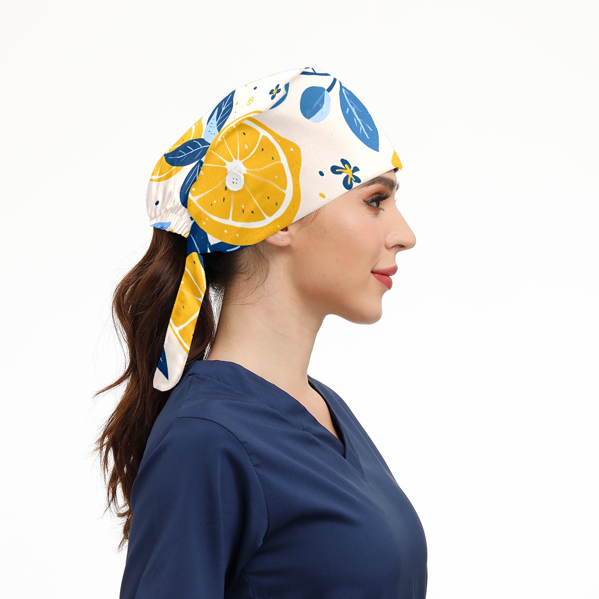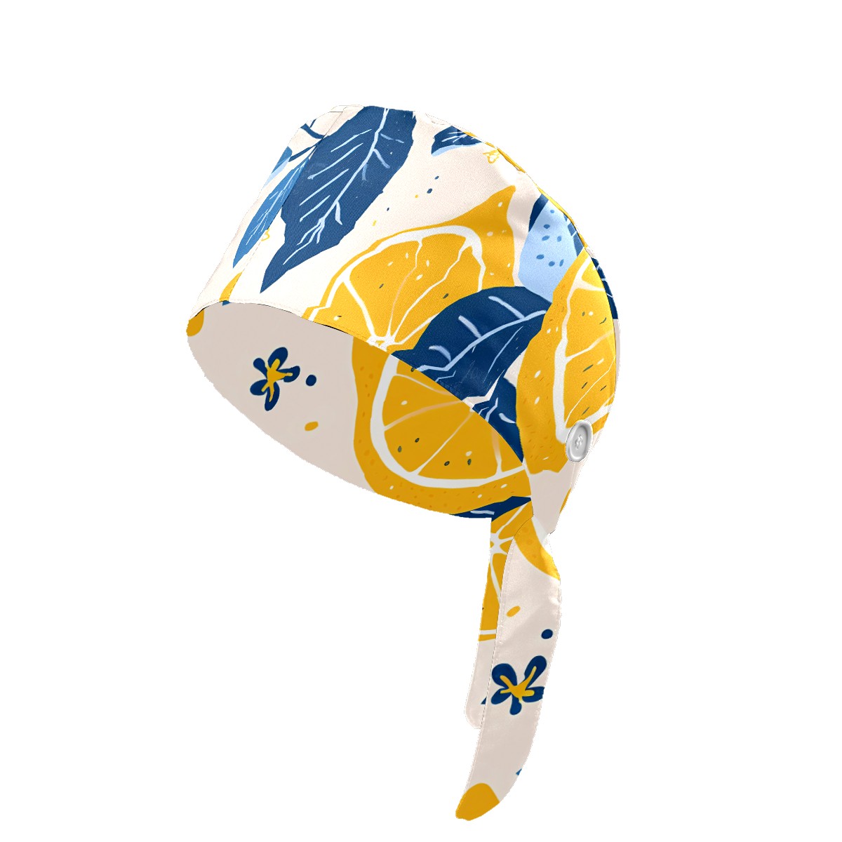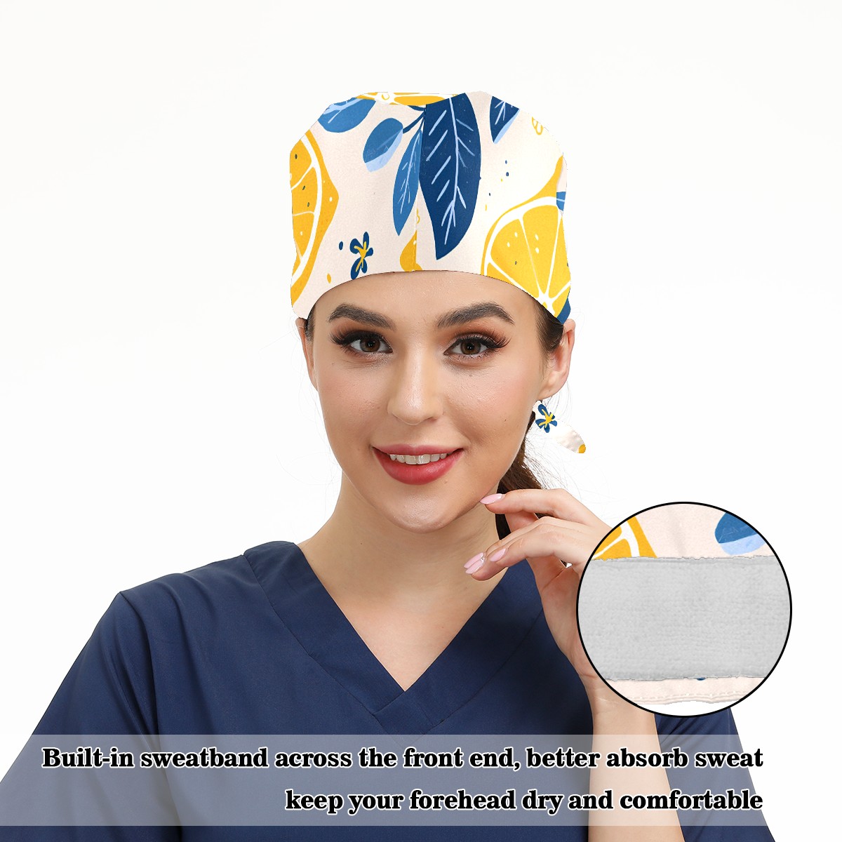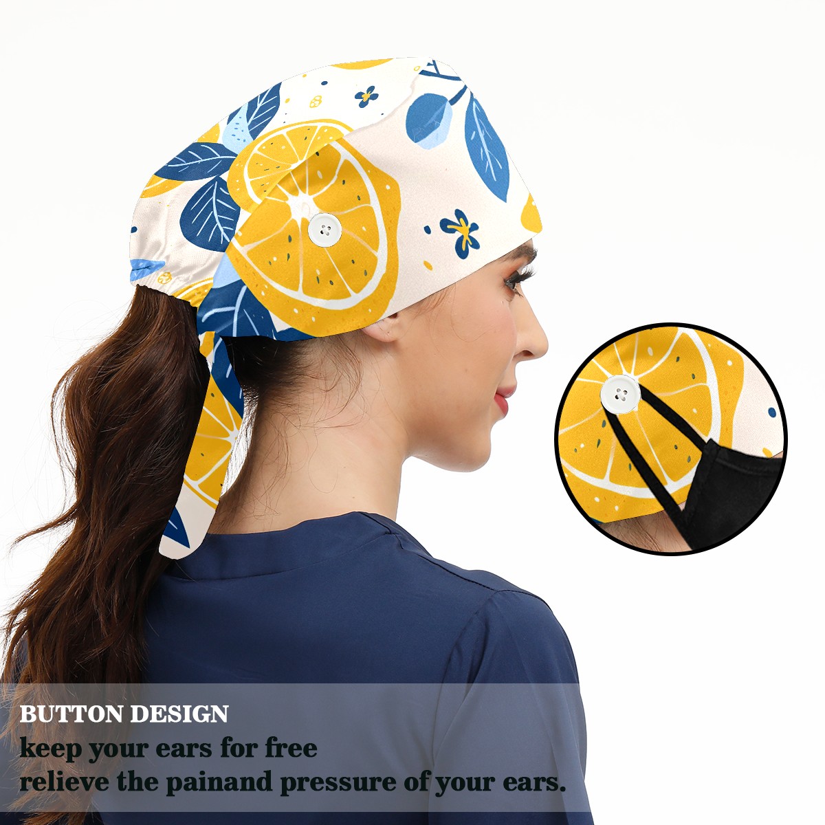 Working Caps with Button&Sweatband Satin Lined Cotton Adjustable Nurse Hats Elastic Band Scrub Cap Surgeon Hat Cute Lemon