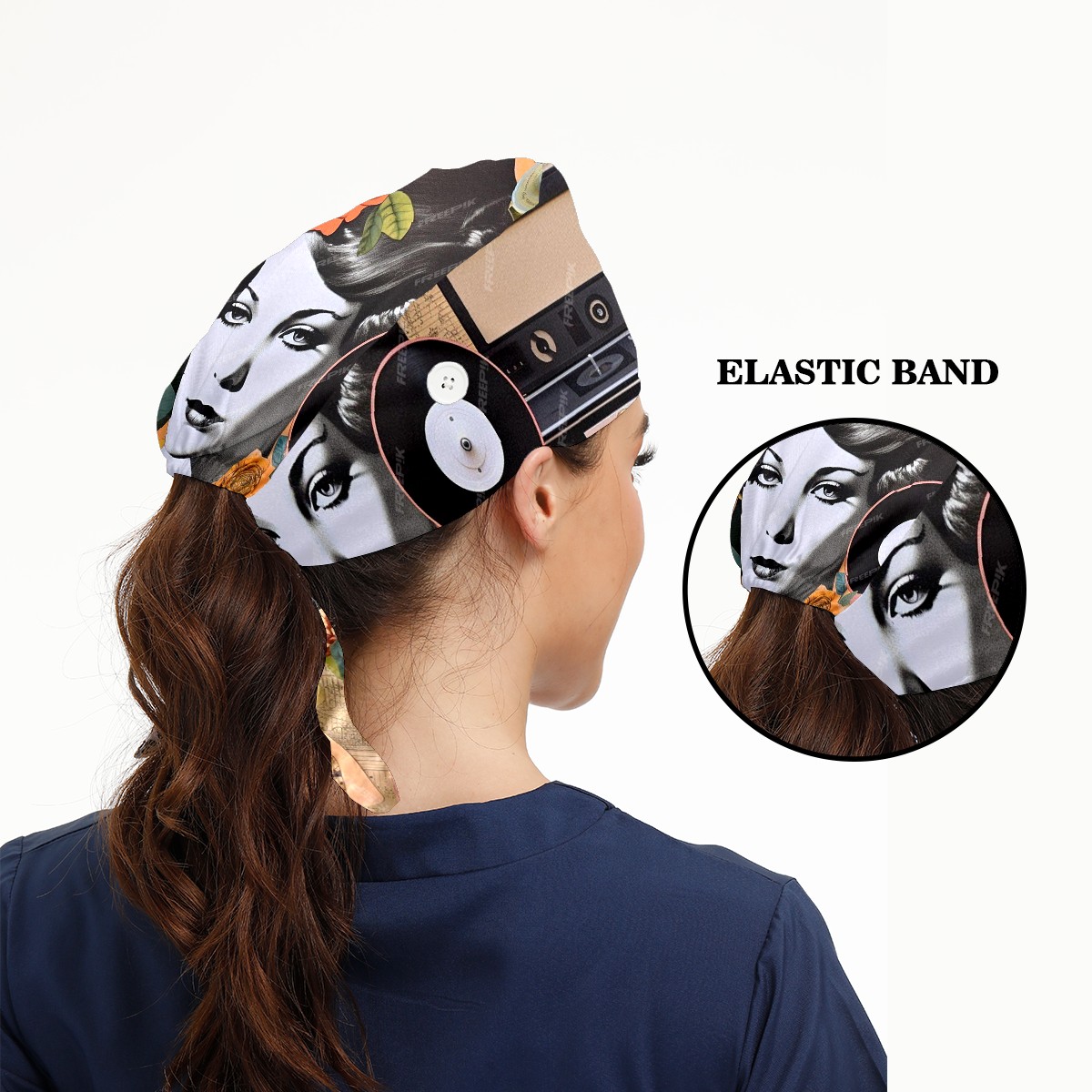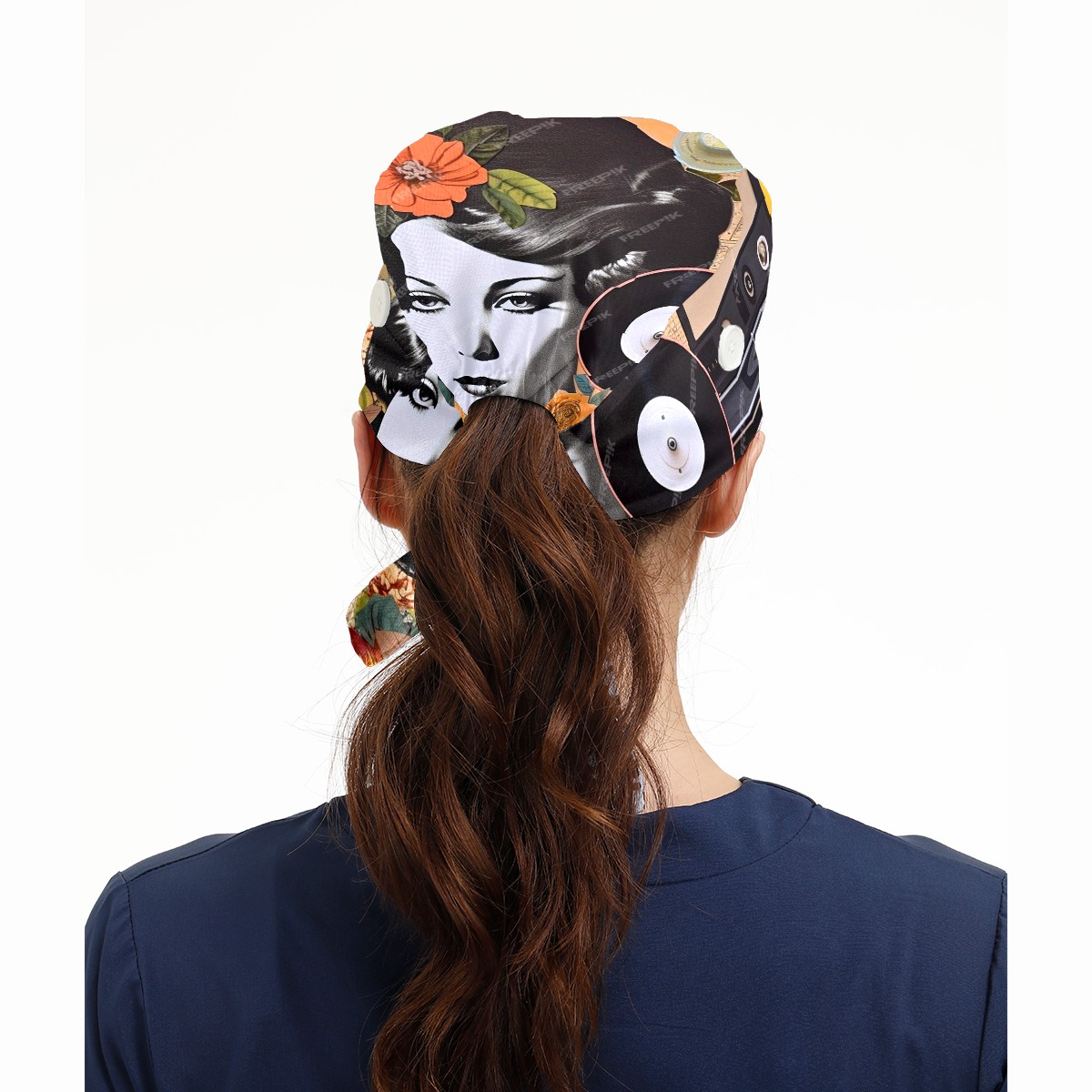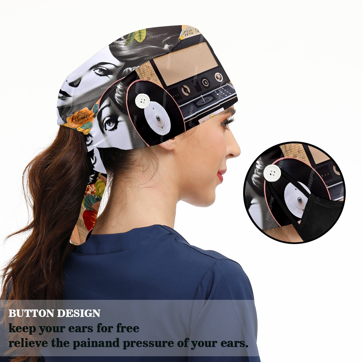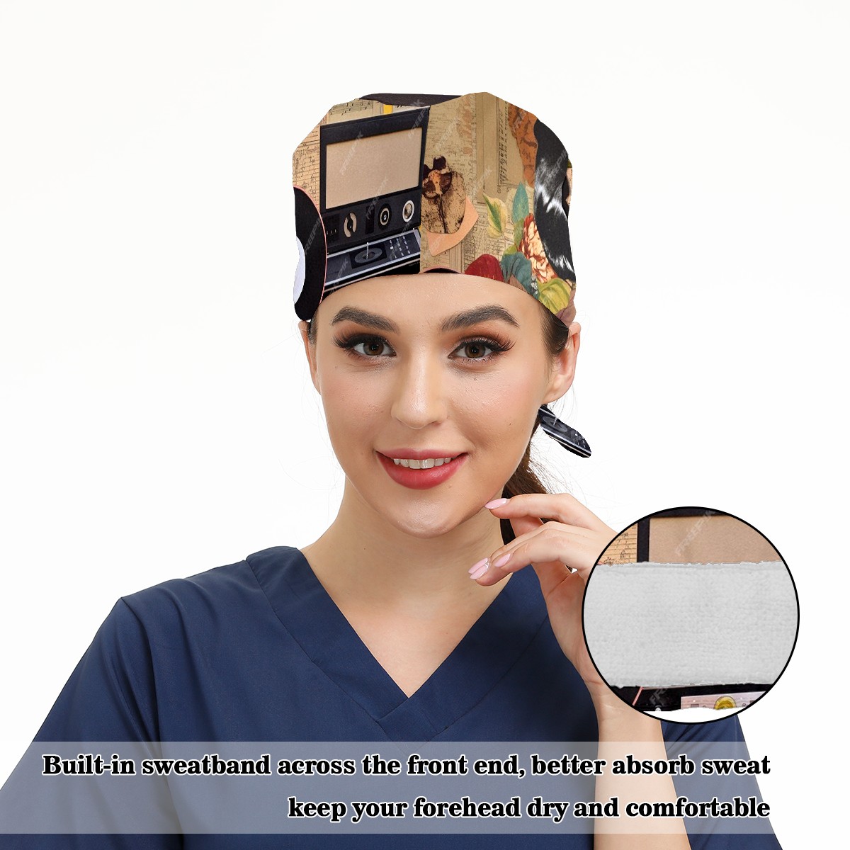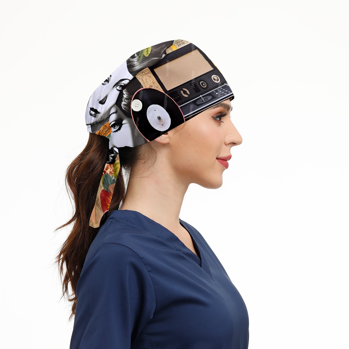 Working Caps with Button&Sweatband Satin Lined Cotton Adjustable Nurse Hats Elastic Band Scrub Cap Surgeon Hat Paper-collage