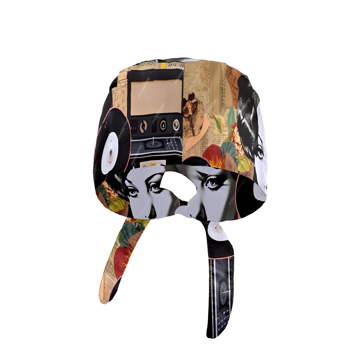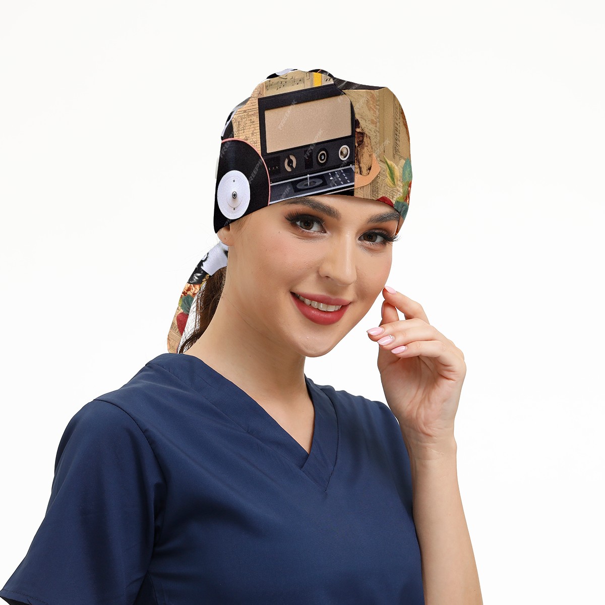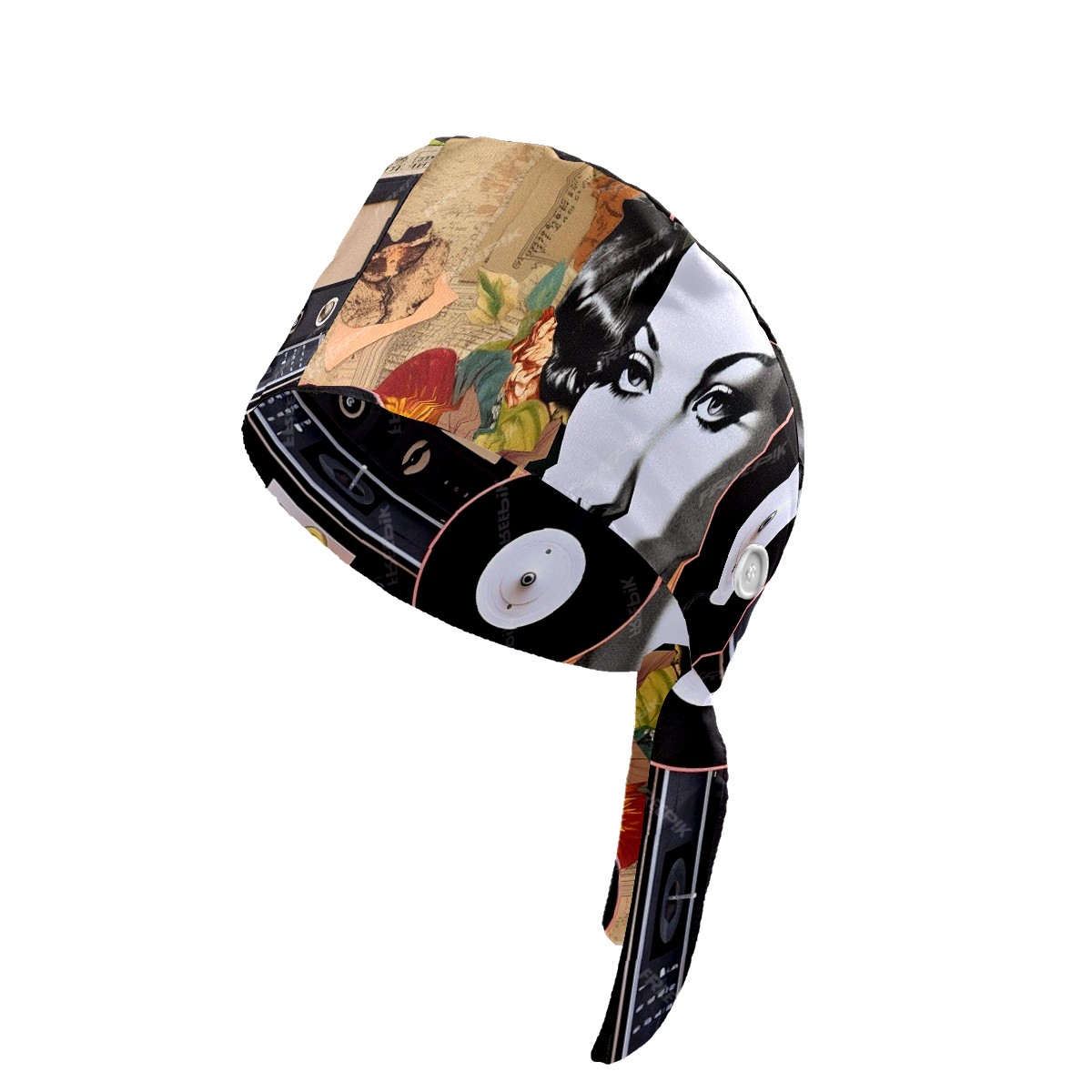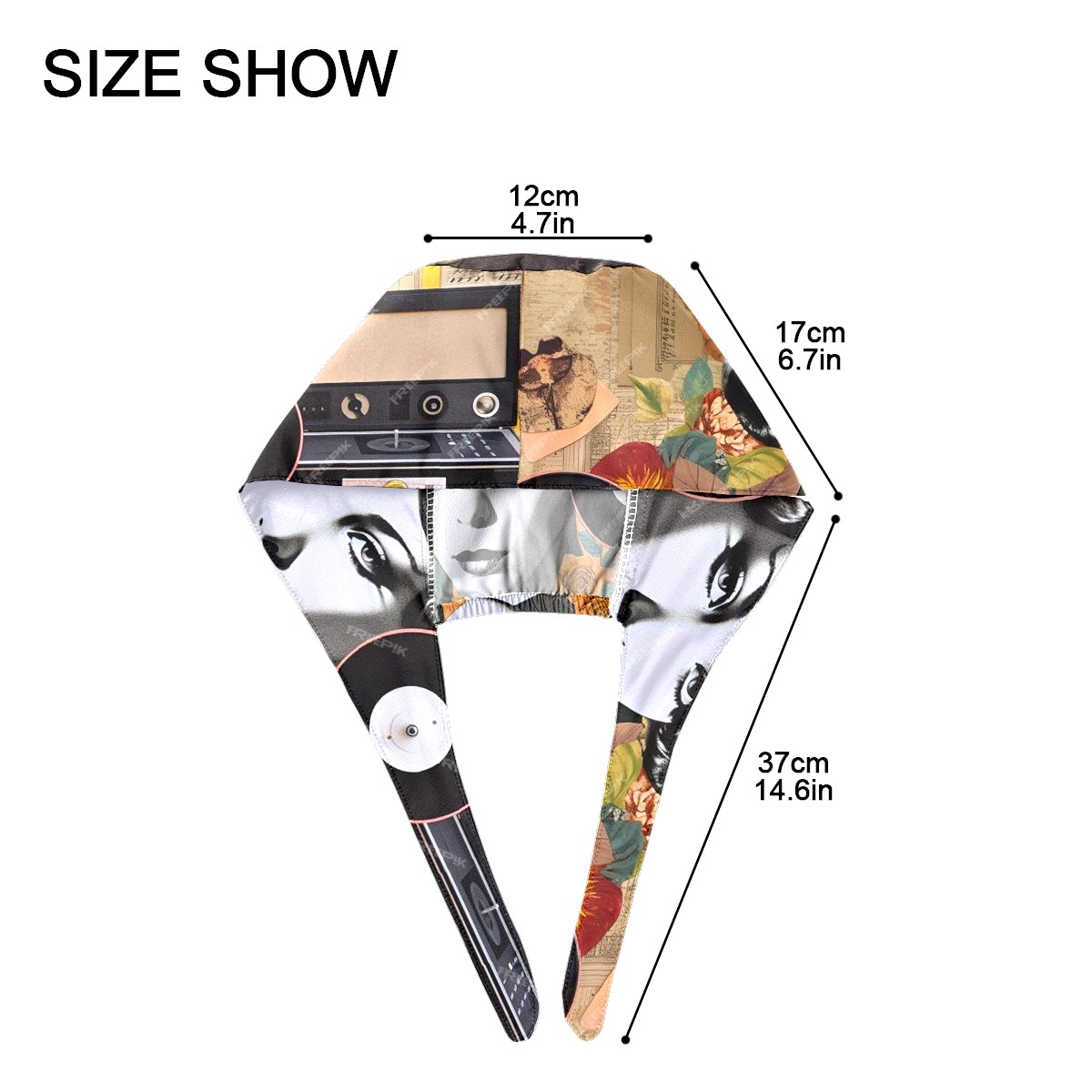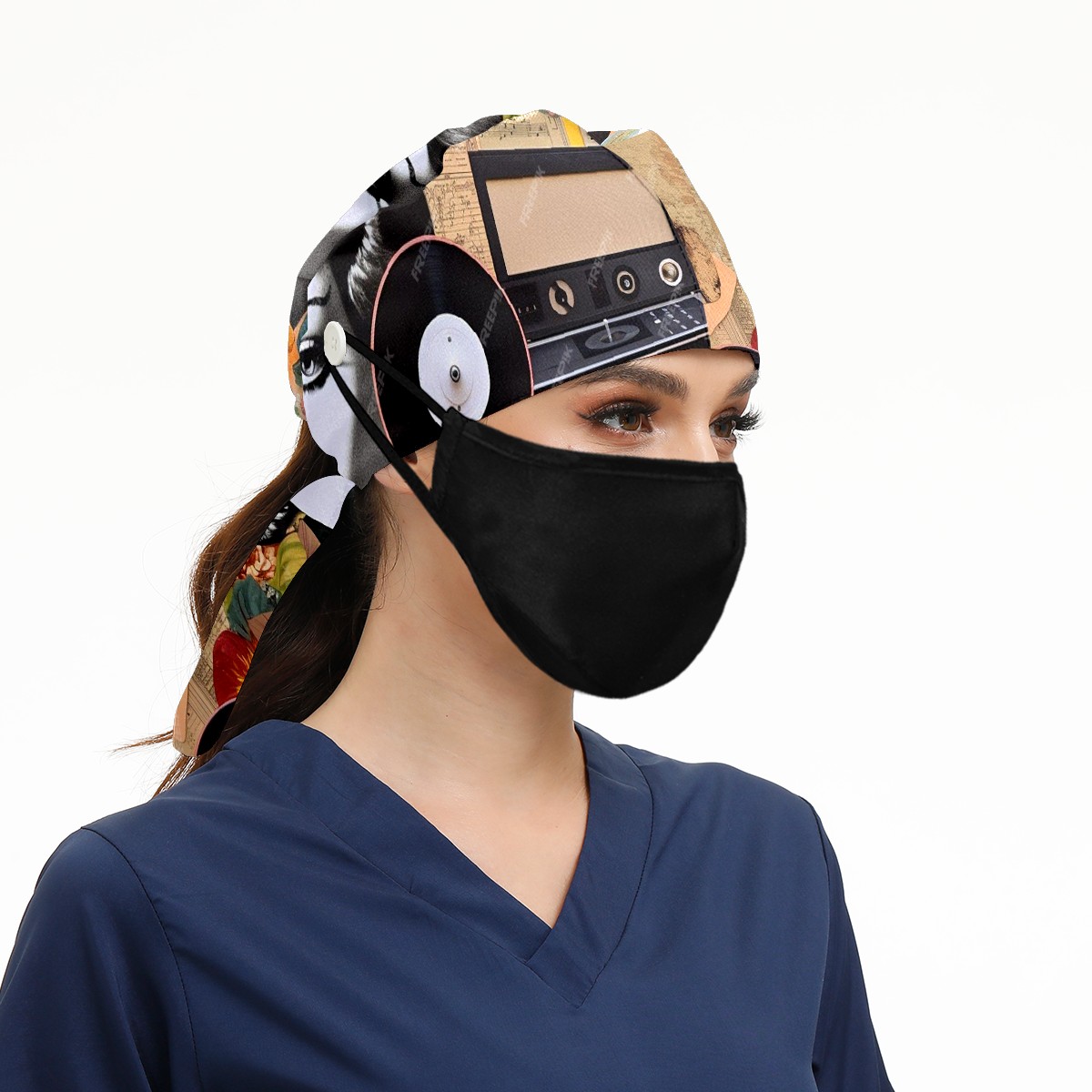 Working Caps with Button&Sweatband Satin Lined Cotton Adjustable Nurse Hats Elastic Band Scrub Cap Surgeon Hat Paper-collage