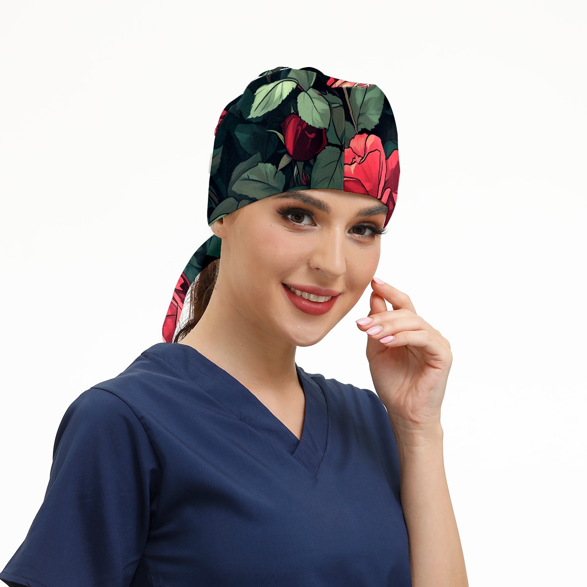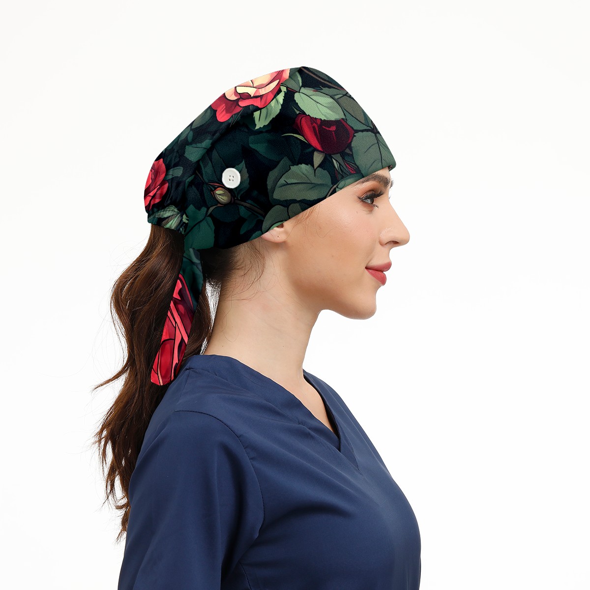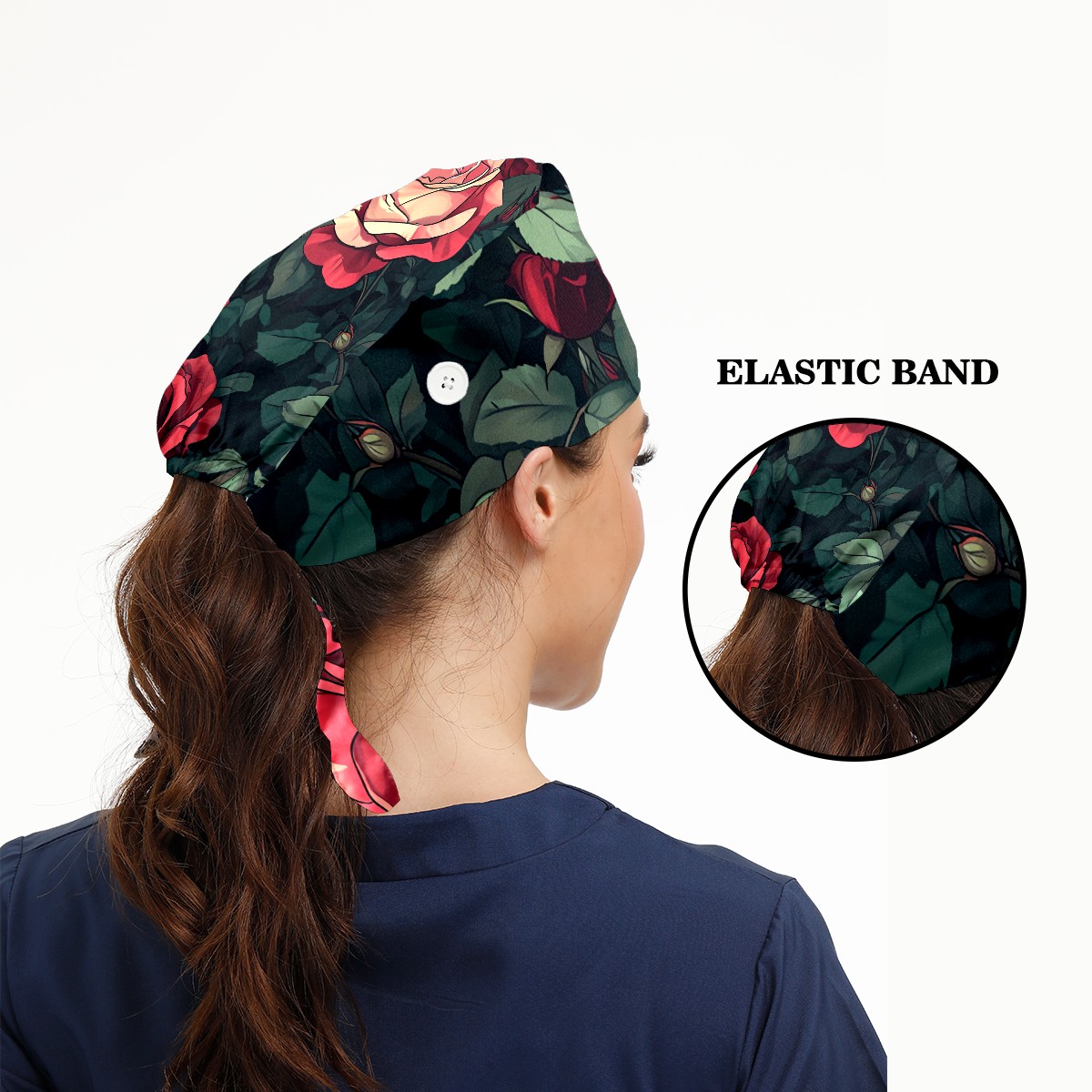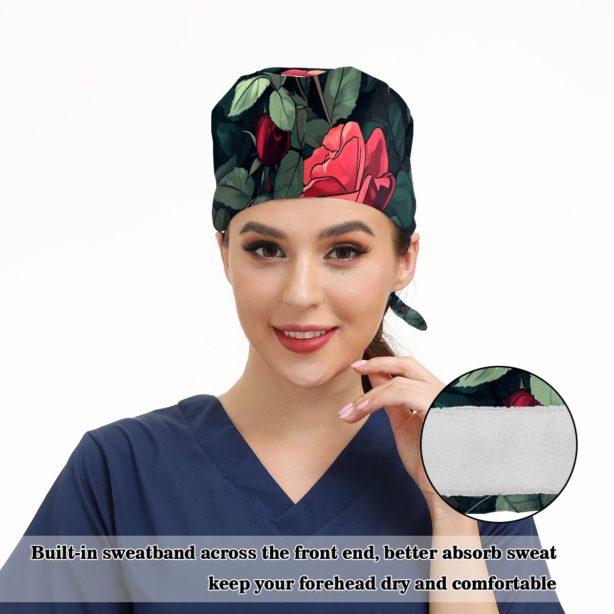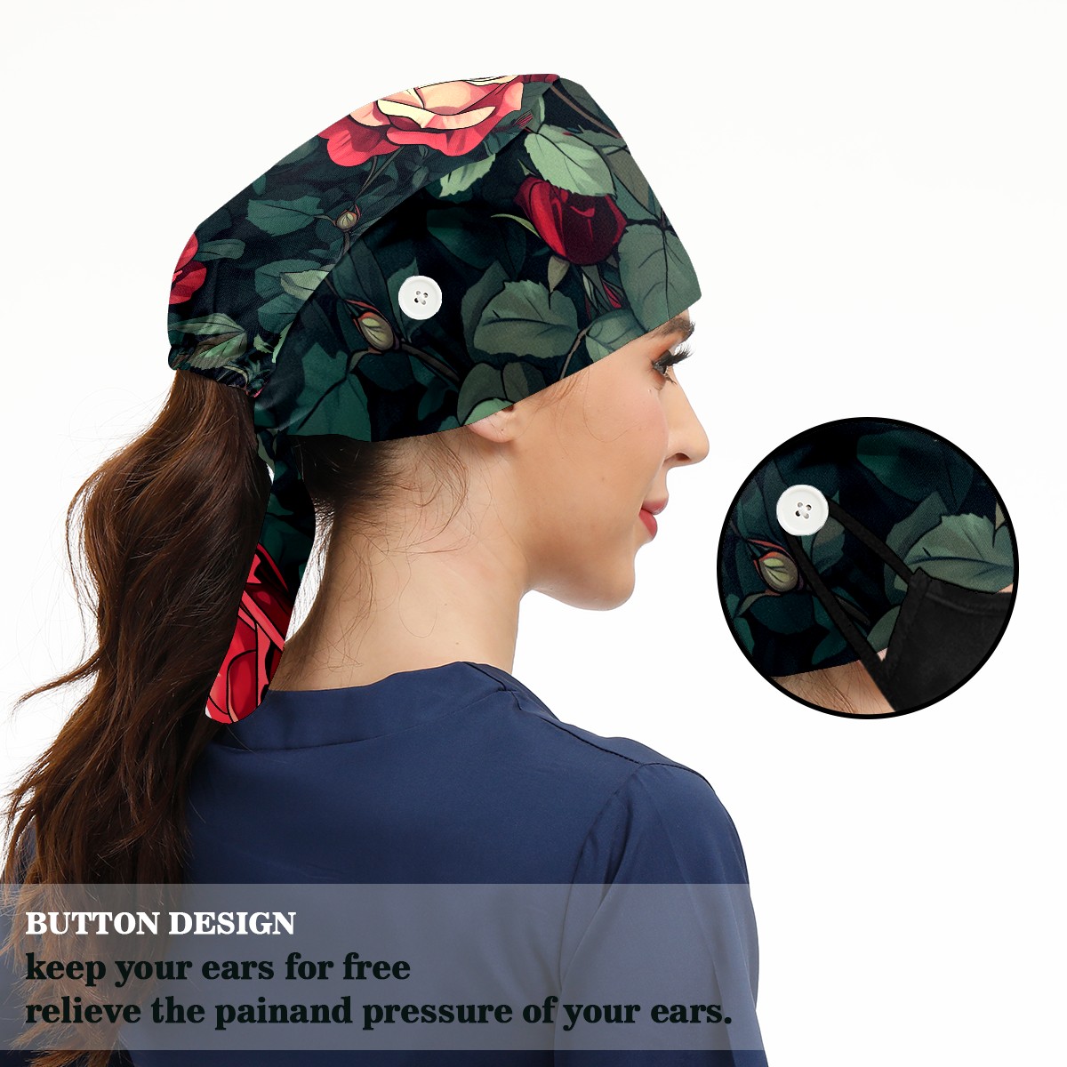 Working Caps with Button&Sweatband Satin Lined Cotton Adjustable Nurse Hats Elastic Band Scrub Cap Surgeon Hat Rose Flower