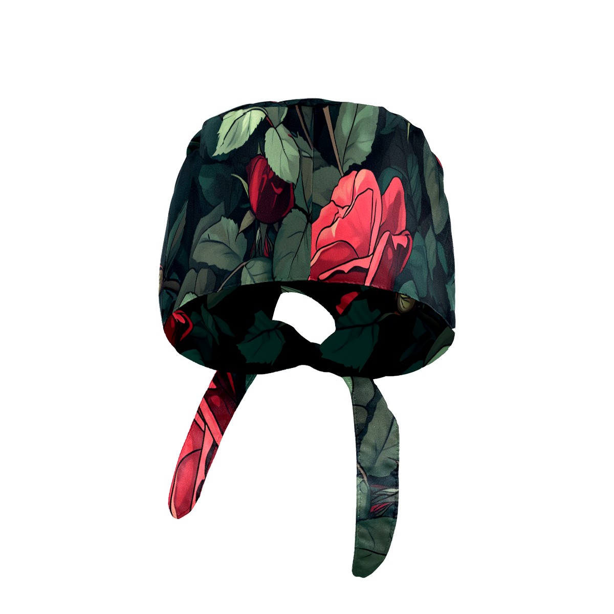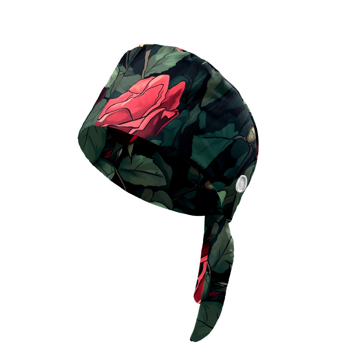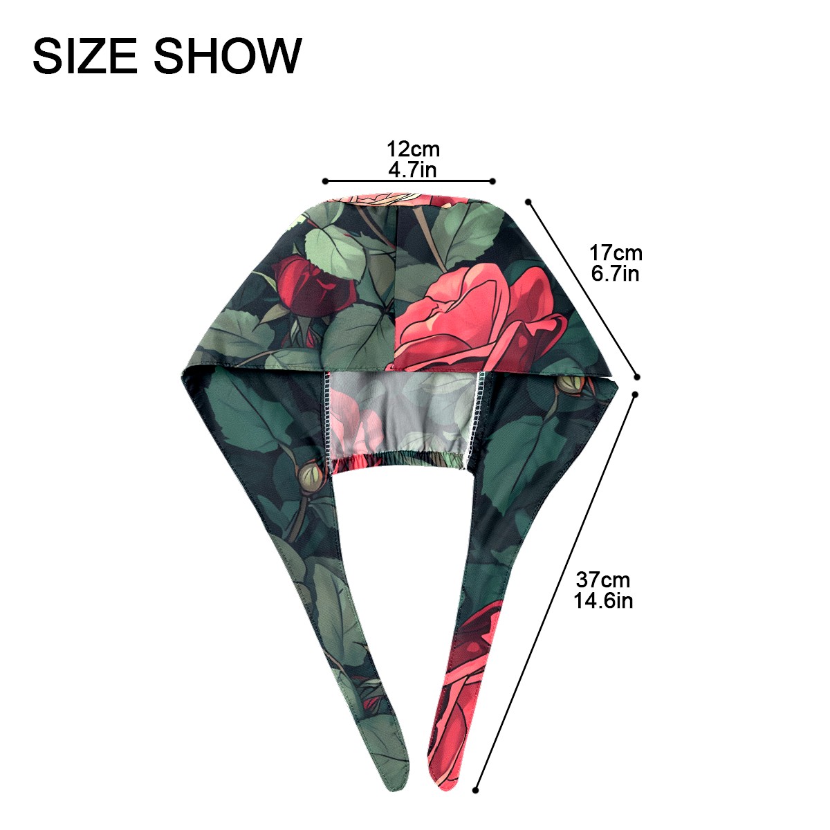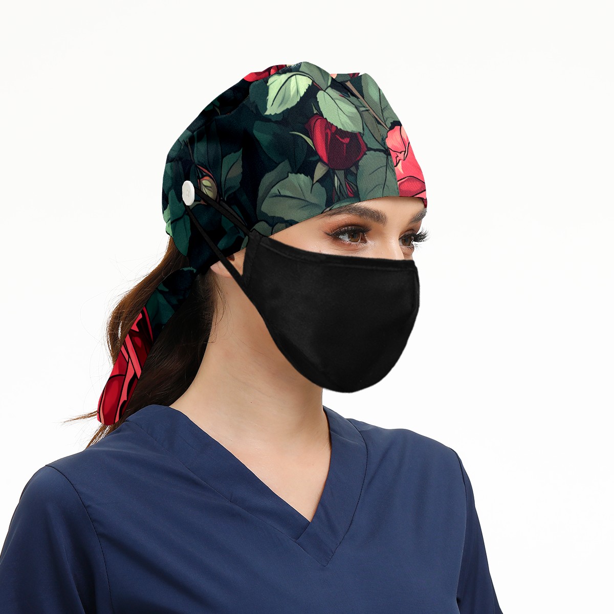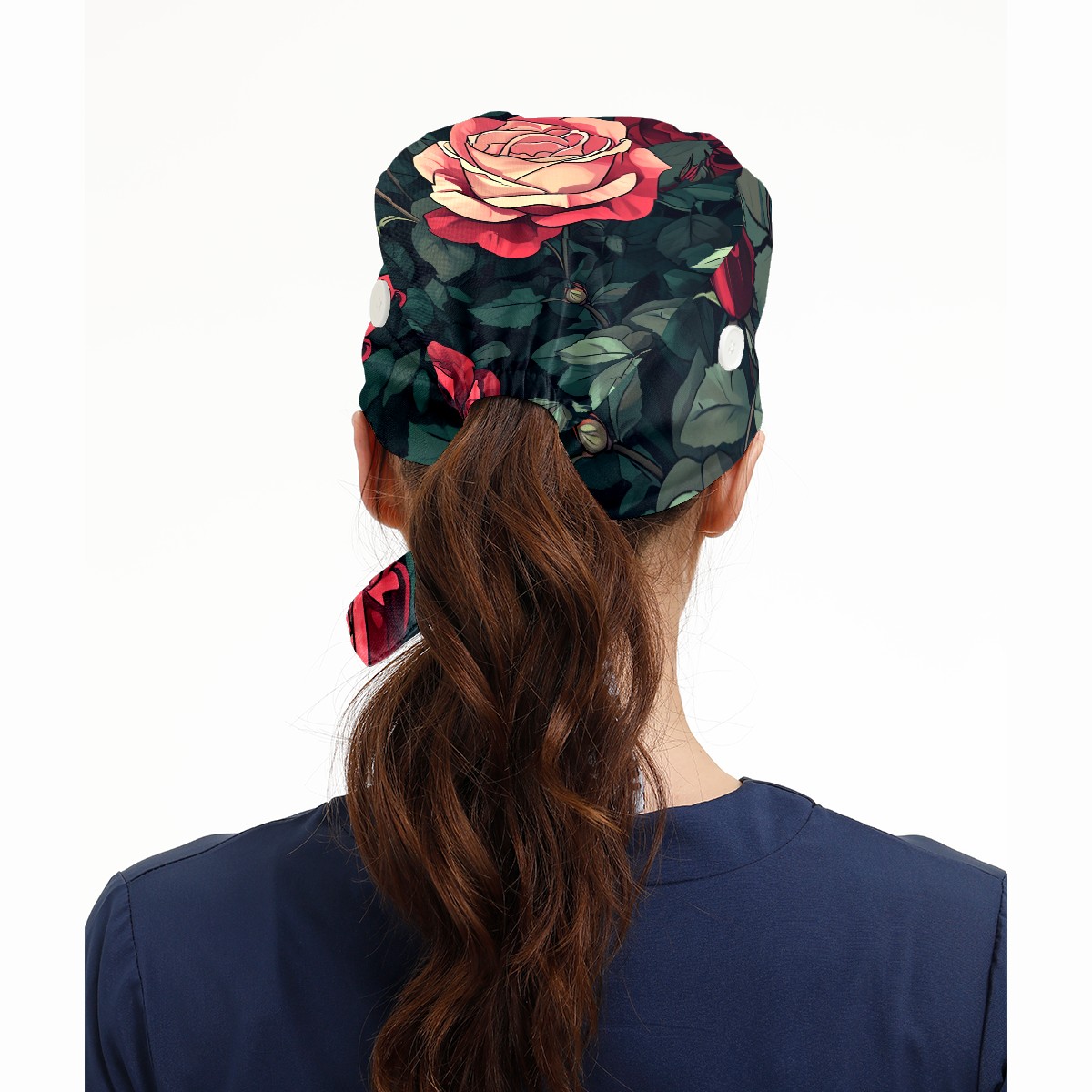 Working Caps with Button&Sweatband Satin Lined Cotton Adjustable Nurse Hats Elastic Band Scrub Cap Surgeon Hat Rose Flower