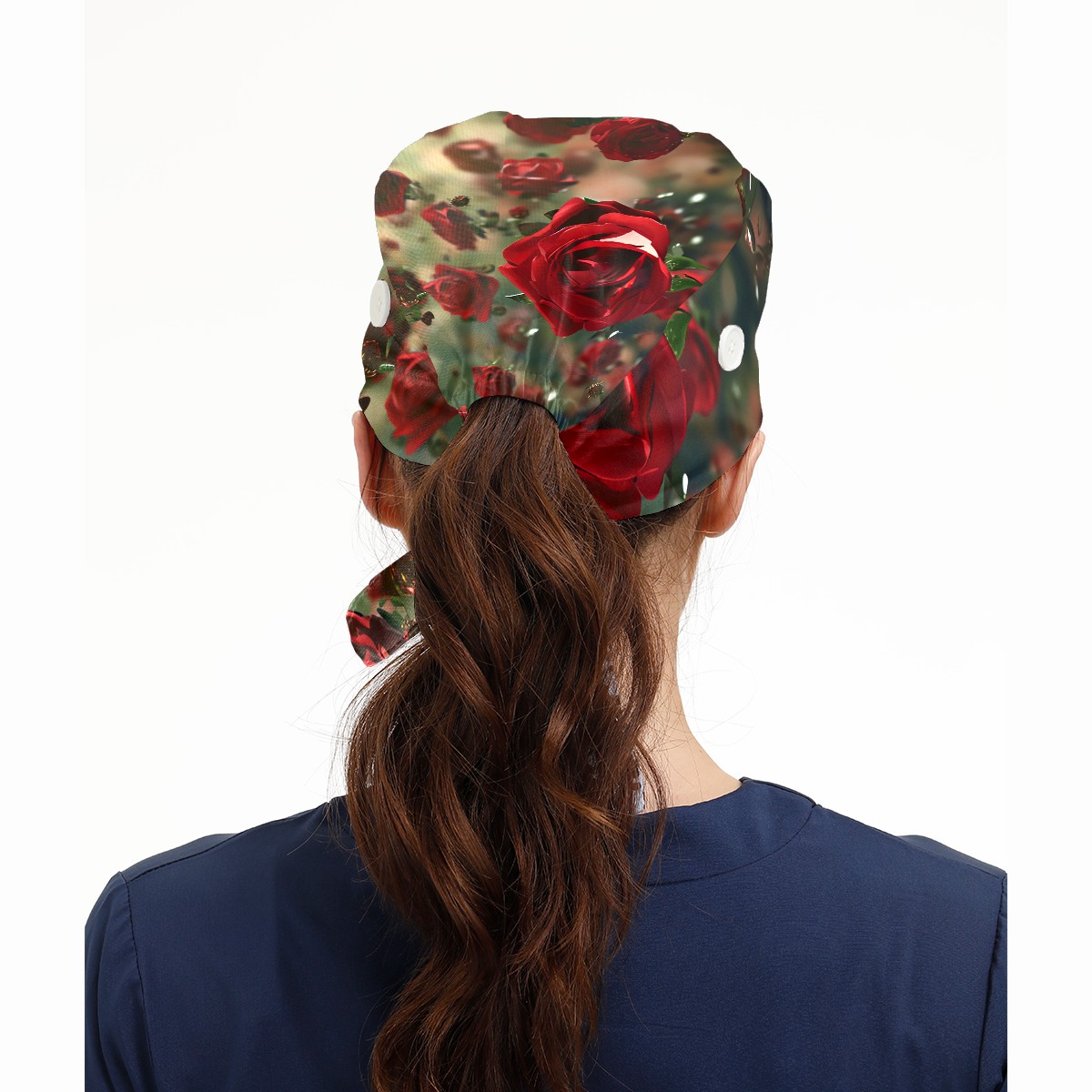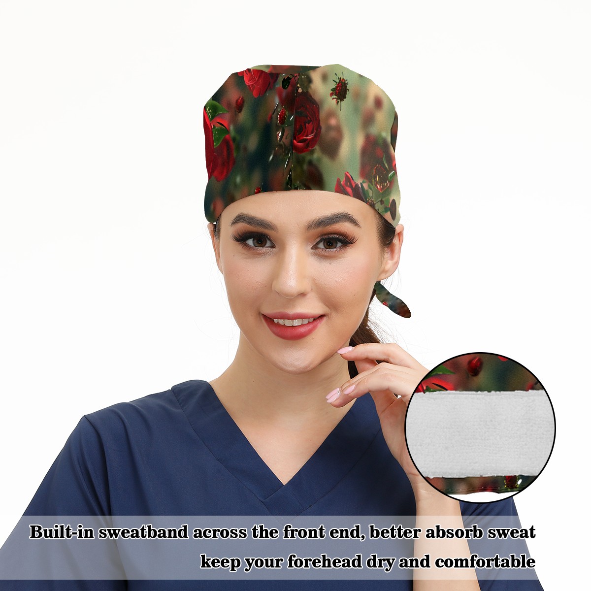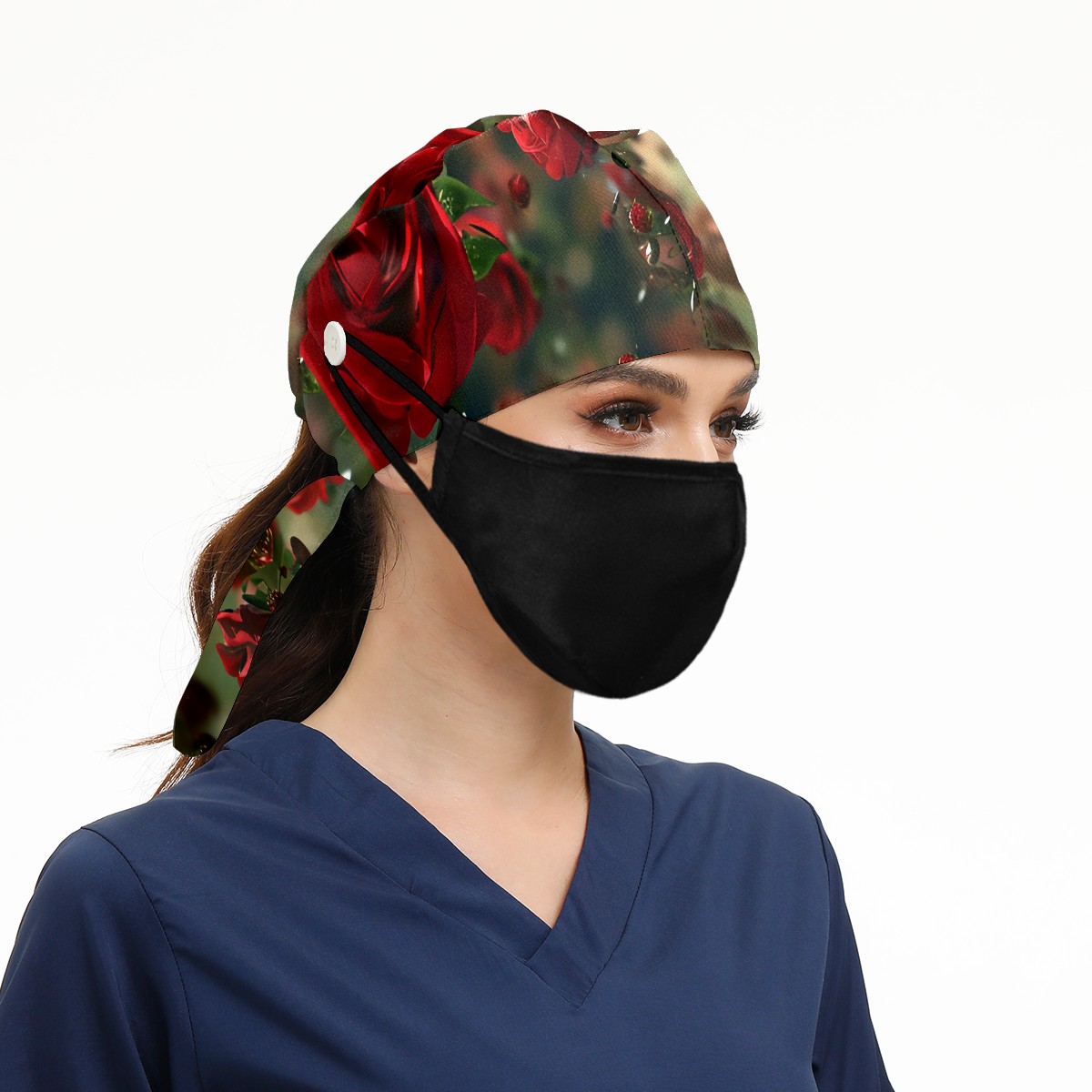 Working Caps with Button&Sweatband Satin Lined Cotton Adjustable Nurse Hats Elastic Band Scrub Cap Surgeon Hat Rose Flower B