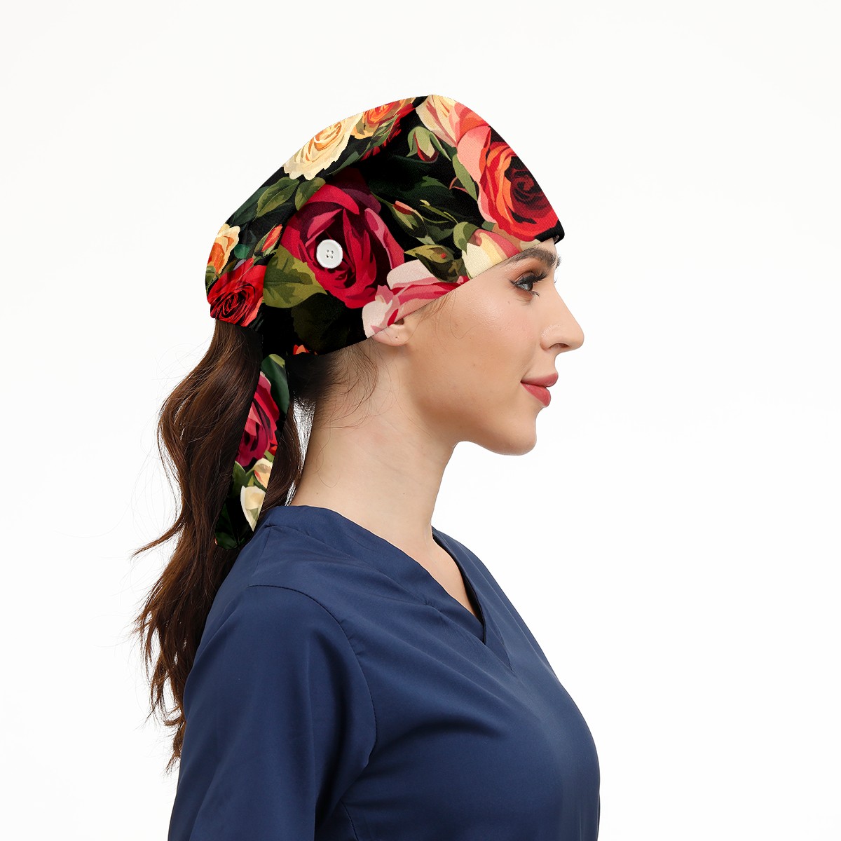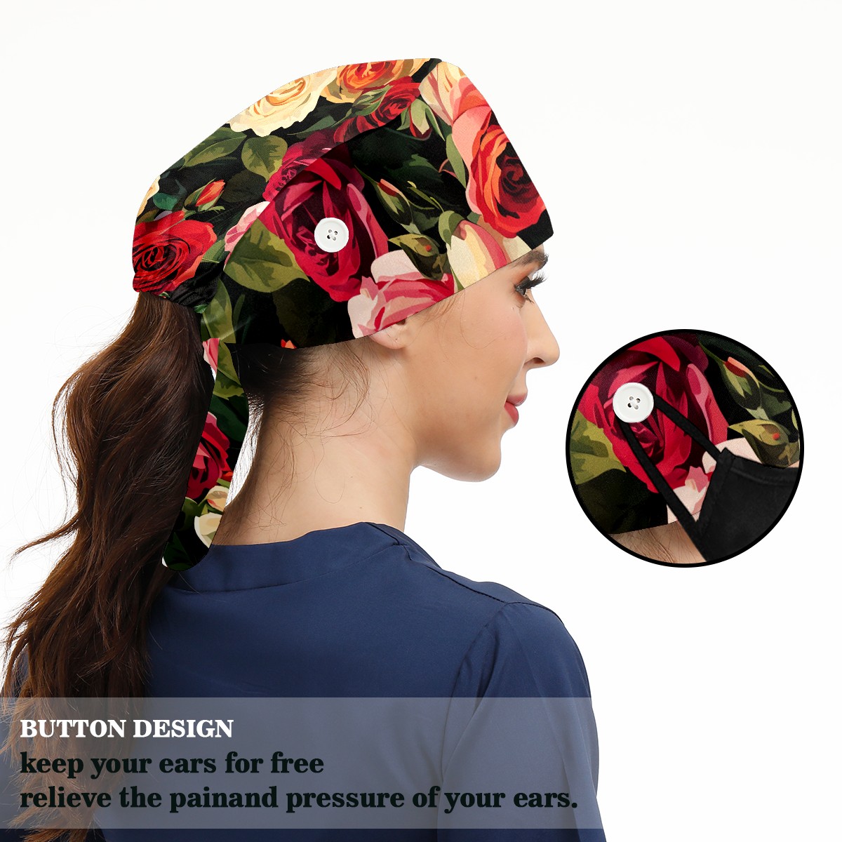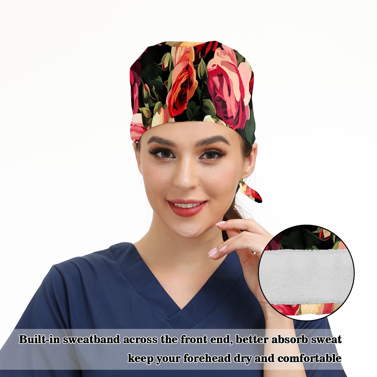 Working Caps with Button&Sweatband Satin Lined Cotton Adjustable Nurse Hats Elastic Band Scrub Cap Surgeon Hat Rugosa Rose B
