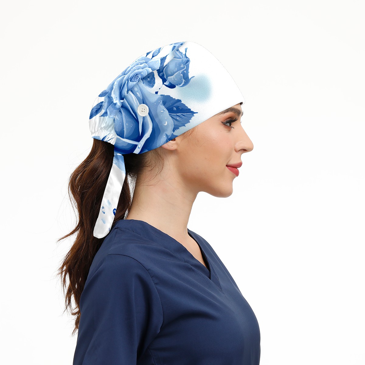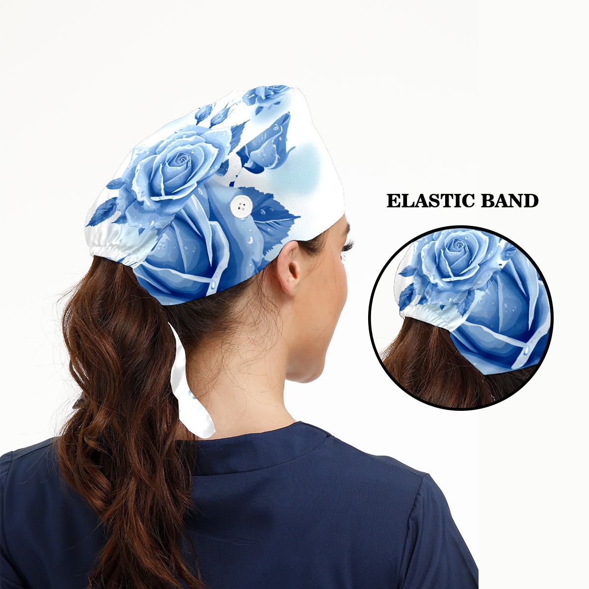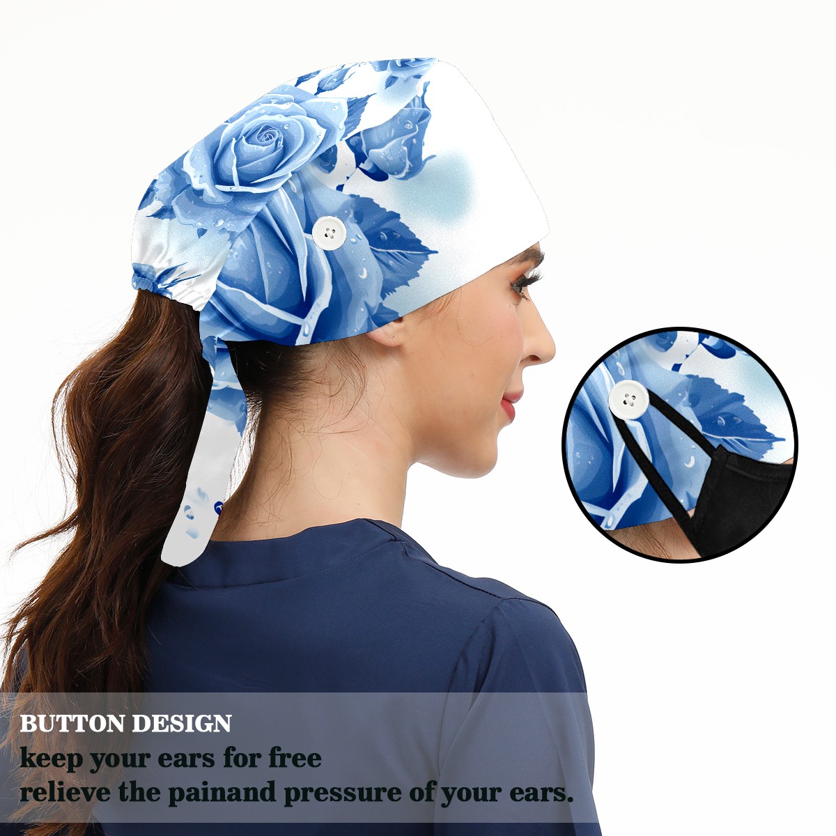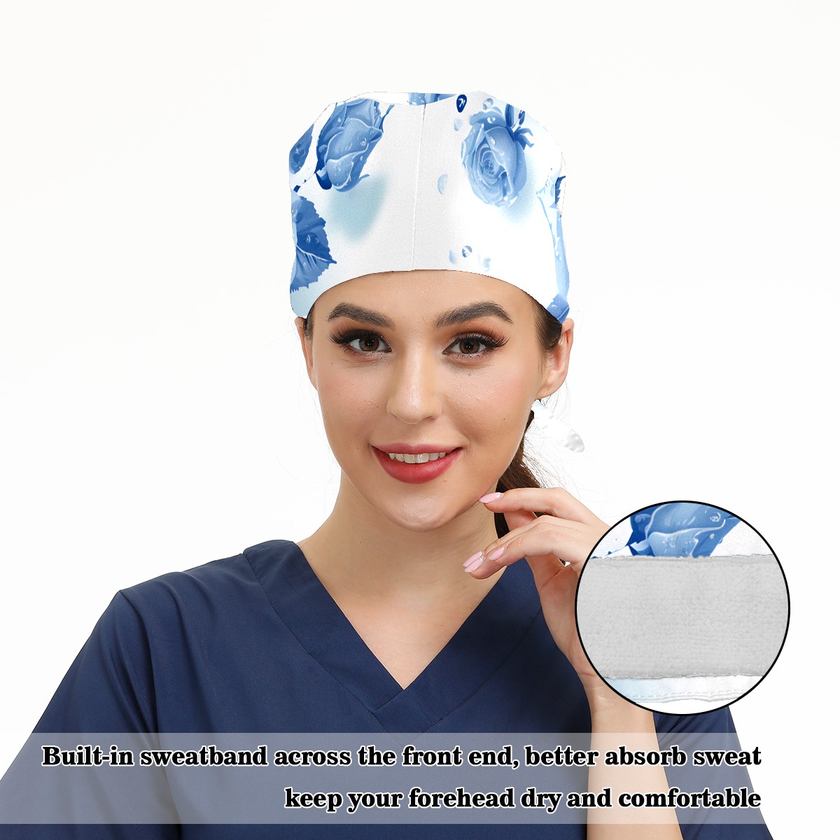 Working Caps with Button&Sweatband Satin Lined Cotton Adjustable Nurse Hats Elastic Band Scrub Cap Surgeon Hat Floral Rose C