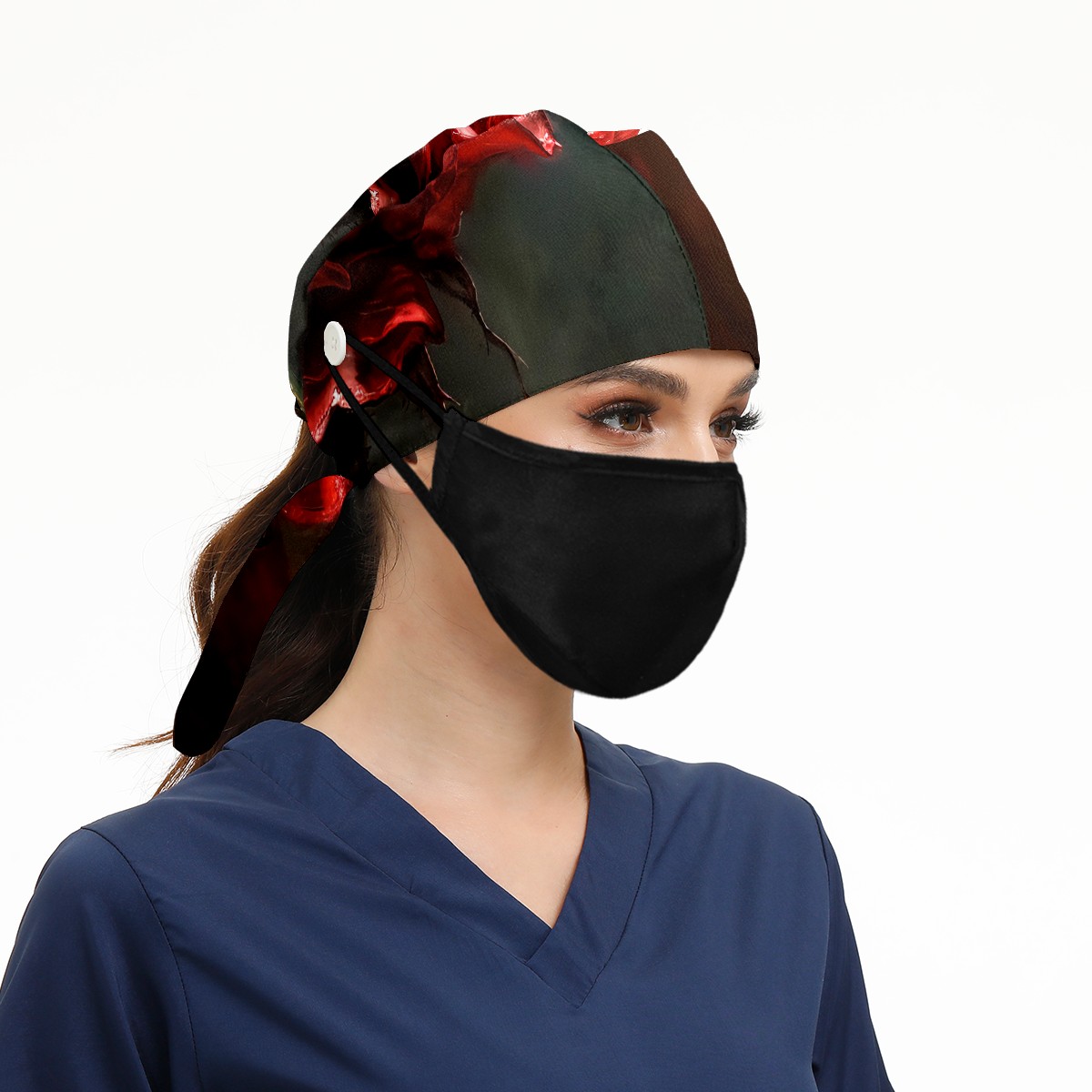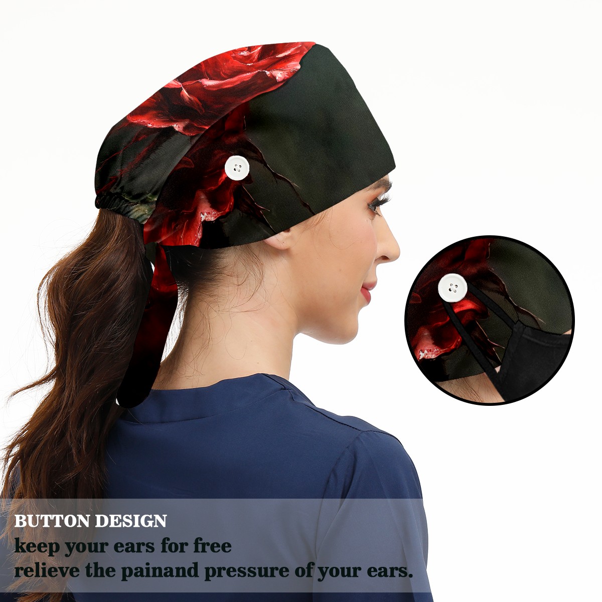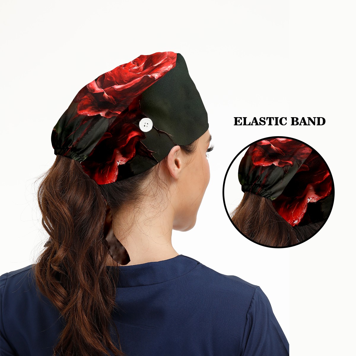 Working Caps with Button&Sweatband Satin Lined Cotton Adjustable Nurse Hats Elastic Band Scrub Cap Surgeon Hat Rose D