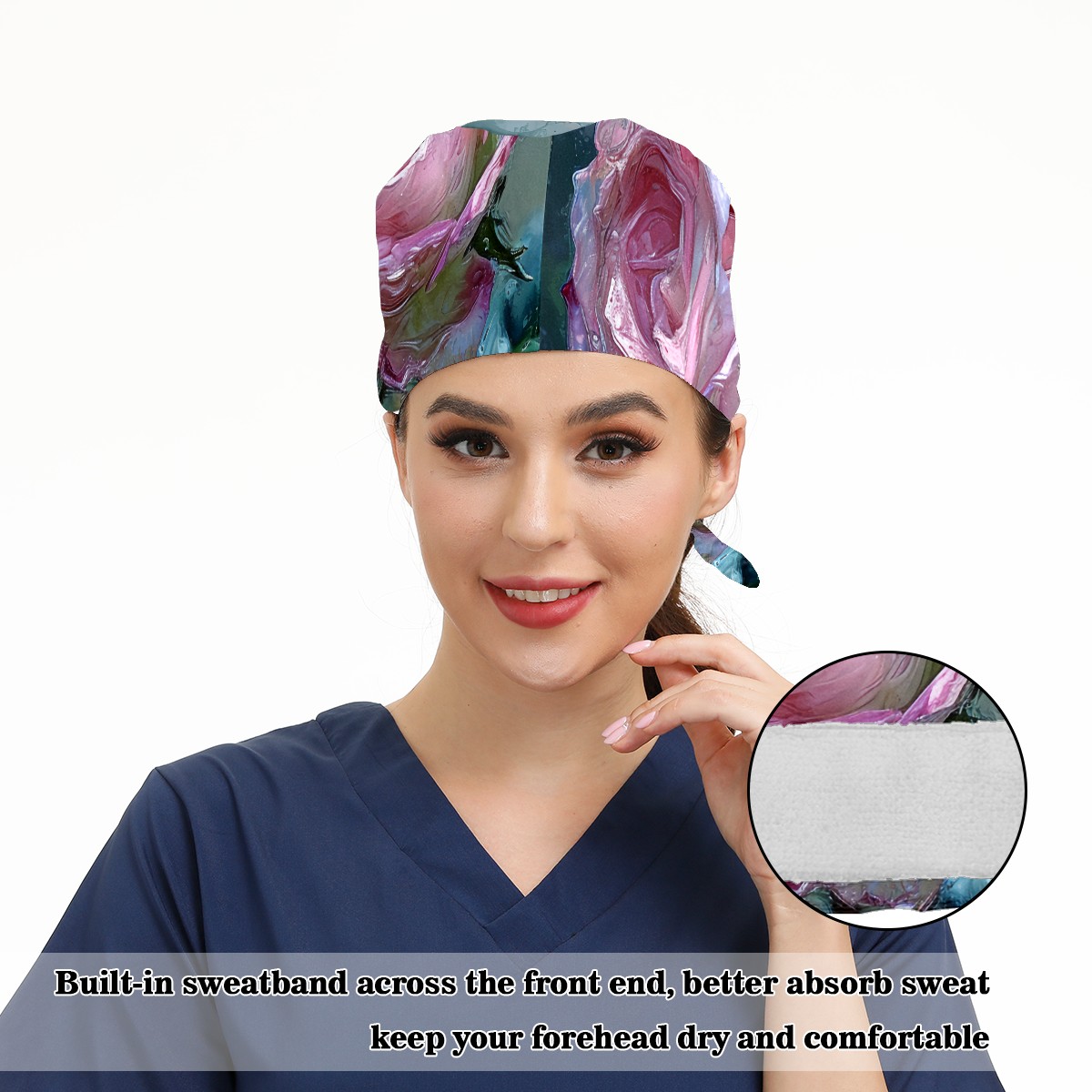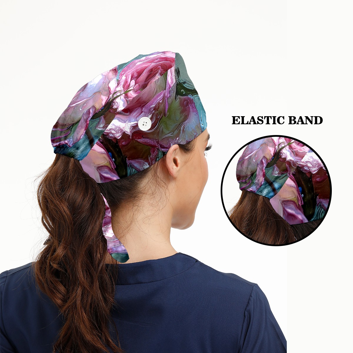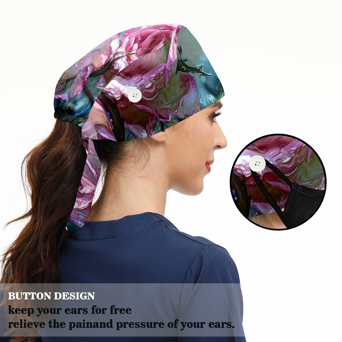 Working Caps with Button&Sweatband Satin Lined Cotton Adjustable Nurse Hats Elastic Band Scrub Cap Surgeon Hat Rose Petal E