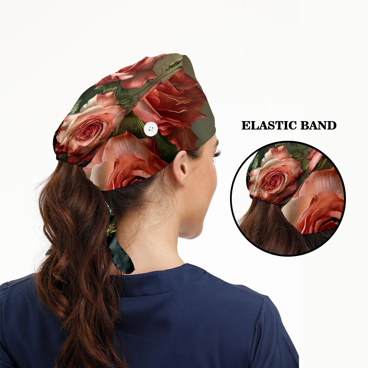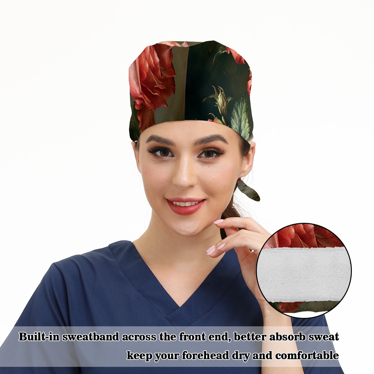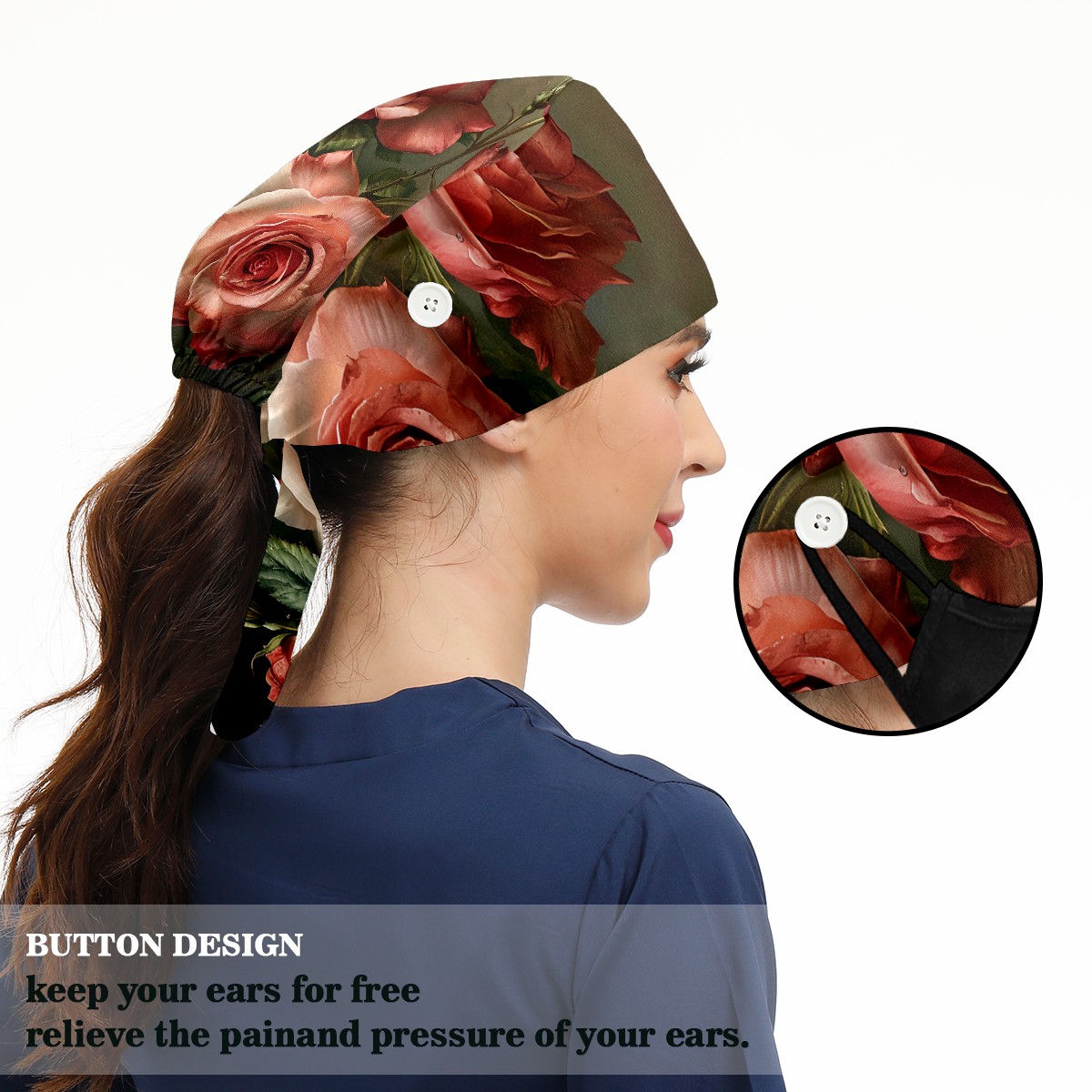 Working Caps with Button&Sweatband Satin Lined Cotton Adjustable Nurse Hats Elastic Band Scrub Cap Surgeon Hat Floral Rose E