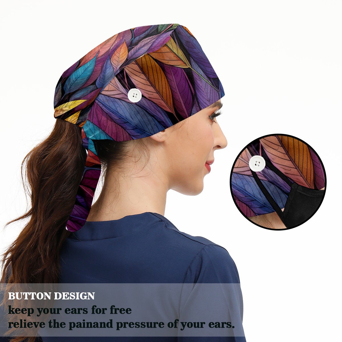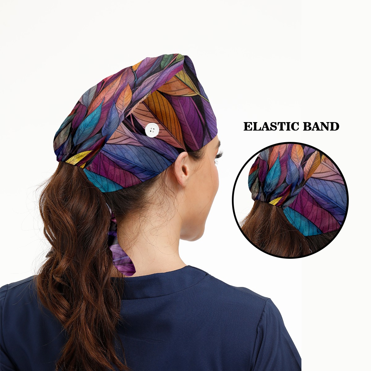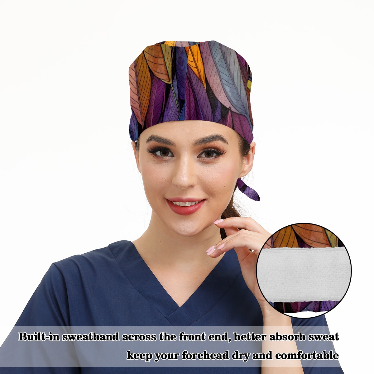 Working Caps with Button&Sweatband Satin Lined Cotton Adjustable Nurse Hats Elastic Band Scrub Cap Surgeon Hat Leaves 10